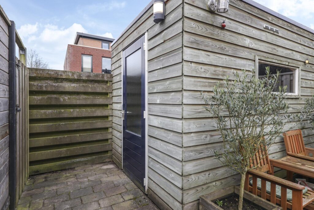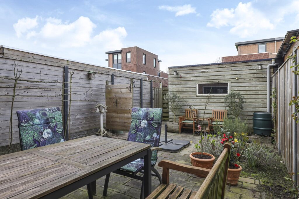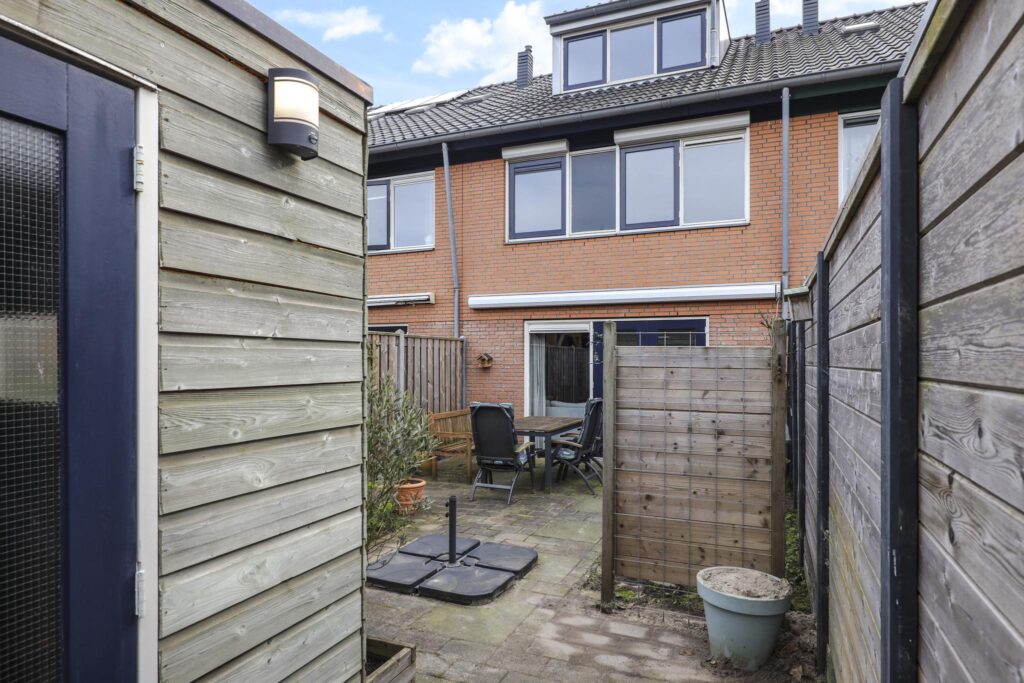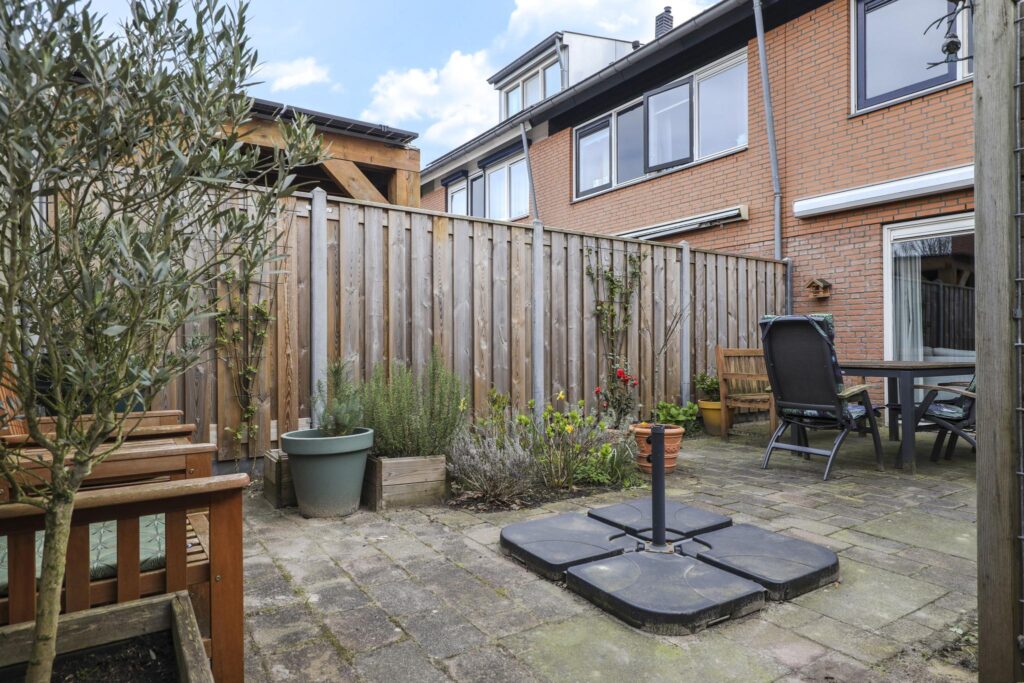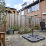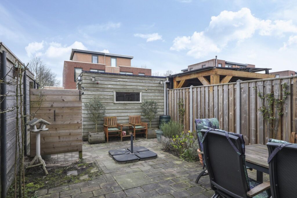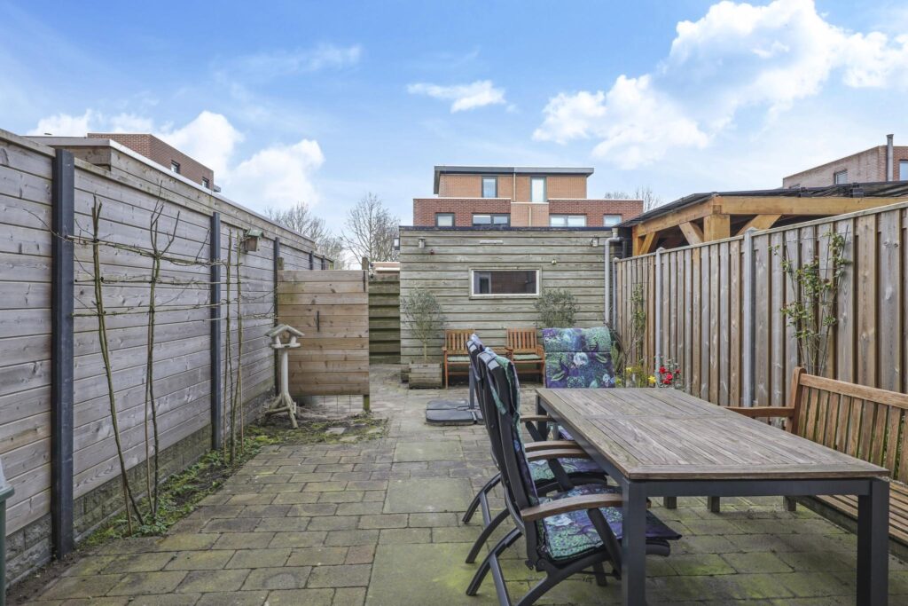 Via de openslaande deuren in de woonkamer is de achtertuin te bereiken. De tuin is bijna 10 meter diep en ruim 5 meter breed en heeft daardoor lekker veel zonnig tuinoppervlak. Doordat het achterpad bij deze woning eindigt, is de tuin bij deze woning iets dieper dan bij de buurwoning. Hierdoor staat de houten fietsenberging meer naar achteren en is de tuin efficiënter te gebruiken. Uiteraard is er nog steeds een handige achterom aanwezig. De tuin is gelegen op het westen en vangt daarmee de gehele dag zon. Een zonwering (uitvalscherm) biedt de mogelijkheid om een schaduwplek te creëren. Achter de tuin staan 2-kappers die nauwelijks inkijk in deze achtertuin hebben. Kortom, een heerlijke tuin met niet te veel onderhoud.