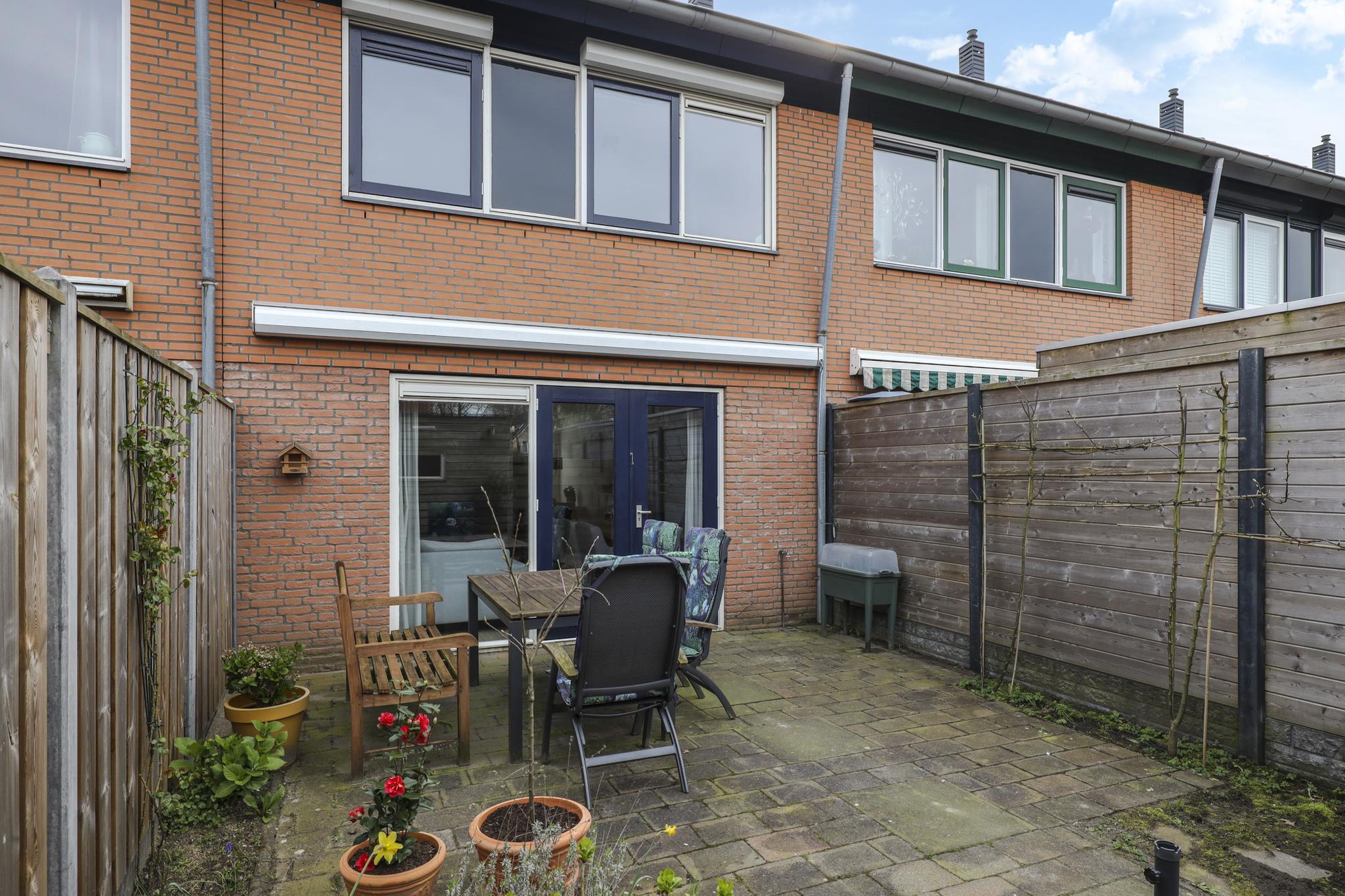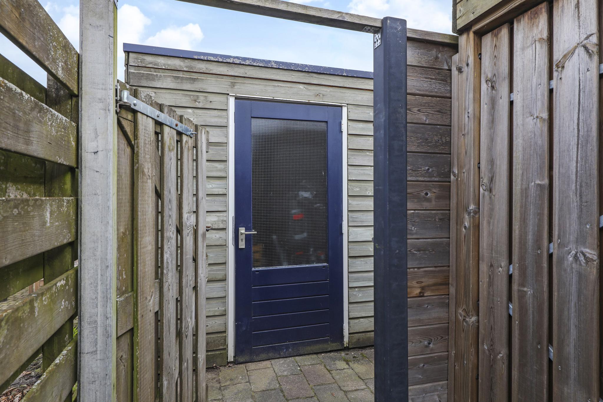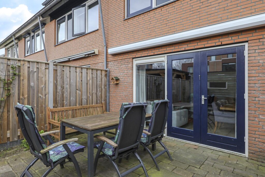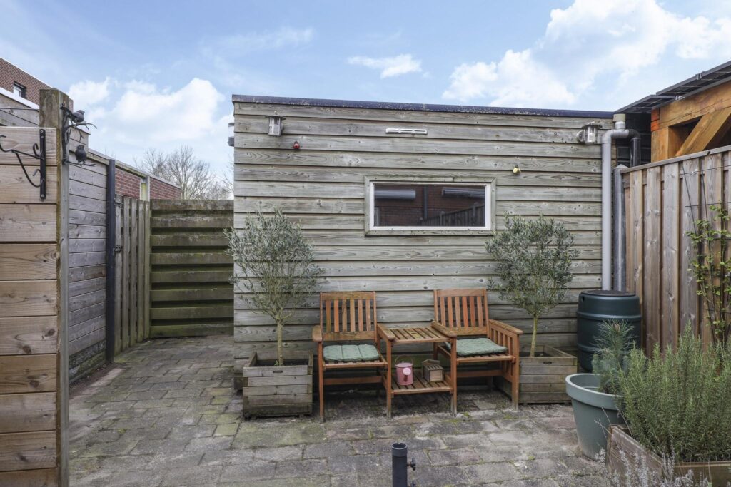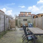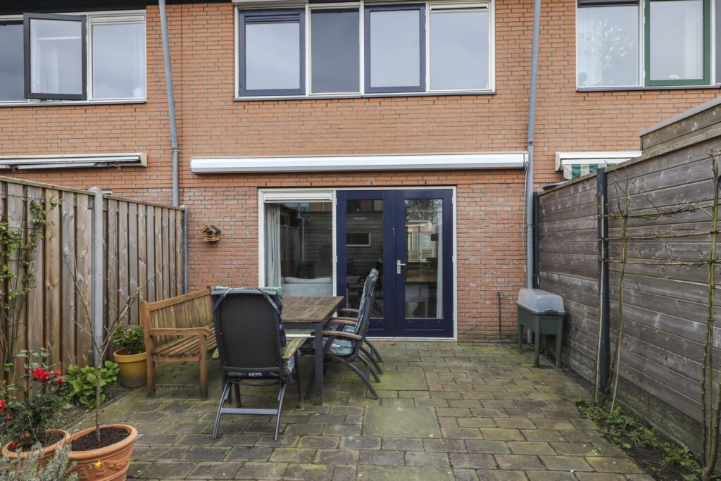 Via de openslaande deuren in de woonkamer is de achtertuin te bereiken. De tuin is bijna 10 meter diep en ruim 5 meter breed en heeft daardoor lekker veel zonnig tuinoppervlak. Doordat het achterpad bij deze woning eindigt, is de tuin bij deze woning iets dieper dan bij de buurwoning. Hierdoor staat de houten fietsenberging meer naar achteren en is de tuin efficiënter te gebruiken. Uiteraard is er nog steeds een handige achterom aanwezig. De tuin is gelegen op het westen en vangt daarmee de gehele dag zon. Een zonwering (uitvalscherm) biedt de mogelijkheid om een schaduwplek te creëren. Achter de tuin staan 2-kappers die nauwelijks inkijk in deze achtertuin hebben. Kortom, een heerlijke tuin met niet te veel onderhoud.