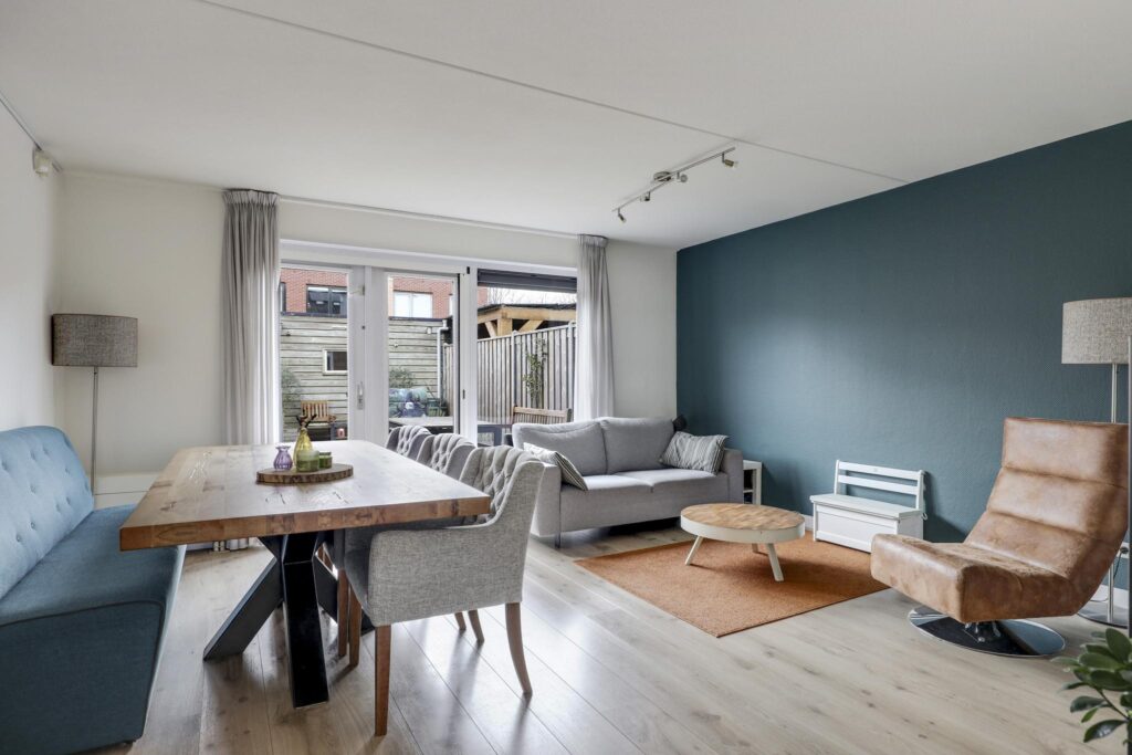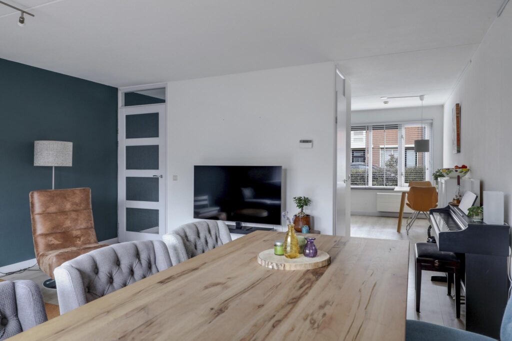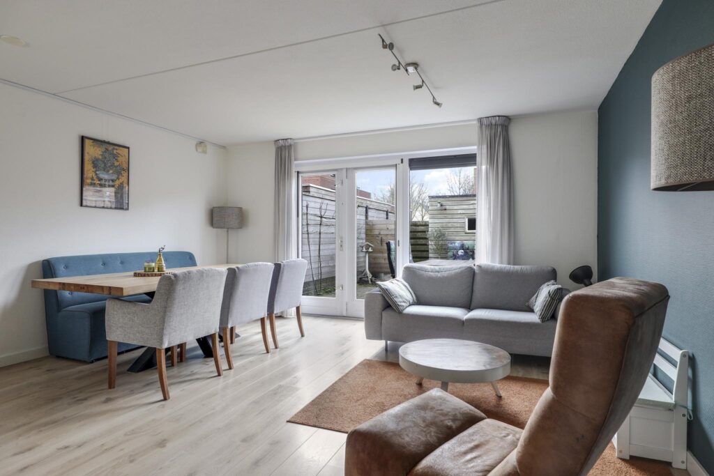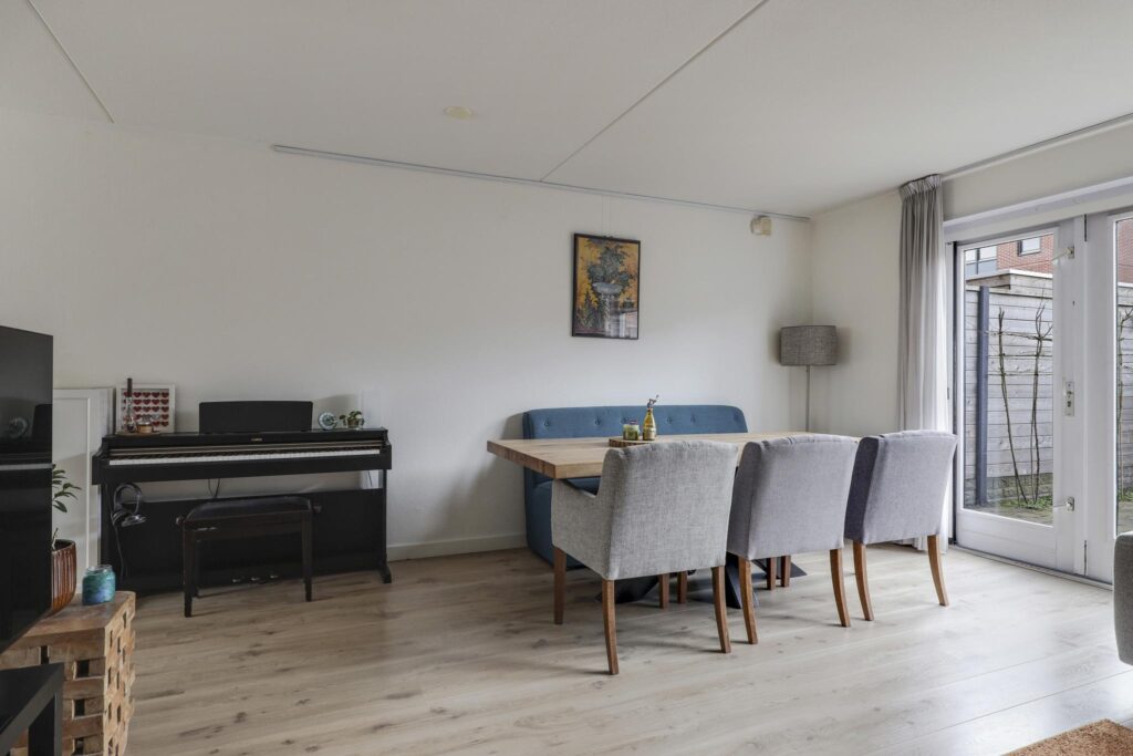 De woonkamer is aan de achterzijde en over de volle breedte van de woning gelegen. Openslaande tuindeuren geven het gemak om het buitenterras eenvoudig bij de leefruimte te betrekken. De grote glaspui tot aan de vloer aan de achterzijde zorgt niet alleen voor veel daglicht (westen), maar ook voor een ruimtelijk gevoel en een vrij gezichtsveld in de achtertuin. De vloer is bekleed met een moderne V-groef laminaatvloer die over de gehele woonlaag is doorgelegd. De tussendeur naar de hal is vervangen door een luxe 4-ruits paneeldeur met glas.