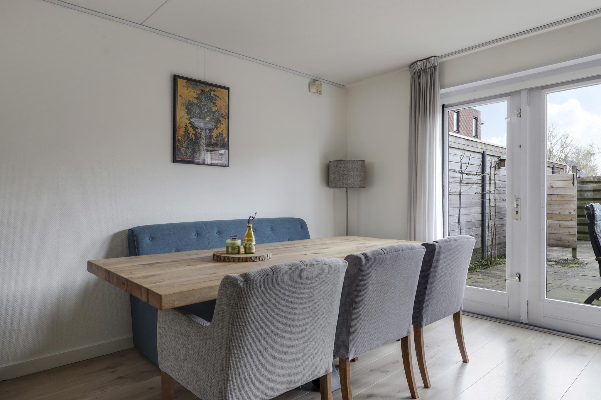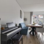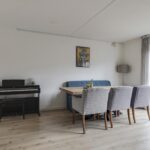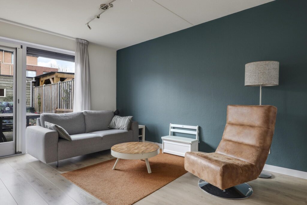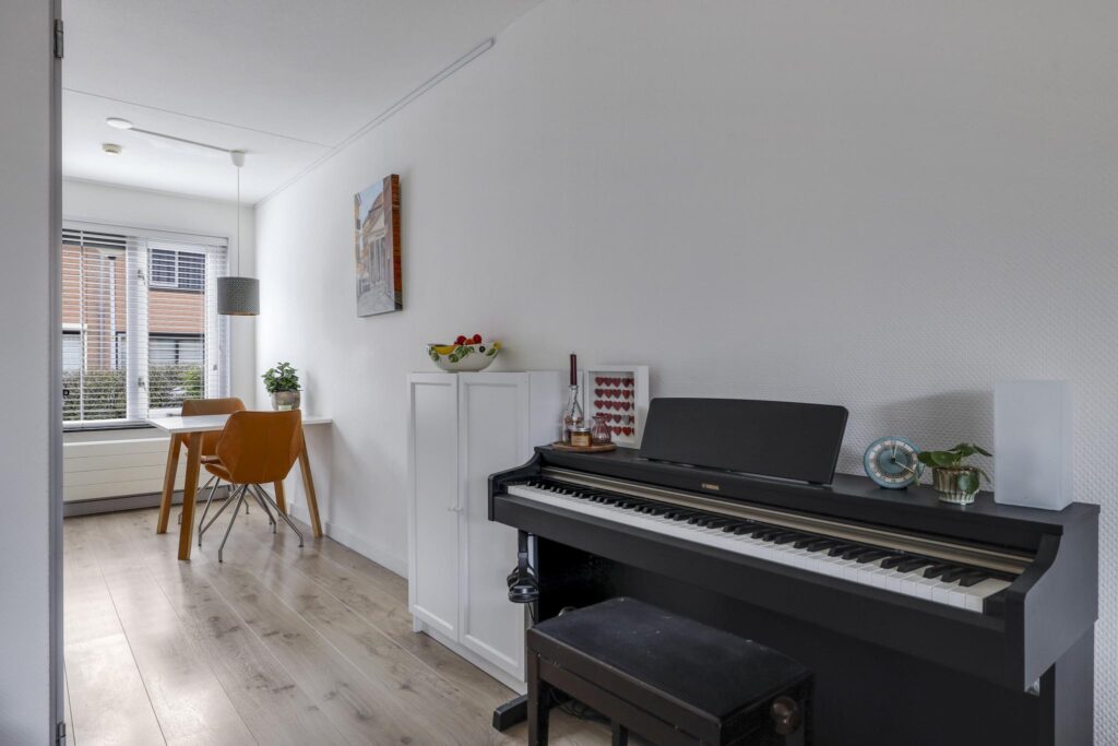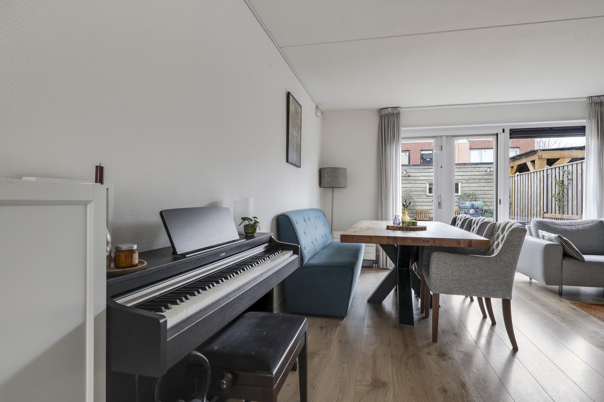 De woonkamer is aan de achterzijde en over de volle breedte van de woning gelegen. Openslaande tuindeuren geven het gemak om het buitenterras eenvoudig bij de leefruimte te betrekken. De grote glaspui tot aan de vloer aan de achterzijde zorgt niet alleen voor veel daglicht (westen), maar ook voor een ruimtelijk gevoel en een vrij gezichtsveld in de achtertuin. De vloer is bekleed met een moderne V-groef laminaatvloer die over de gehele woonlaag is doorgelegd. De tussendeur naar de hal is vervangen door een luxe 4-ruits paneeldeur met glas.
