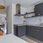 Halfopen keuken v.v. inbouwapparatuur en met praktische trapkast