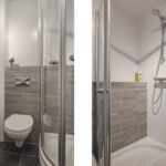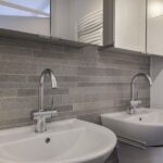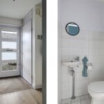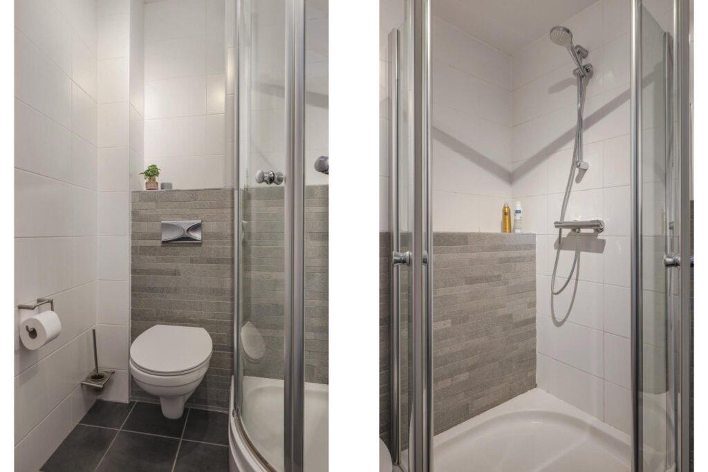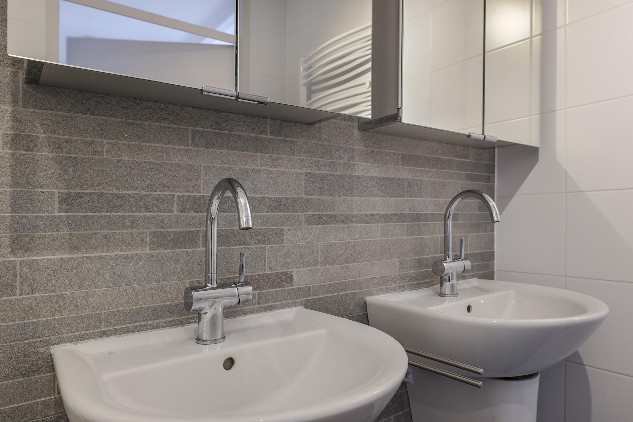 De badkamer is net als de rest van de woning modern afgewerkt. Opvallend is hier het speels gekozen tegelwerk met grote witte wandtegels die afgewisseld worden door smalle, langwerpige grijze wandtegels. De indeling bestaat uit een douchecel, 2e (zwevend) toilet, 2 wastafels en een handdoekradiator. De 2 wastafels geven een luxe gevoel, mede omdat elke wastafel een eigen spiegelkast met verlichting heeft. De mechanische ventilatie zorgt voor een prima ventilatiemogelijkheid.