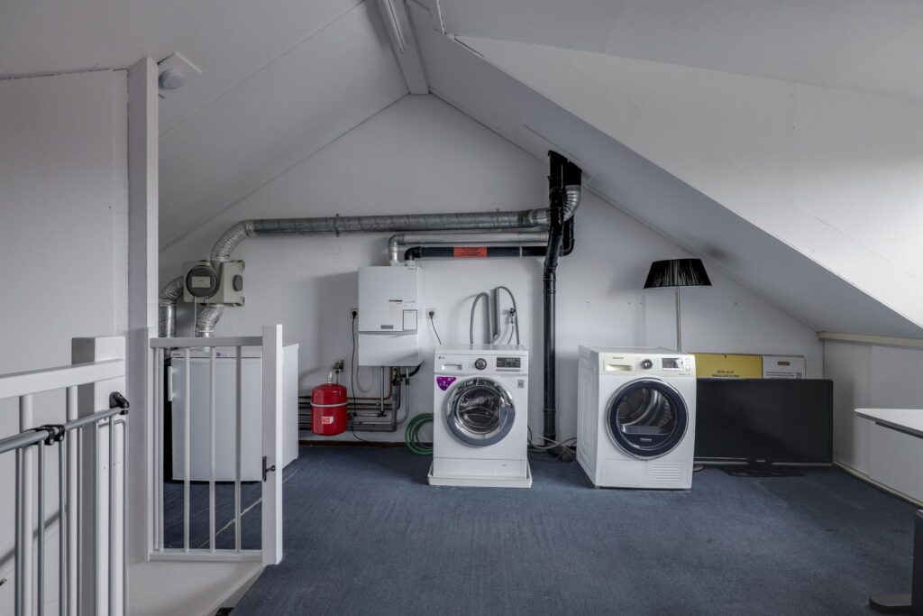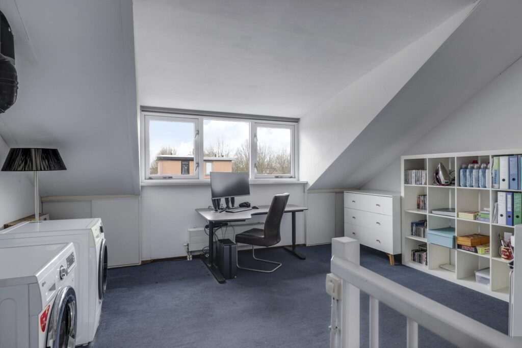 Via een vaste trap is de 2e verdieping bereikbaar. Deze bestaat uit één open ruimte (nokhoogte ca. 2,8m) die voor meerdere doeleinden te gebruiken is. De trap deelt de ruimte in tweeën waardoor er prima een volwaardige 4e slaapkamer te creëren is. Zeker nu er een brede dakkapel (met horren) aan de achterzijde is geplaatst die verrassend veel extra ruimte en daglicht oplevert. Verder is de woonlaag ingedeeld met een wasmachine- en wasdrogeraansluiting en CV-ketelopstelling. Ook vinden we aan beide zijden nog handige knieschot opbergruimte terug.