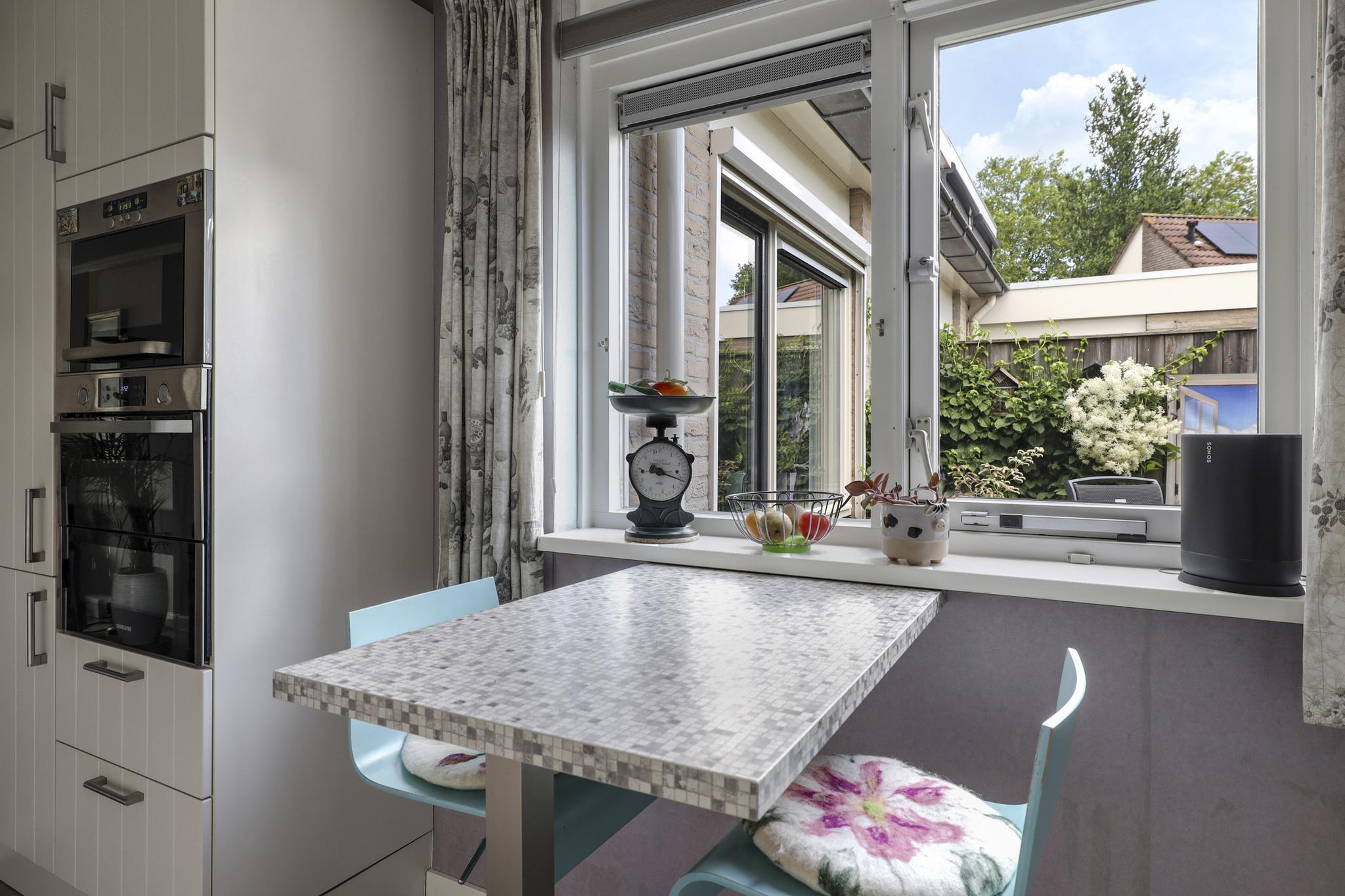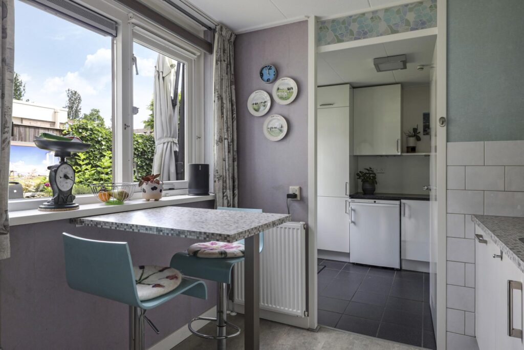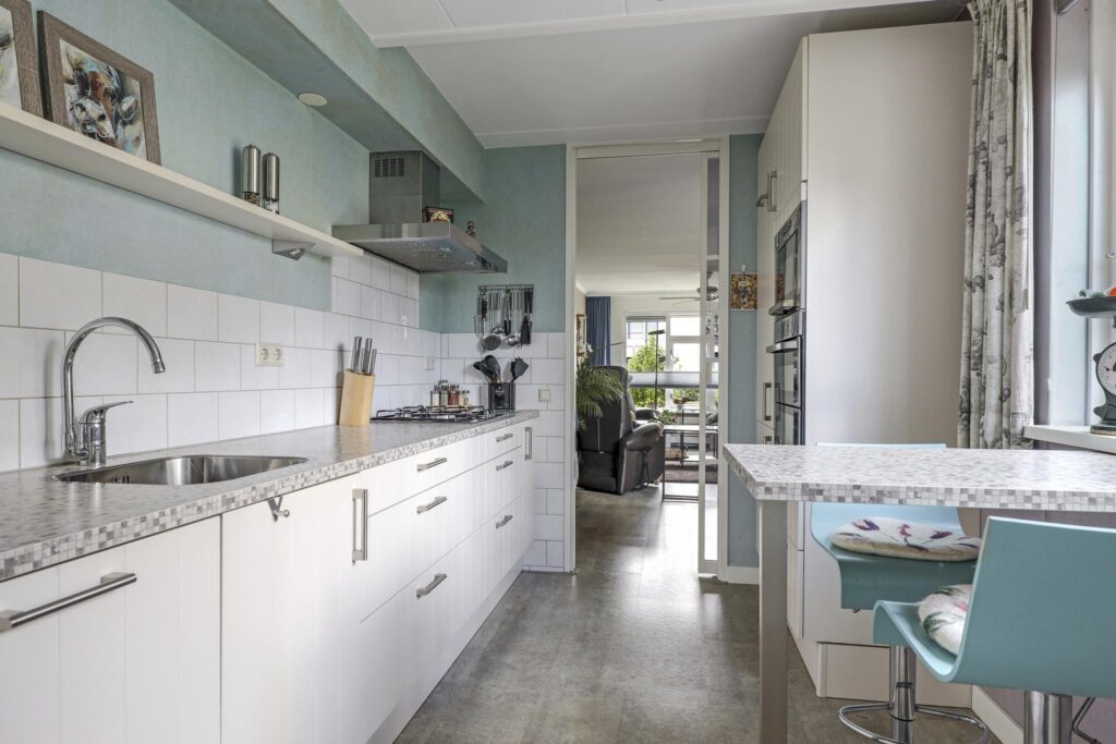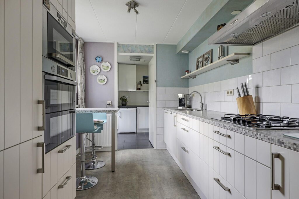 De keuken grenst direct aan de woonkamer maar is af te sluiten met een schuifdeur. De keuken heeft een speelse opstelling met een knusse ontbijtbar voor het raam. De opstelling heeft een moderne uitstraling met brede ladekorven en luxe inbouwapparatuur. Denk daarbij aan een vaatwasser (met liftlade), een 4-pits gaskookplaat met afzuigschouw erboven, een magnetron en een ‘dubbele’ heteluchtoven. De liftlade van de vaatwasser is ideaal omdat je niet zover door de knieën hoeft te gaan. De oven kun je zowel in zijn geheel of de helft gebruiken. Kortom, deze keuken is van alle gemakken voorzien.