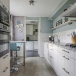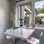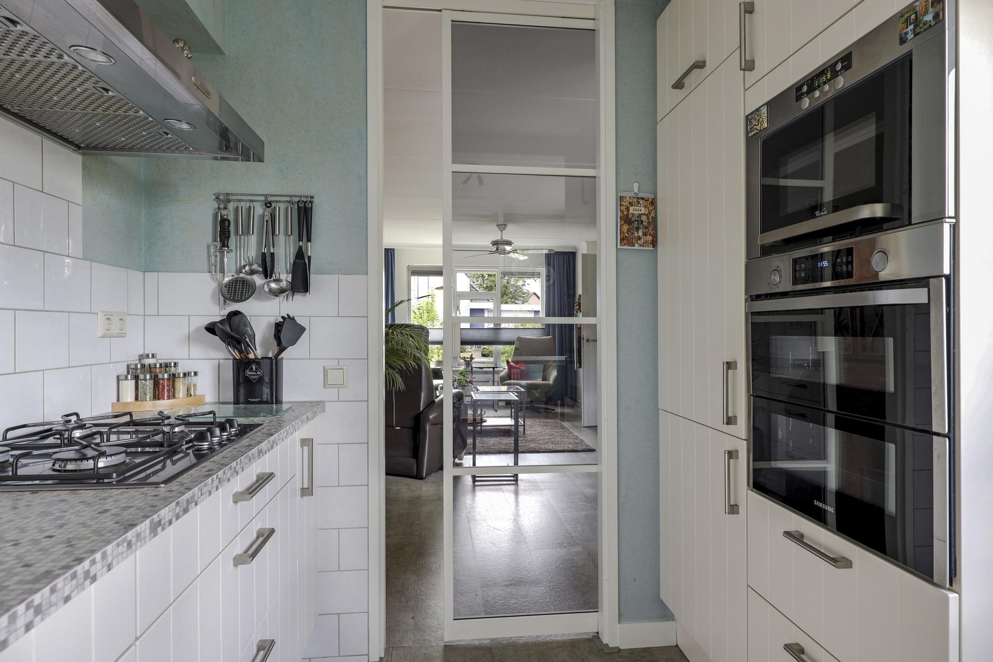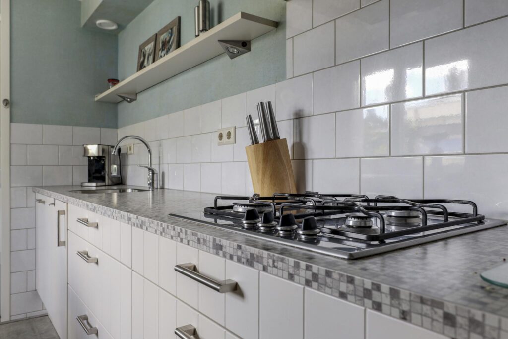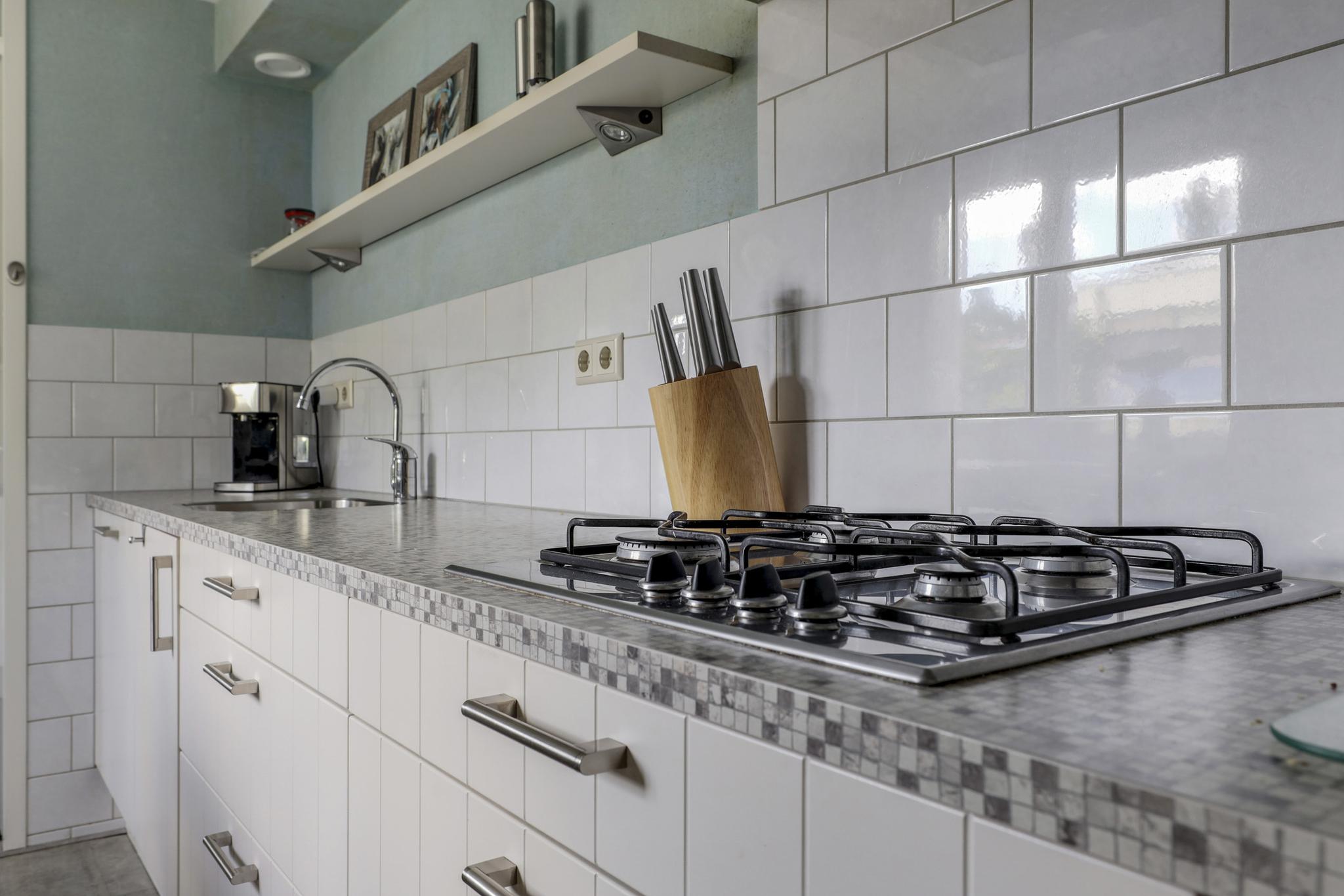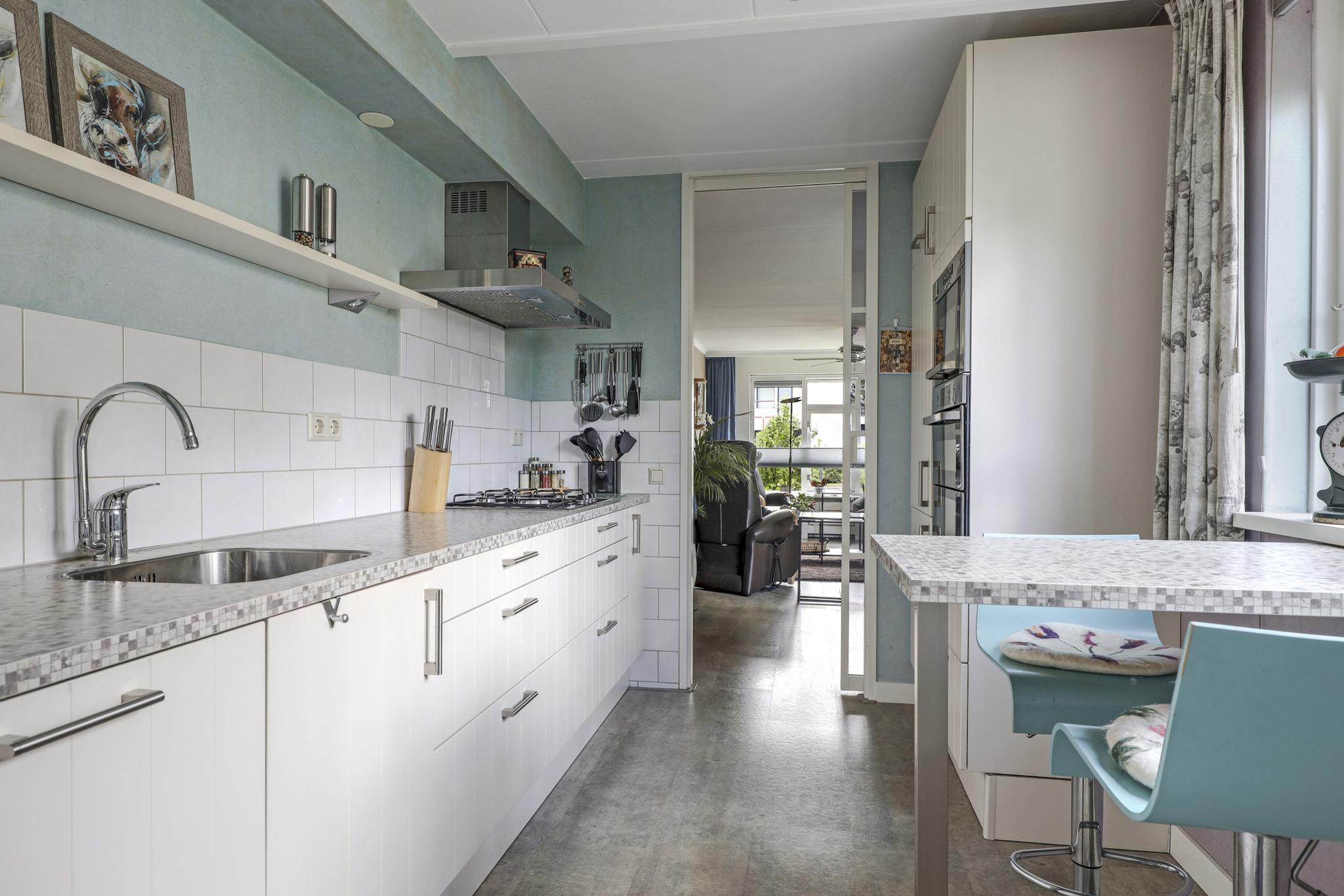 De keuken grenst direct aan de woonkamer maar is af te sluiten met een schuifdeur. De keuken heeft een speelse opstelling met een knusse ontbijtbar voor het raam. De opstelling heeft een moderne uitstraling met brede ladekorven en luxe inbouwapparatuur. Denk daarbij aan een vaatwasser (met liftlade), een 4-pits gaskookplaat met afzuigschouw erboven, een magnetron en een ‘dubbele’ heteluchtoven. De liftlade van de vaatwasser is ideaal omdat je niet zover door de knieën hoeft te gaan. De oven kun je zowel in zijn geheel of de helft gebruiken. Kortom, deze keuken is van alle gemakken voorzien.