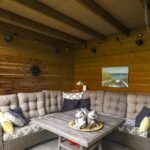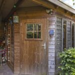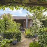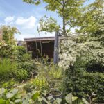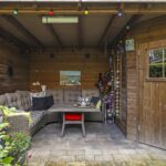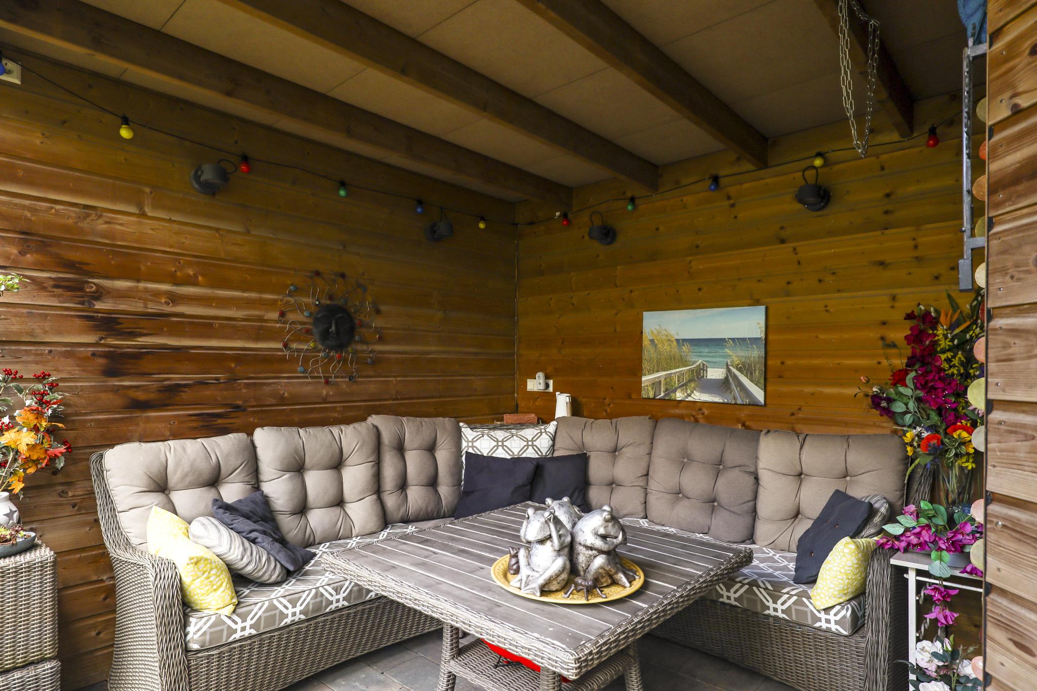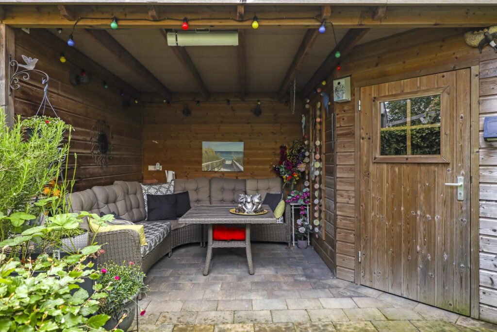 Achterin de tuin is een veranda en een tuinhuis bijgebouwd. De veranda biedt een heerlijke, beschutte zitplek waar je met name in de namiddag en avonduren veel zonuren hebt. Hier kun je het gehele jaar je tuinset buiten laten staan.