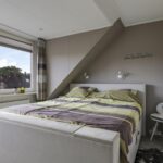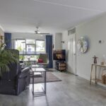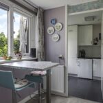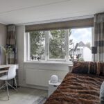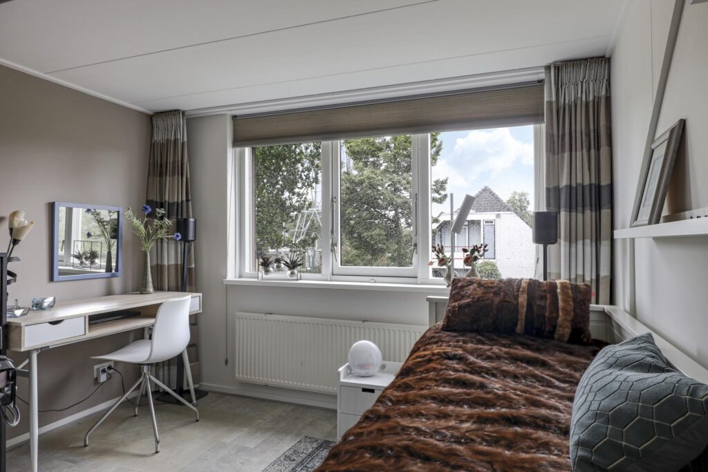Opvallend is het verzorgde afwerkingsniveau. Op de vloer is een kurklaminaat (met hoge plint) gelegd en de wanden zijn strak afgewerkt met scanbehang. Hierdoor zijn de wanden ideaal in de gewenste kleur te sausen. Een ander pluspunt zijn de wandcontactdozen die niet alleen zijn uitgebreid, maar ook zijn verlaagd naar enkelhoogte. De radiator is keurig in een ombouw weggewerkt. Praktische zaken als nieuw HR++ beglazing met ventilatieroosters mogen zeker niet vergeten worden. En kijk je door het raam naar buiten, dan zie je ook bomen en een groenstrook voor de deur. Overigens is het raam aan de voorzijde geheel af te sluiten met een rolluik. Het raam aan de tuinzijde is voorzien van een screen (zonwering).