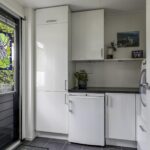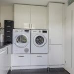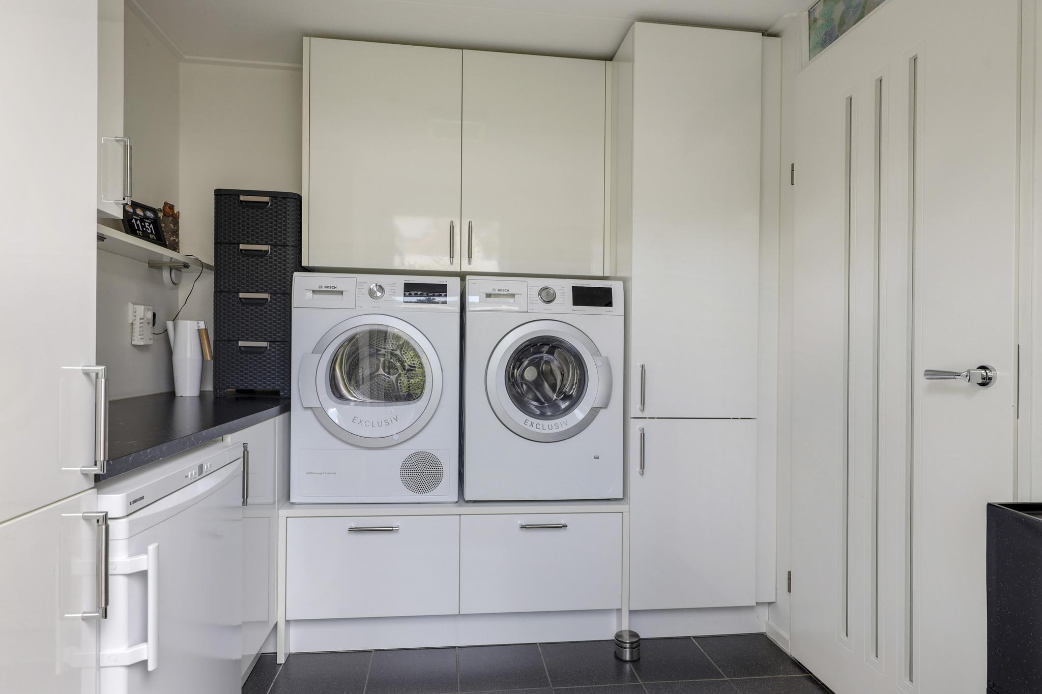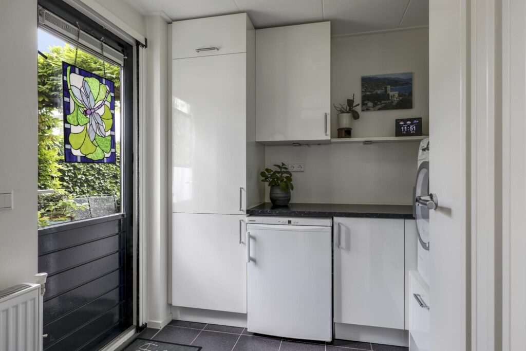 Het comfort gaat verder in de bijkeuken. Deze ruimte is optimaal ingericht met o.a. een werkkast voor schoonmaakspullen en voorraadkasten. Ook is de CV-ketel achter één van de deurtjes te vinden. Het extra werkblad is ideaal wanneer je bijvoorbeeld een verjaardag hebt. Tevens zijn zowel de wasmachine en wasdroger op hoogte geplaatst. ‘Gemak dient te mens’ zullen we maar zeggen. Vanuit de bijkeuken bereik je de achtertuin waarbij de tuindeur is voorzien van een rolhor.