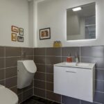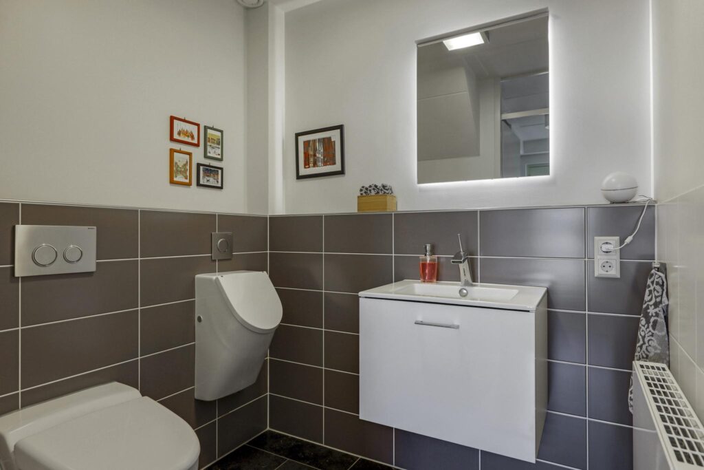 Het toilet krijgt van ons niet zo vaak een eigen alinea. Echter, in deze woning kun je een heel bijzonder toilet verwachten. Vaak is het het ‘kleinste kamertje’ in huis, maar hier is het toilet helemaal niet zo klein. Het betreft immers de voormalige badkamer. Er is dankbaar gebruik gemaakt van de ruimte door er zowel een zwevend wandcloset als een urinoir te plaatsen. Ook is er een volwaardig wastafelmeubel met spiegel geplaatst. Noemenswaardig zijn alle functies die het toilet te bieden heeft. Het toilet kun je namelijk op afstand bedienen ten behoeve van spoeling en massagestralen. Je moet het maar bedenken…