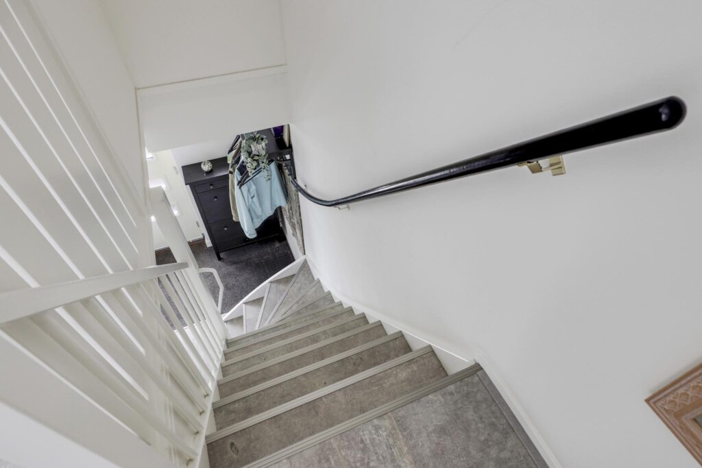 Dezelfde laminaatvloer van kurk die op de begane grond ligt, loopt ook door op de 1e verdieping en zelfs op de trap. Een éénduidiger afwerkingsniveau van vloeren kun je je niet bedenken.