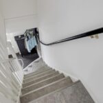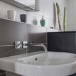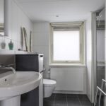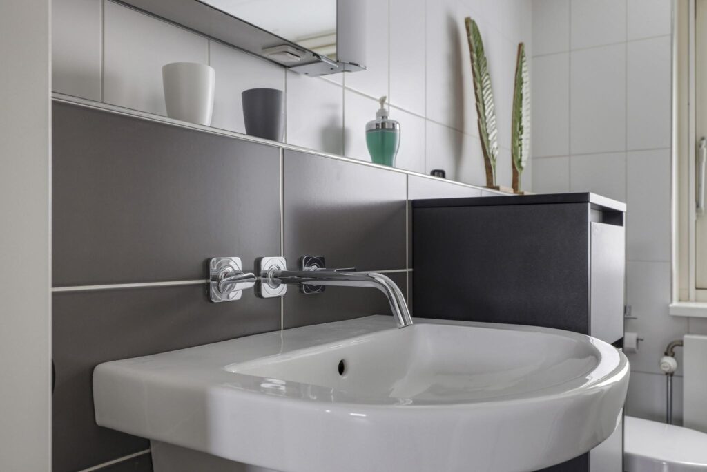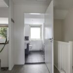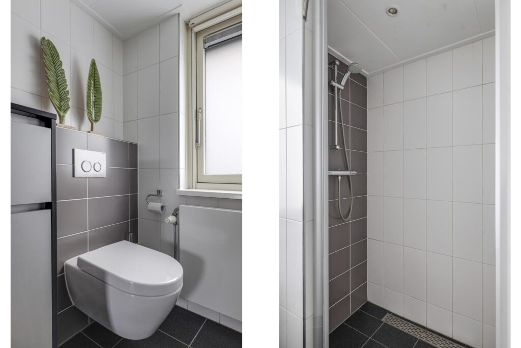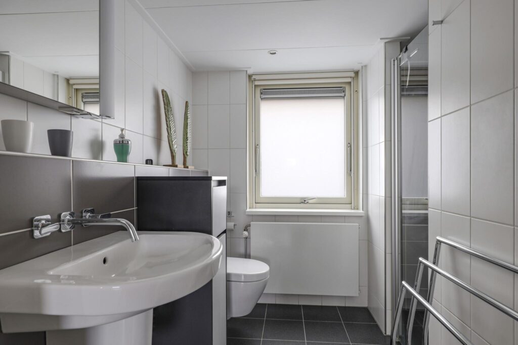 De badkamer maakt deze woonlaag compleet. De ruimte is ingedeeld met een inloopdouche met glazen deur (en drainafvoer), een 2e zwevend wandcloset en een wastafel met spiegelkast v.v. verlichting. Naast de wastafel is nog een kolomkast geplaatst waar je de nodige toiletspullen kunt opbergen. Mooi detail is de kraan met afzonderlijke ‘draaihendels’ uit de muur. Een raam (met rolhor) zorgt niet alleen voor de ideale ventilatiemogelijkheid, maar ook voor een prettige lichtinval. Het neutrale en moderne tegelwerk is gelijk aan die van het toilet op de begane grond. Ook dit draagt weer bij aan een éénduidig geheel. Om het af te maken zijn er inbouwspots in het plafond aangebracht.