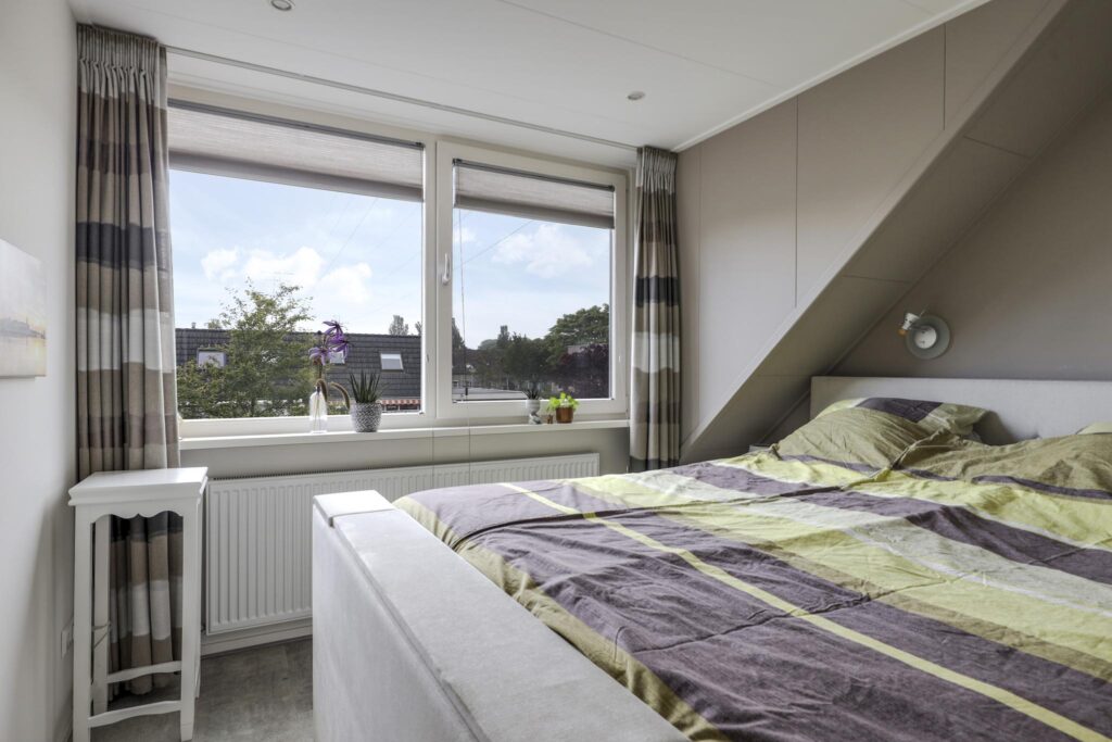 De 1e verdieping is opgedeeld in 2 slaapkamers, een heuse walk-in-closet en de badkamer. De slaapkamers zijn beiden royaal te noemen en respectievelijk 13m2 en 10m2 groot. Hierdoor kun je kiezen waar je een 2-persoonsbed neerzet. De slaapkamer aan de achterzijde is aanzienlijk vergroot door een maximaal brede dakkapel. Deze kunststof dakkapel is voorzien van draai/kiepramen en inzethorren waardoor je optimaal kunt ventileren. Deze dakkapel loopt door tot in de walk-in-closet naast de slaapkamer. Zowel de voor- als achterzijde zijn voorzien van elektrisch bedienbare rolluiken (voorzijde via een app te bedienen) waardoor je de kamers 100% kunt verduisteren. Beide slaapkamers zijn voorzien van data-aansluitingen.
