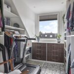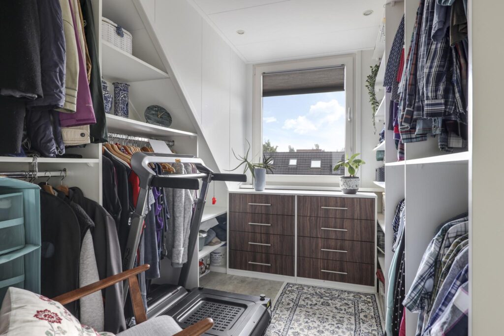 Walk-in-closet met kastenverdeling en doorlopende dakkapel