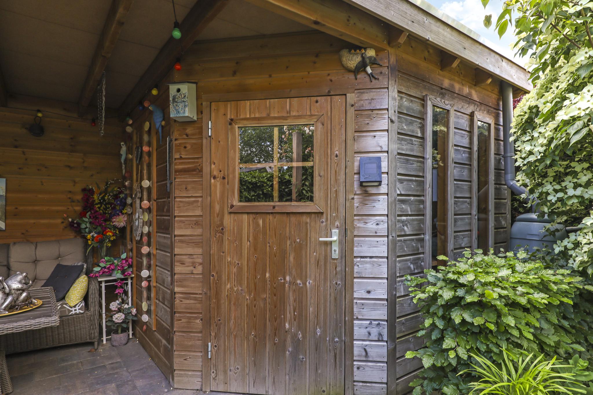 Onder hetzelfde dak is tevens een tuinhuis gebouwd. Handig om het nodige tuingereedschap op te bergen en meerdere fietsen te stallen. In de schuur is er een poort (achterom) die aansluit op het achtergelegen gangpad. Uiteraard hebben zowel de veranda als schuur ook elektra-aansluiting.