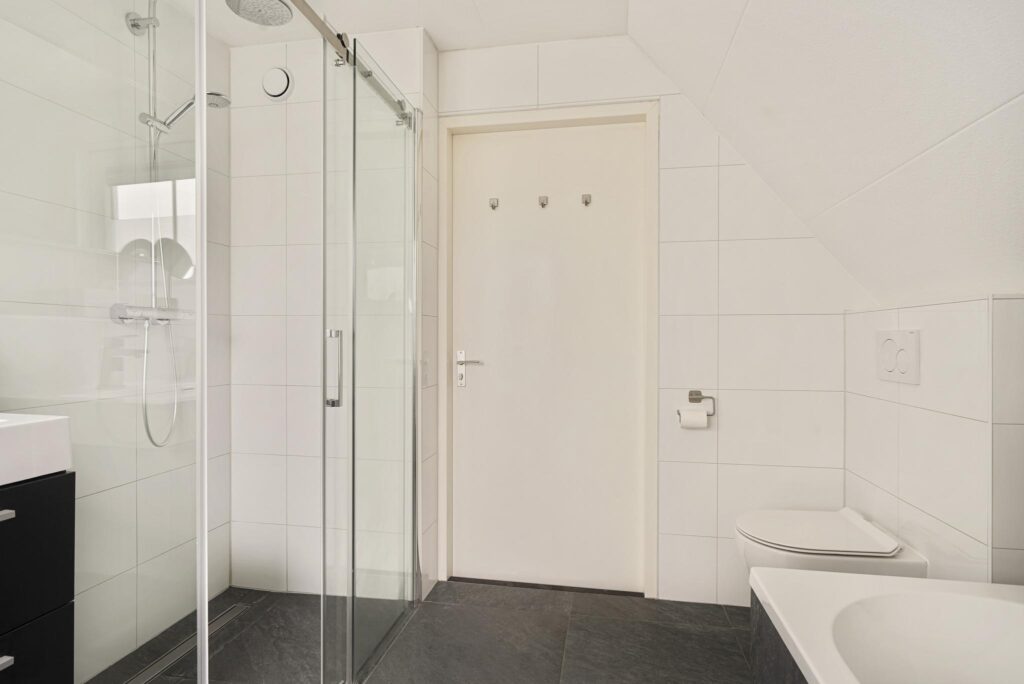 De badkamer valt zeker niet uit de toon wat betreft luxe en comfort. Er is goed nagedacht over de ruimte voordat de badkamer opnieuw werd ingedeeld. Op die manier was er plaatst voor al het wenselijke sanitair zoals een brede inloopdouche, een diep ligbad, een 2e wandcloset en een 2-persoons wastafelmeubel. Wat meteen opvalt is het verzorgde en neutrale tegelwerk (groot formaat tegels) op vloer en wanden. Details als een rainshower, een extra handdouche (Grohe) en een drainafvoer maken de douche compleet. Het wastafelmeubel heeft brede ladekorven waar je veel toiletspullen in kwijt kunt. Boven het meubel is een grote spiegel geplaatst welke is v.v. dimbare ledverlichting. Natuurlijk ontbreekt ook hier het draai/kiepraam niet, maar je kunt ook ventileren middels de MV-unit (mechanische ventilatie).