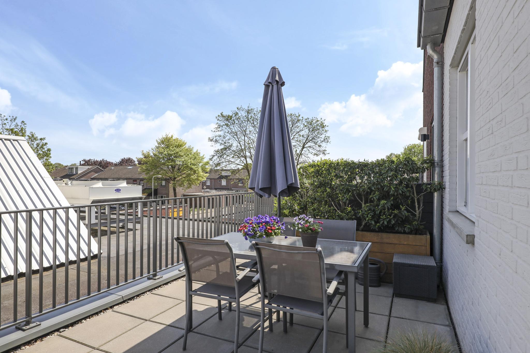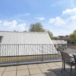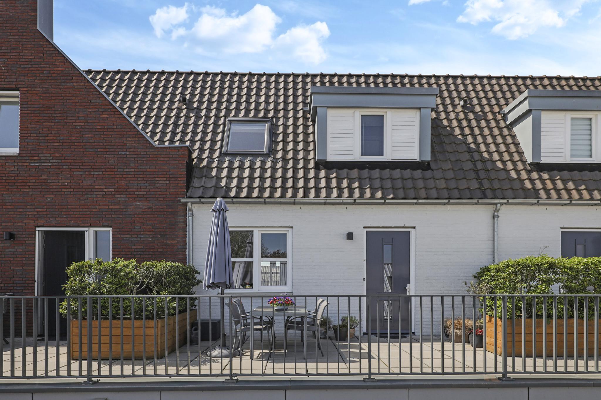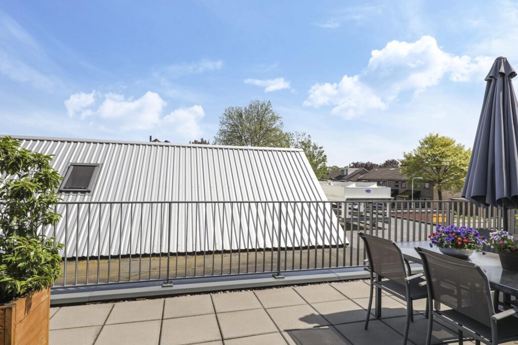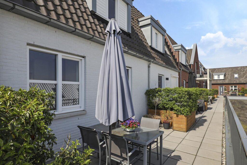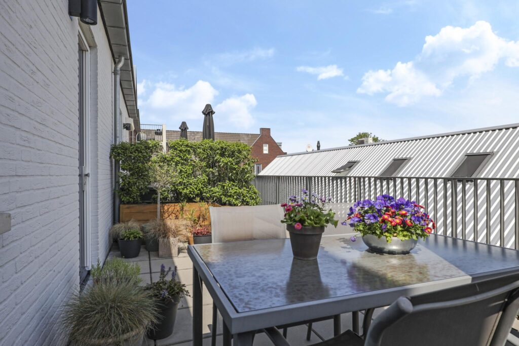 Aan de voorzijde van de woning is de het dakterras gelegen. Stijlvolle plantenbakken zorgen voor een groene afscheiding tussen de dakterrassen. Er is ruimte voor een hoekbank of een 4-persoons eettafel. Er dient een looppad vrij gehouden te worden voor de toegang van de andere bewoners van het complex.