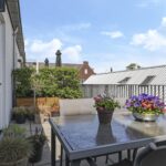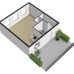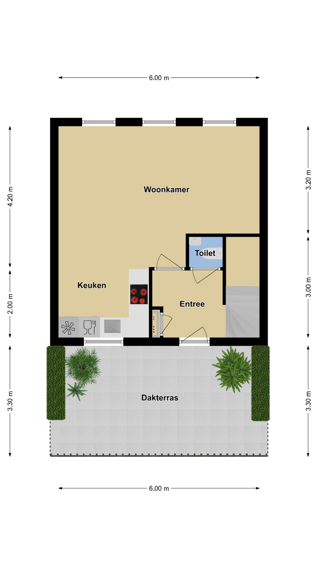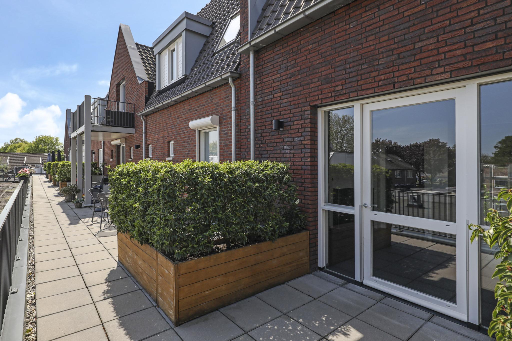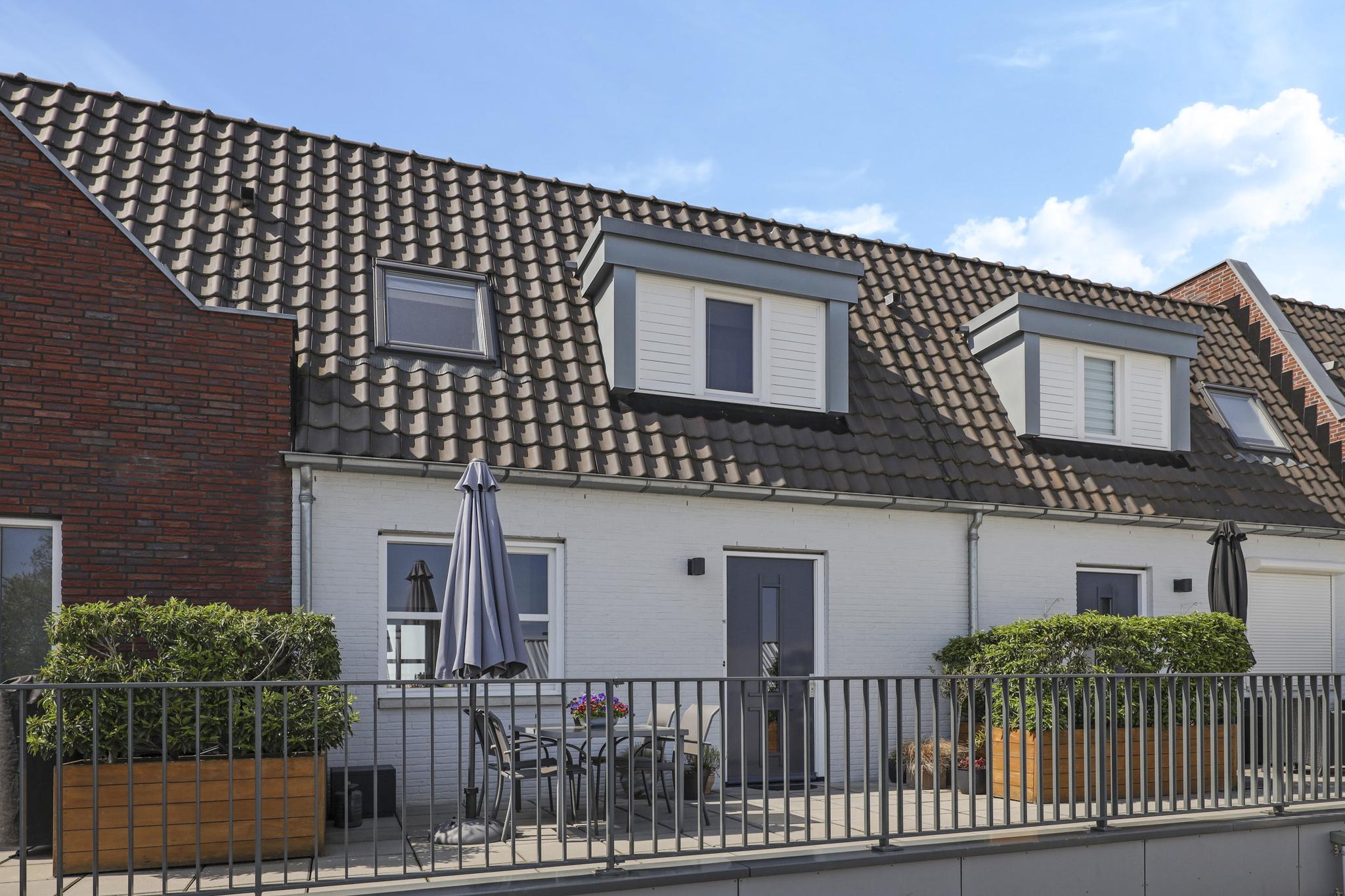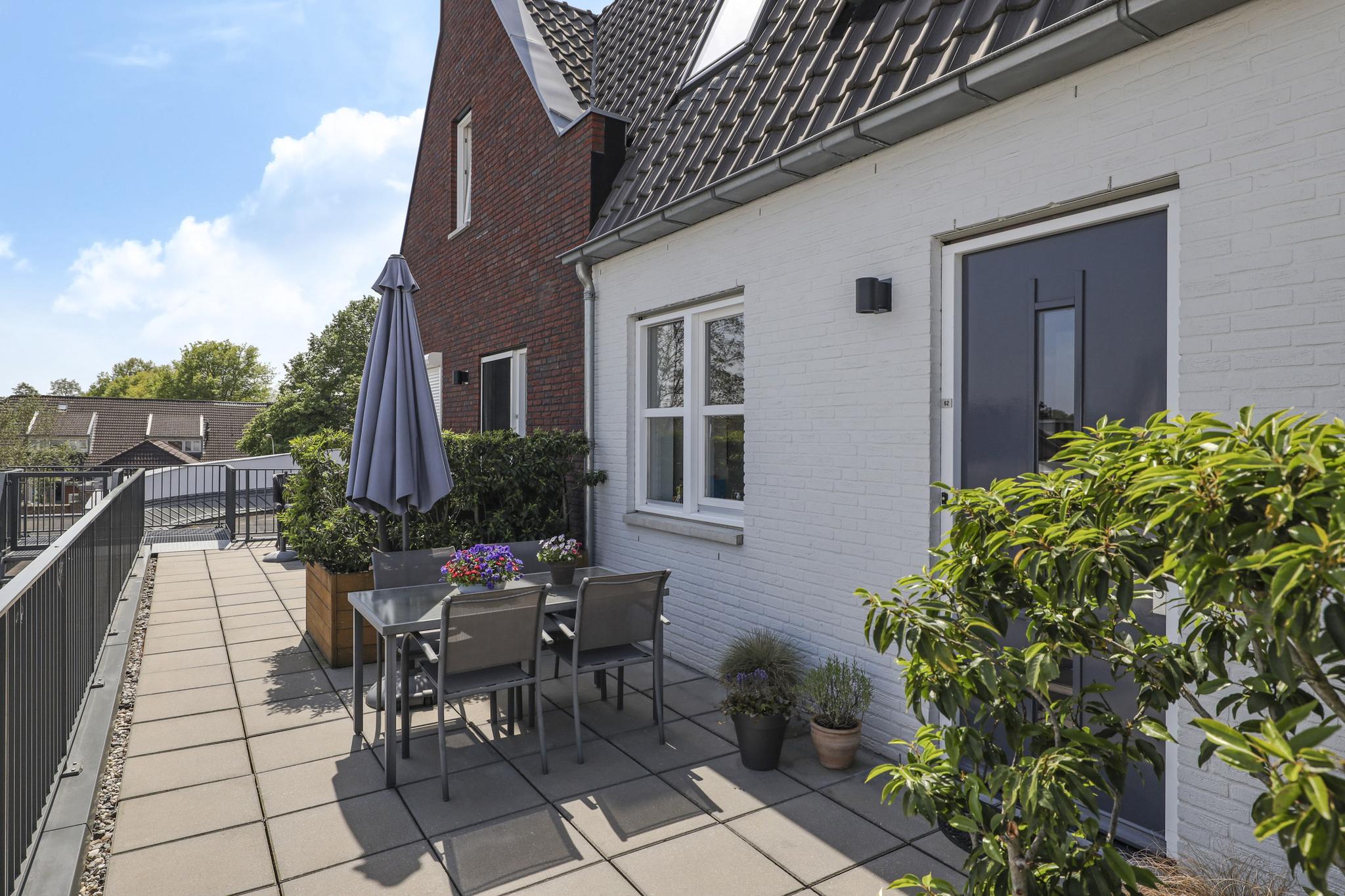 Aan de voorzijde van de woning is de het dakterras gelegen. Stijlvolle plantenbakken zorgen voor een groene afscheiding tussen de dakterrassen. Er is ruimte voor een hoekbank of een 4-persoons eettafel. Er dient een looppad vrij gehouden te worden voor de toegang van de andere bewoners van het complex.