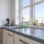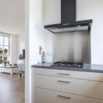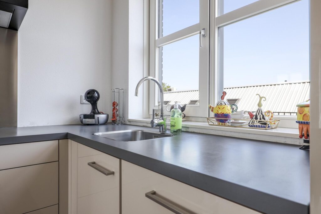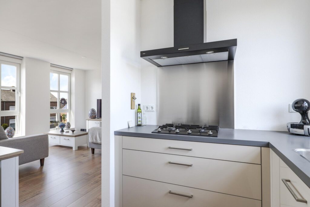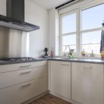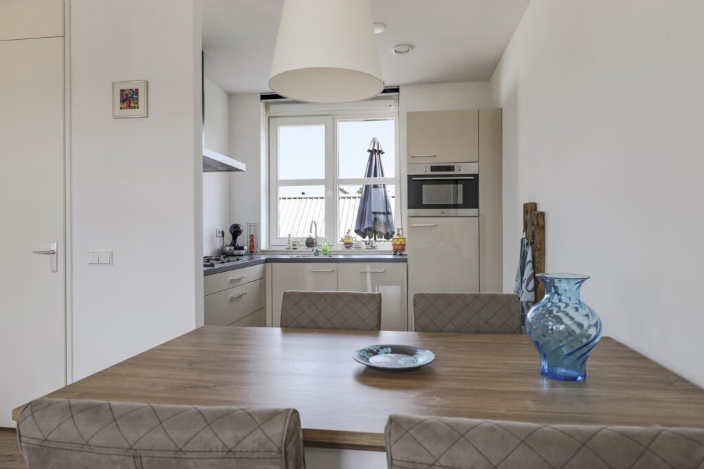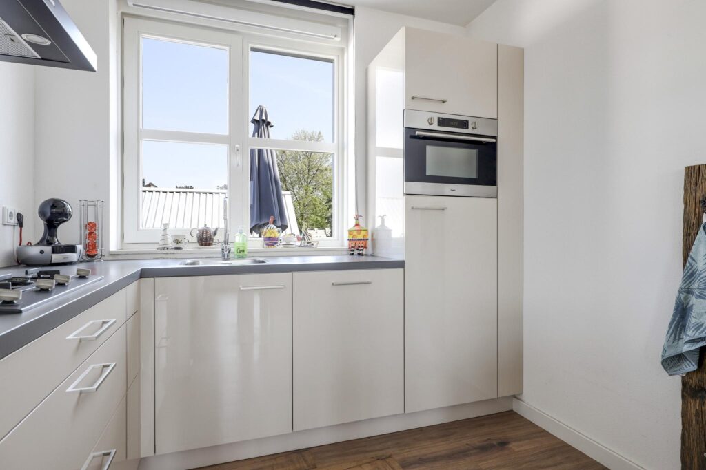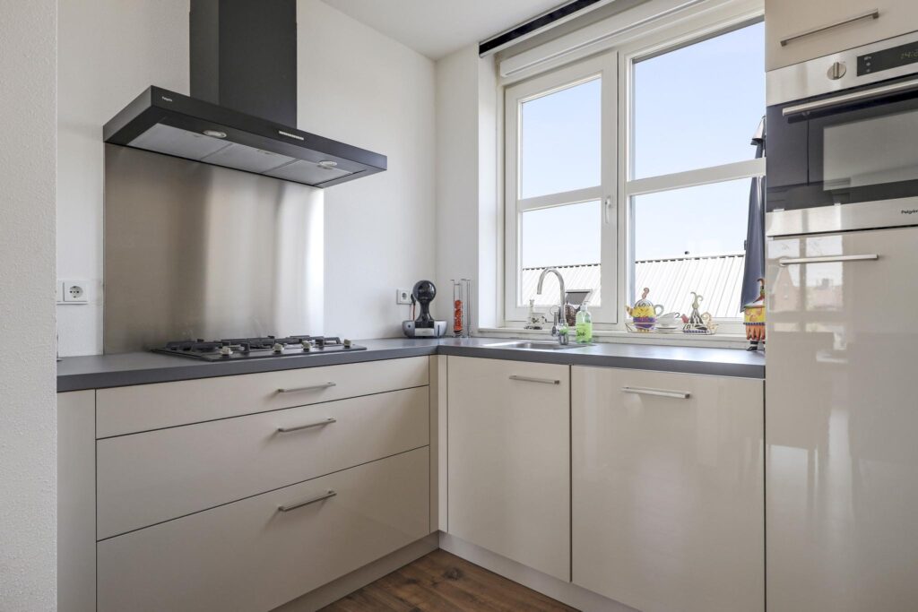 De keuken staat in open verbinding met de woonkamer wat zorgt voor een ruimtelijk effect. Er is gekozen voor een hoekopstelling waardoor de ruimte optimaal wordt benut. De aanwezige inbouwapparatuur bestaat uit een koel-vriescombinatie, een combi-oven/magnetron, een 4-pits gaskookplaat, een afzuigkap en een vaatwasser. De kleurstelling is erg stijlvol waarbij de lichte taupekleurige fronten de keuken een warmere uitstraling geven.