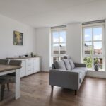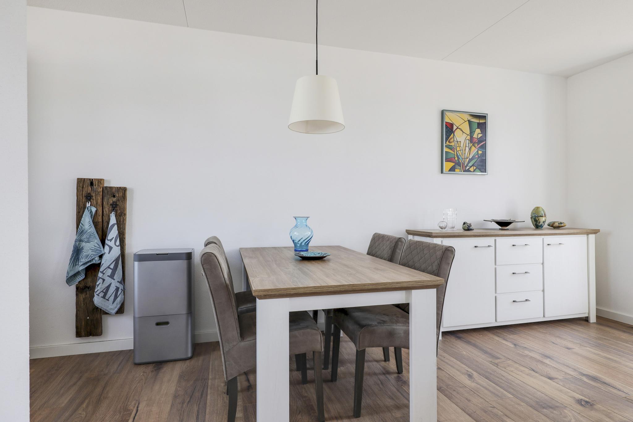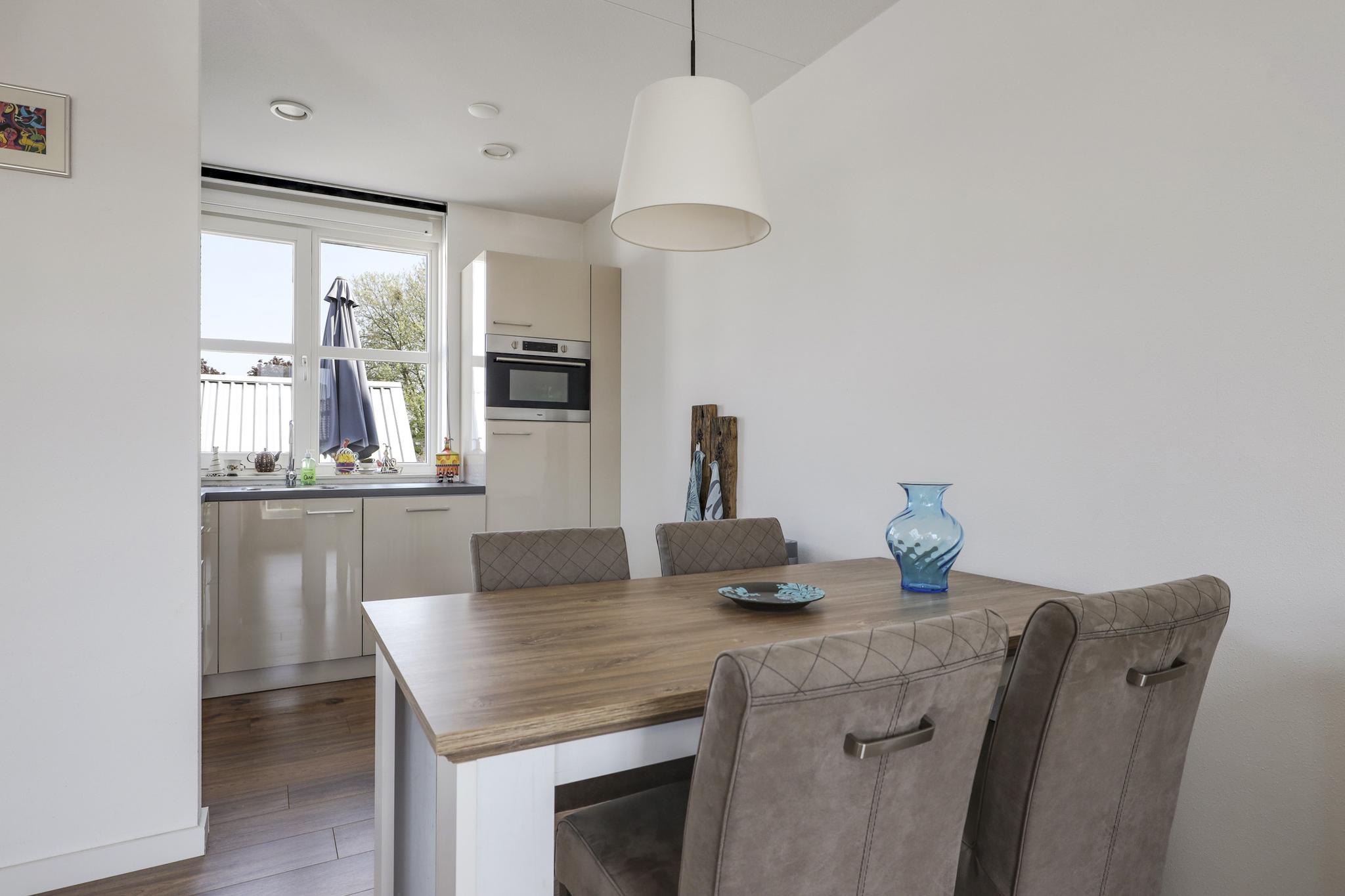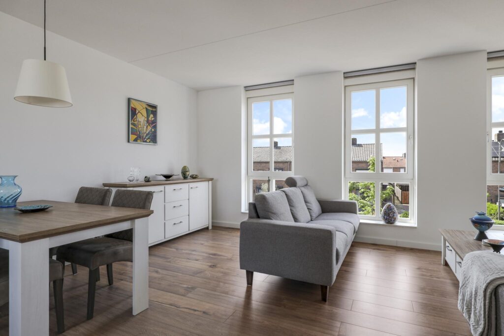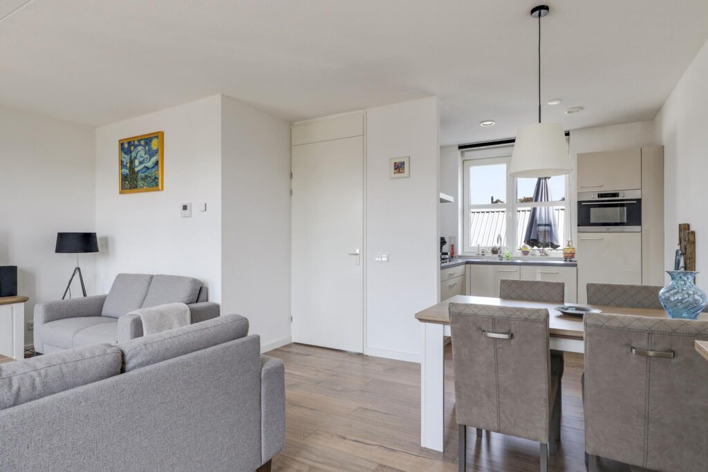 De woonkamer heeft een vierkant formaat wat zorgt dat je eenvoudig kunt spelen met de inrichting. Opvallend zijn de 3 grote ramen met vakverdeling wat zorgt voor veel sfeer en lichtinval. Erg prettig is dat alle 3 de ramen ook te openen zijn. Op de vloer ligt een nette laminaatvloer welke tevens is voorzien van vloerverwarming. Zo staat er geen radiator in de weg bij het plaatsen van de meubels. Doordat de woonkamer op de eerste verdieping is gelegen, kijk je hier ook prettig van je af.