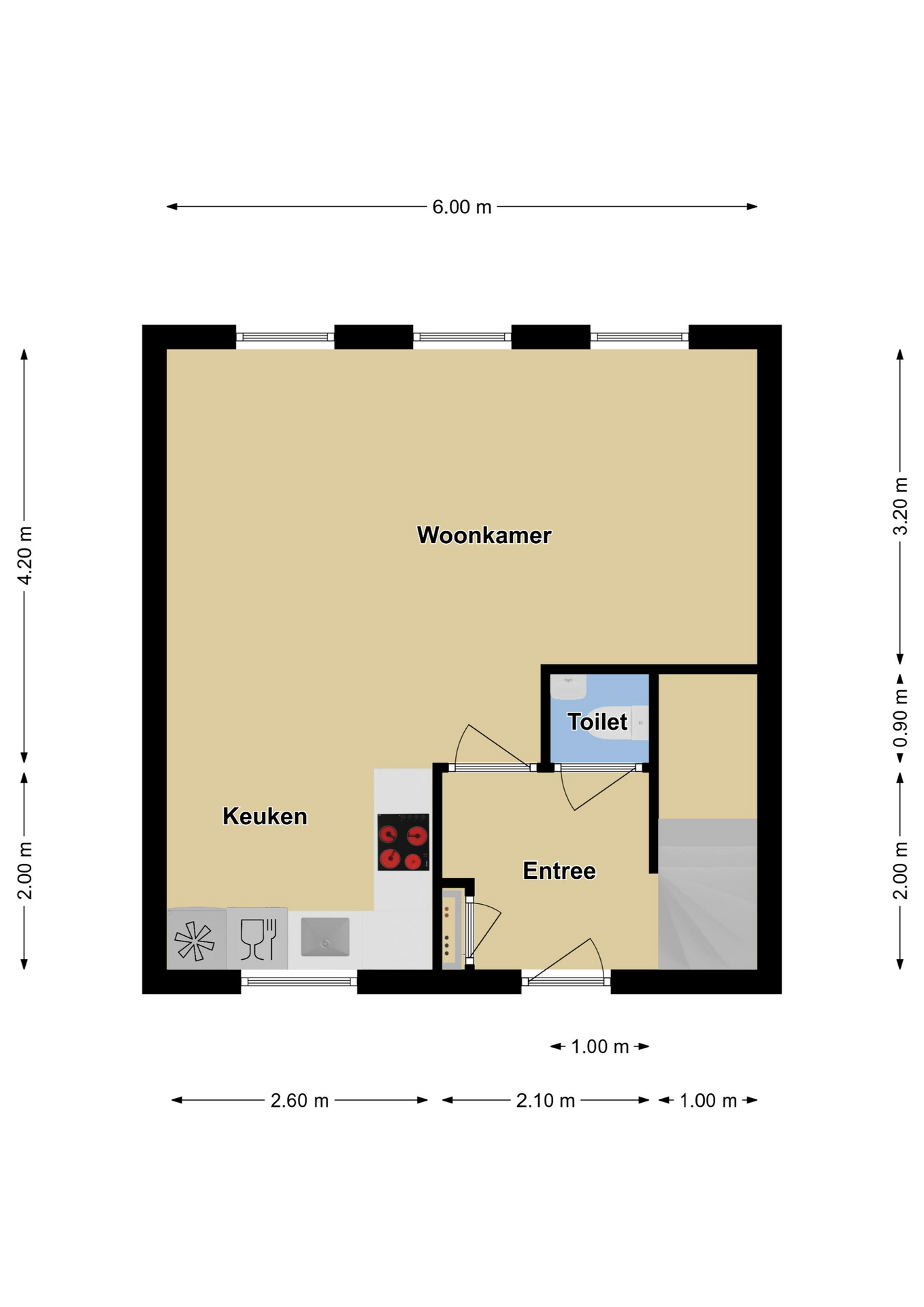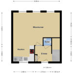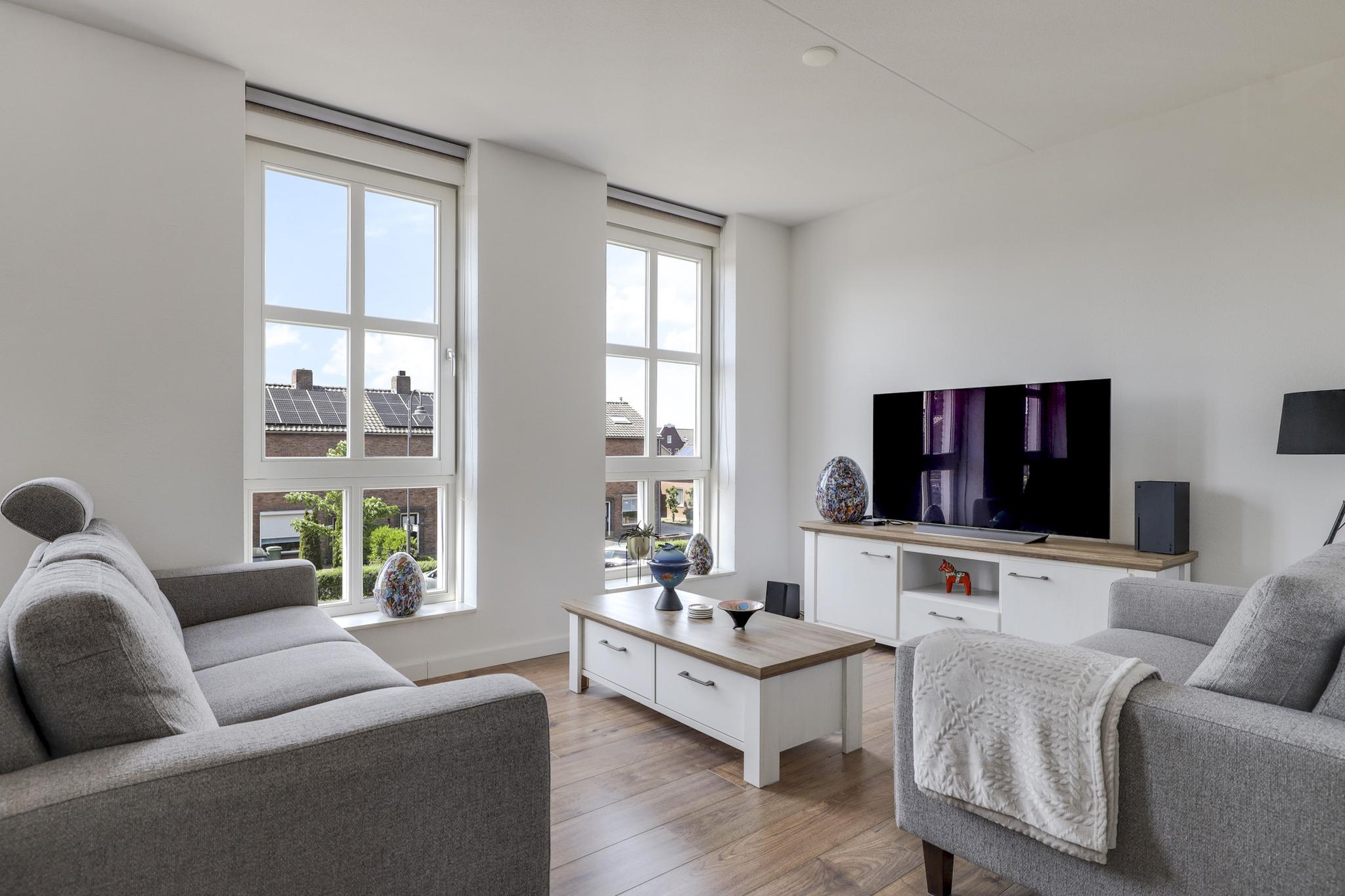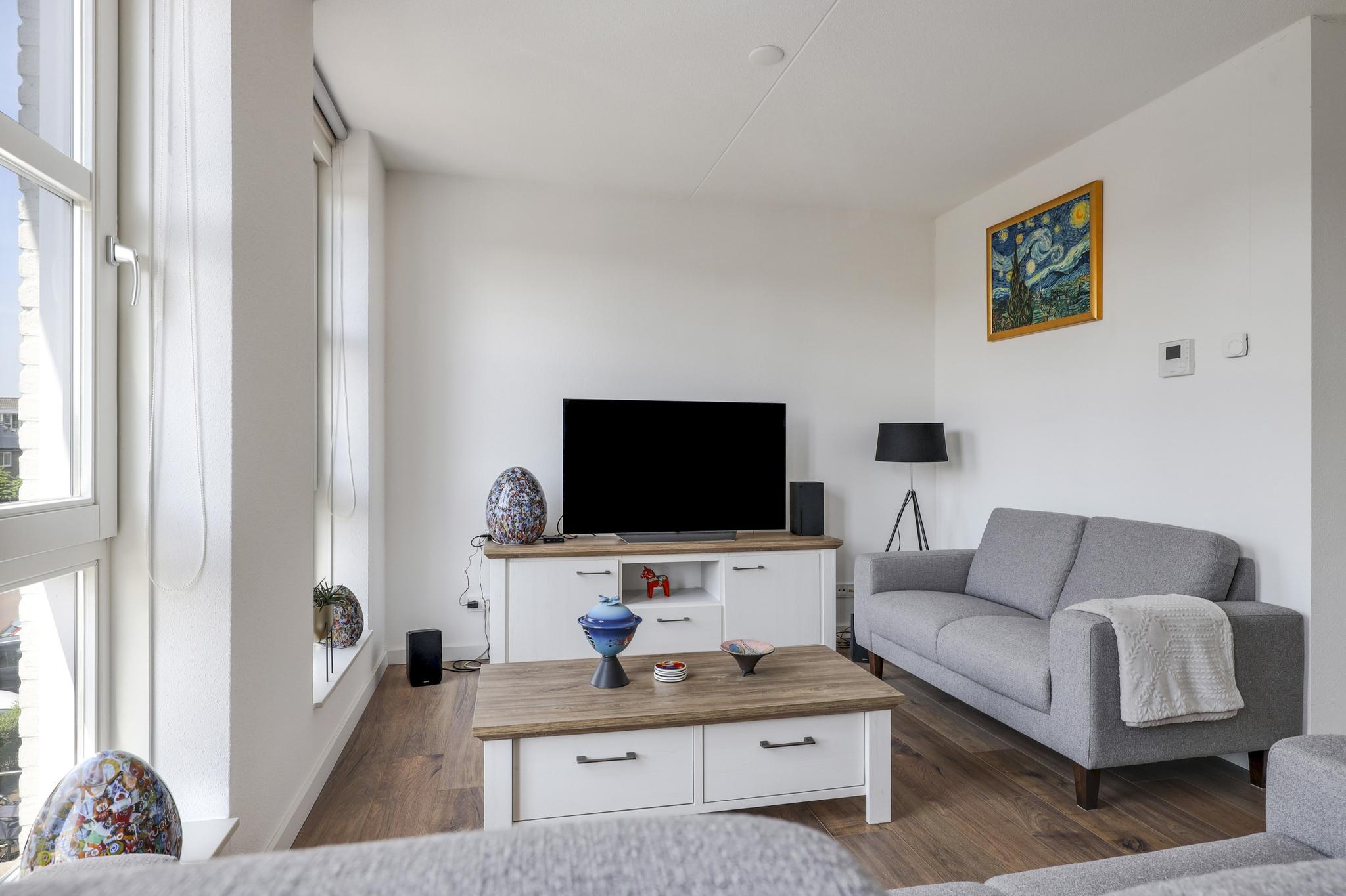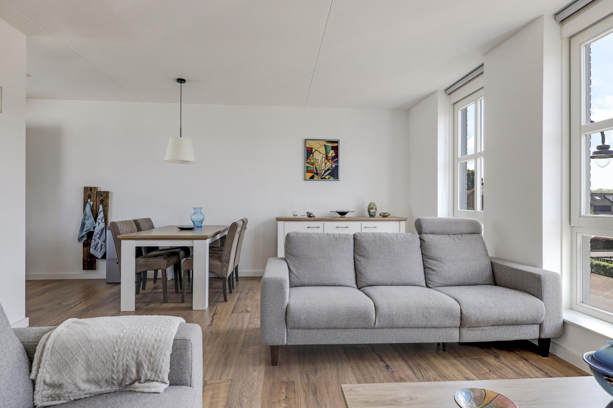 De woonkamer heeft een vierkant formaat wat zorgt dat je eenvoudig kunt spelen met de inrichting. Opvallend zijn de 3 grote ramen met vakverdeling wat zorgt voor veel sfeer en lichtinval. Erg prettig is dat alle 3 de ramen ook te openen zijn. Op de vloer ligt een nette laminaatvloer welke tevens is voorzien van vloerverwarming. Zo staat er geen radiator in de weg bij het plaatsen van de meubels. Doordat de woonkamer op de eerste verdieping is gelegen, kijk je hier ook prettig van je af.