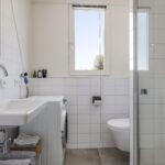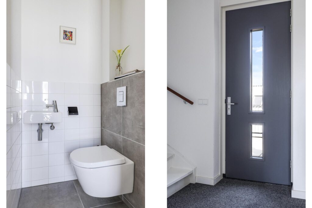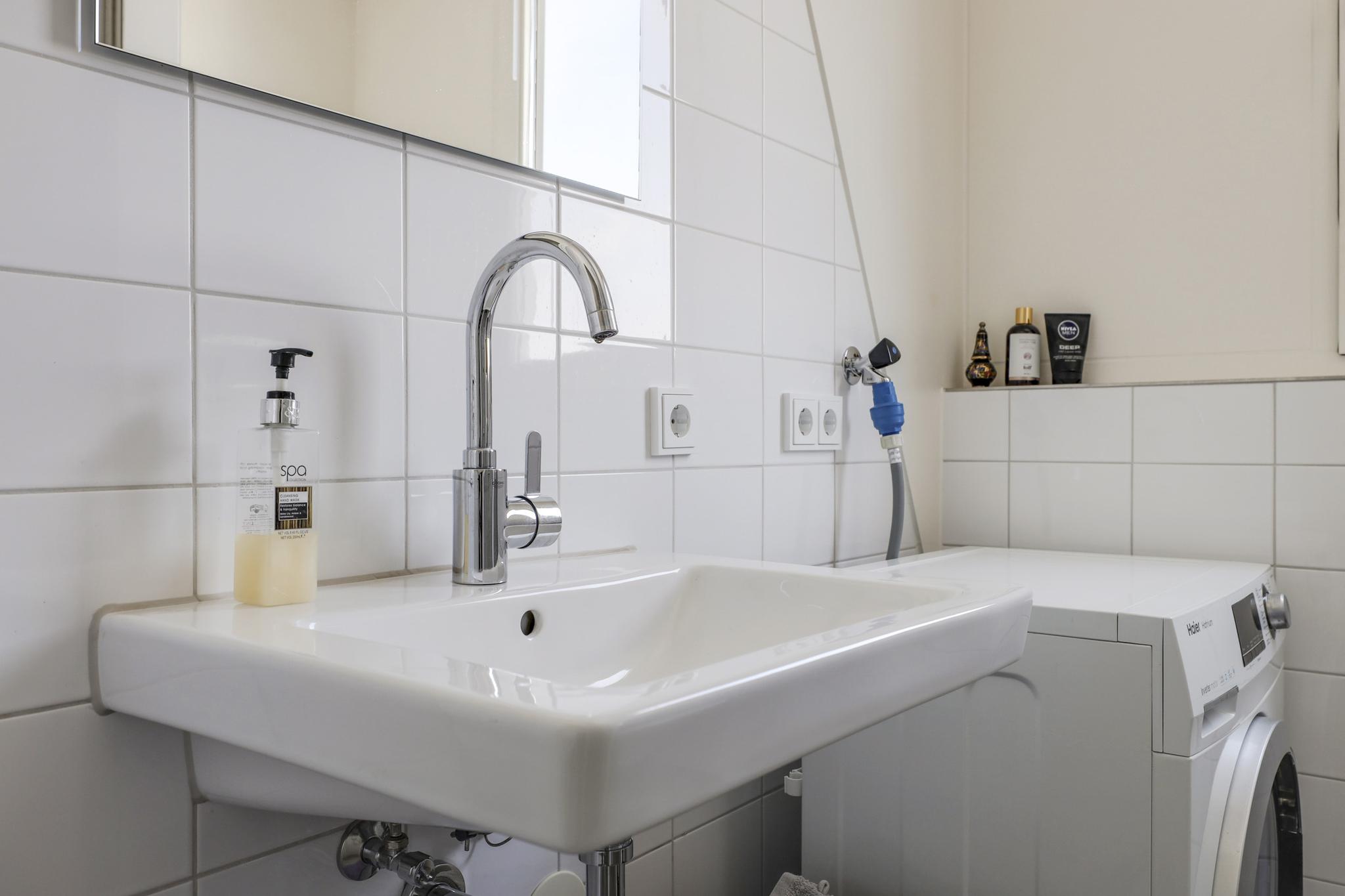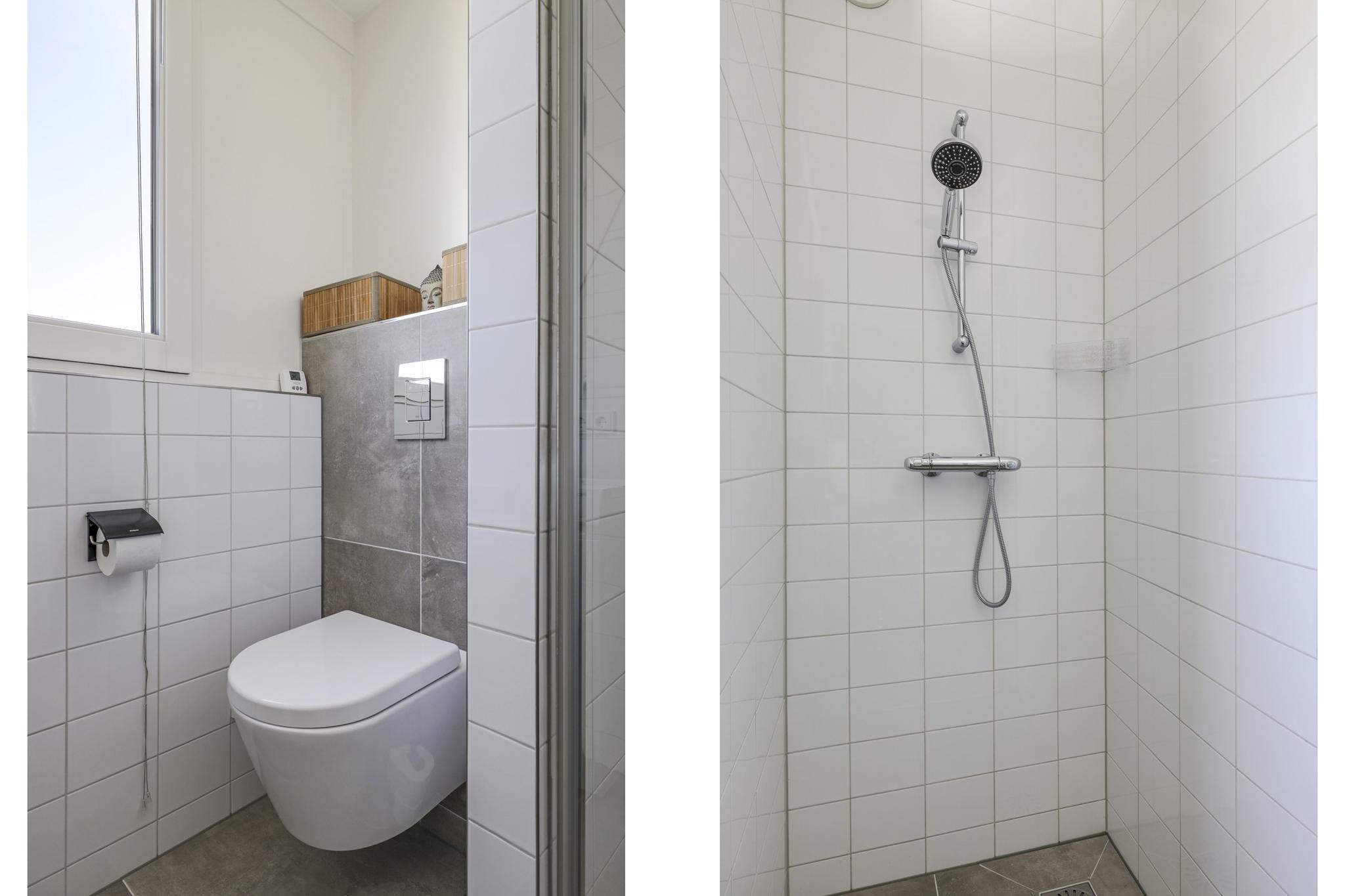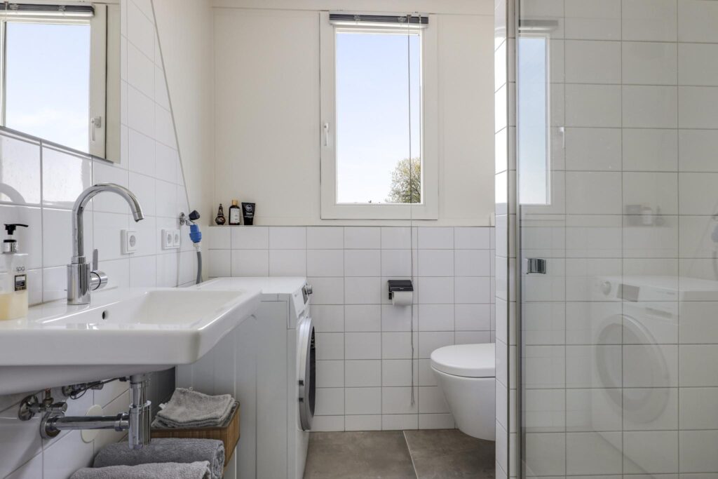 Net als de rest van de woning is ook de badkamer modern en neutraal te noemen. De ruimte is voorzien van een dakkapel waardoor er geen schuin dakvlak in de weg zit. Een groot raam zorgt daarbij voor veel lichtinval en een ventilatiemogelijkheid. Ook is er mechanische ventilatie aanwezig. De indeling bestaat uit een inloopdouche, een 2e toilet (zwevend) en een wastafel. Ook is hier een witgoedaansluiting aanwezig, maar heb je de wasmachine liever ergens anders dan kan die ook in de vaste kast (bij cv-ketel) op de hoofdslaapkamer geplaatst worden.