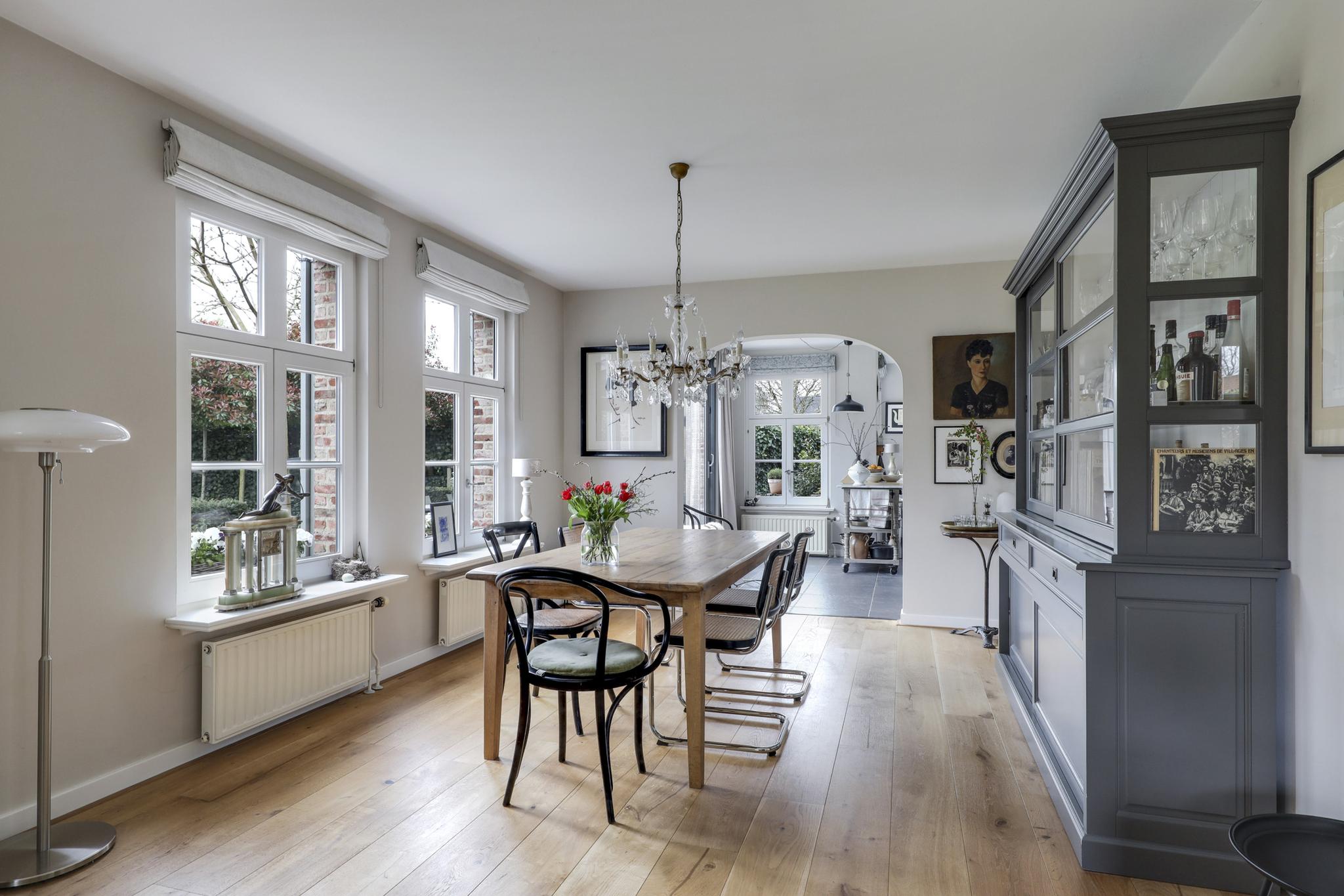 De uiteindelijke stijlspecifieke kenmerken worden voor een belangrijk deel bepaald door de kwaliteit van uitwerking en uitvoering van de gebouwdetails. En dat is hier om te smullen. Bij deze woning zijn alle registers losgetrokken en is er niet bezuinigd op materiaalkeuzes. Dit wordt ook meteen bij binnenkomst duidelijk wanneer je kijkt naar de stijlvolle trapopgang en de klassieke, stompe paneeldeuren die worden omlijst door rijk gedecoreerde architraven met neuten eronder. Het raam- en deurbeslag is smaakvol op de stijl van de woning aangepast. Hetzelfde geldt voor de Belgisch hardstenen details. Of het nou de stijl van de keuken is (maatwerk, massief houten keuken), het sanitair en afwerking van de badkamers of de verschillende hoogwaardige vloerafwerkingen, er is zeer consequent en gedetailleerd met de afwerking omgegaan.