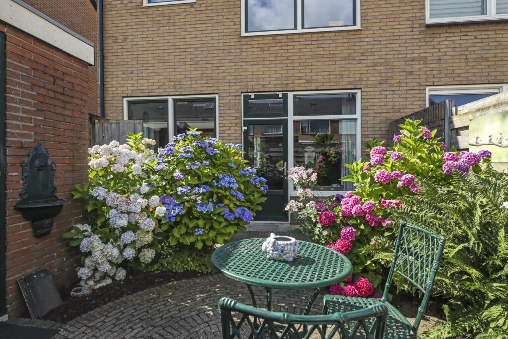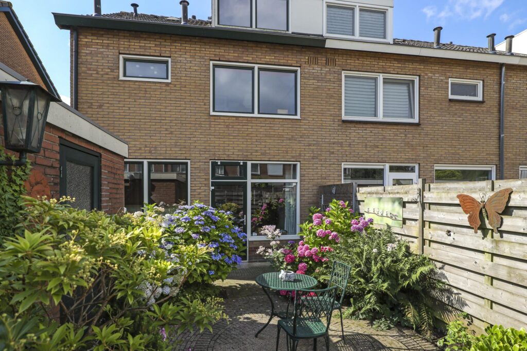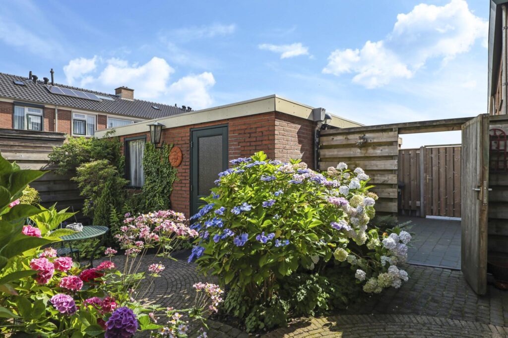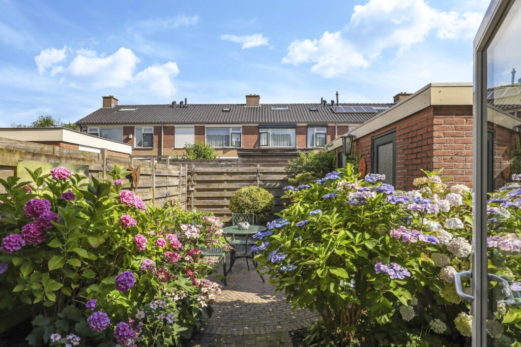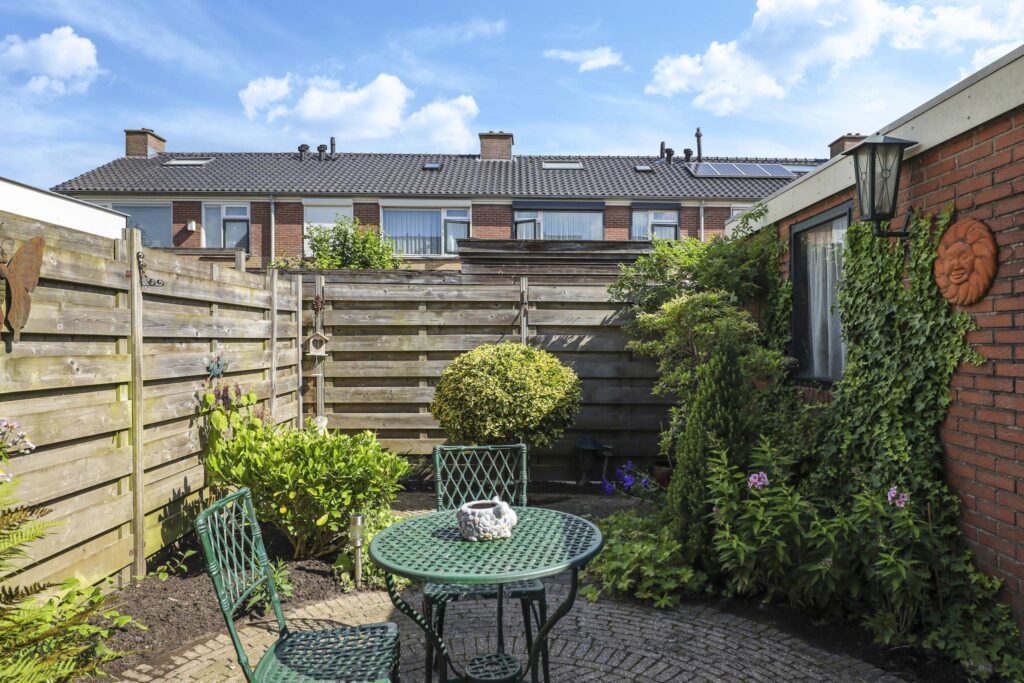 Vanuit de woonkamer loopje zo de achtertuin in. Deze is voorzien van een groot terras en diverse planten en struiken. De hortensia’s zorgen voor een kleurrijk beeld wanneer je vanuit de woning naar de tuin kijkt. Ondanks dat de ligging op het noorden kan je hier wel lekker genieten van de zon. Direct aan de gevel zal je iets meer schaduw treffen. De achtertuin is geheel omheind met een schutting. Tussen de woning en de garage is de achterom gelegen.