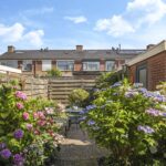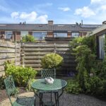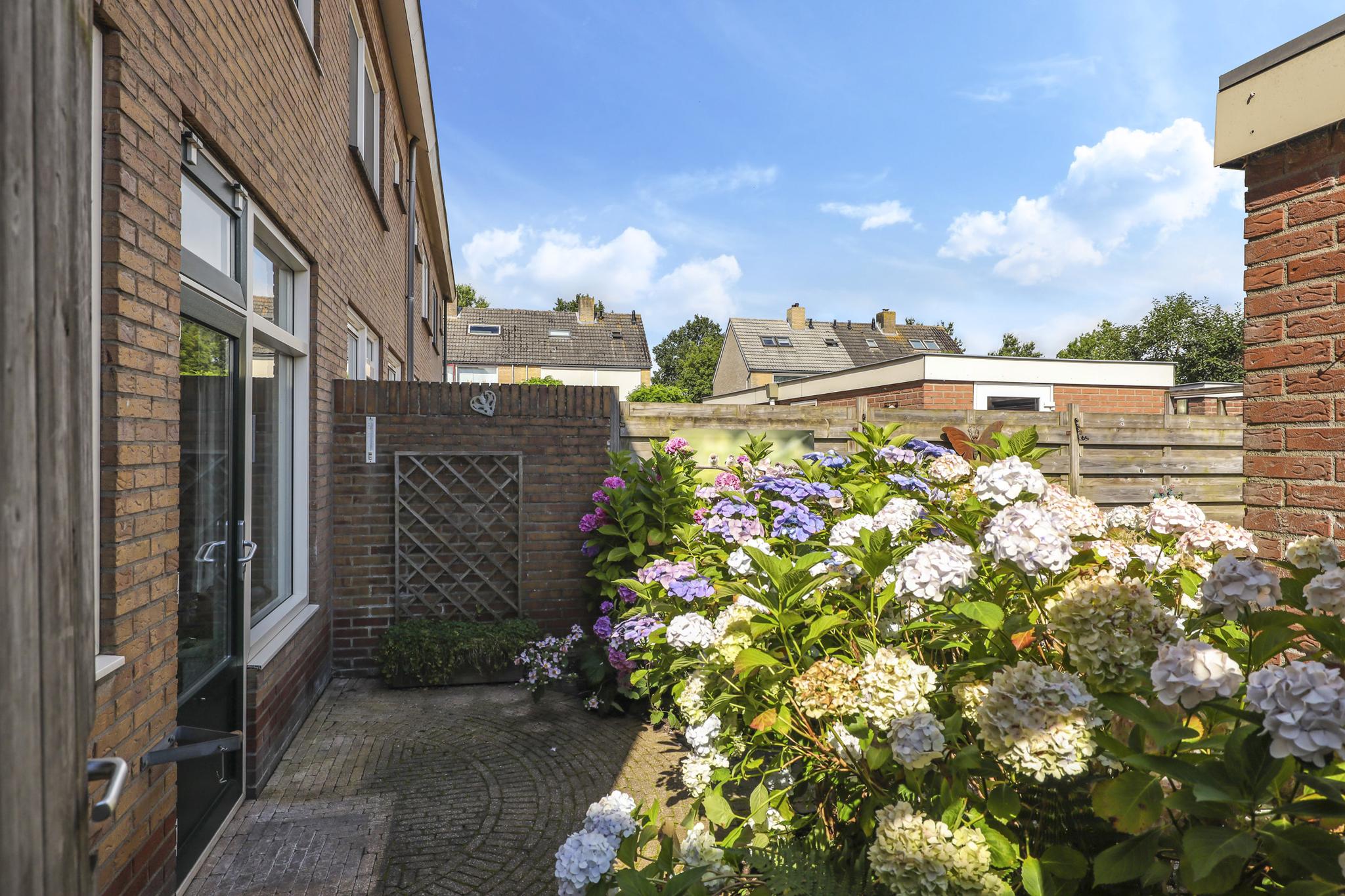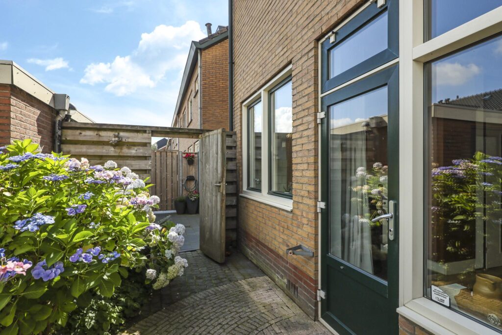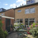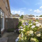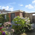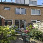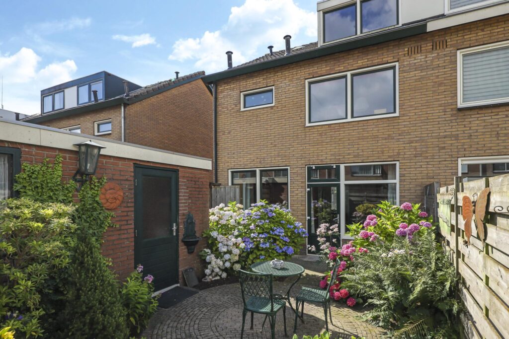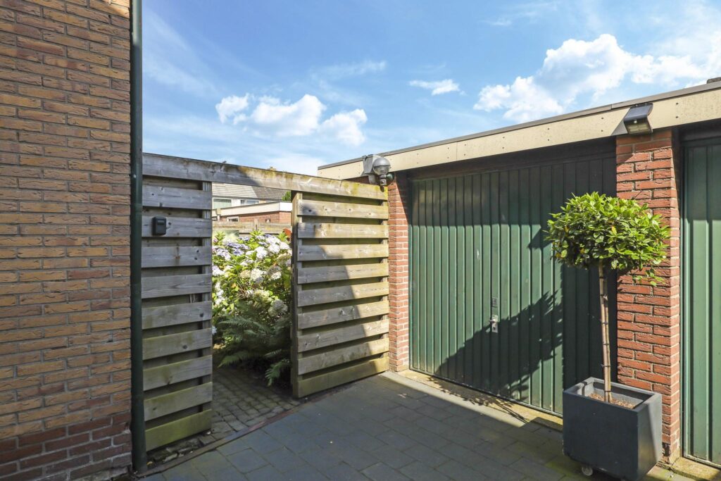 Vanuit de woonkamer loopje zo de achtertuin in. Deze is voorzien van een groot terras en diverse planten en struiken. De hortensia’s zorgen voor een kleurrijk beeld wanneer je vanuit de woning naar de tuin kijkt. Ondanks dat de ligging op het noorden kan je hier wel lekker genieten van de zon. Direct aan de gevel zal je iets meer schaduw treffen. De achtertuin is geheel omheind met een schutting. Tussen de woning en de garage is de achterom gelegen.