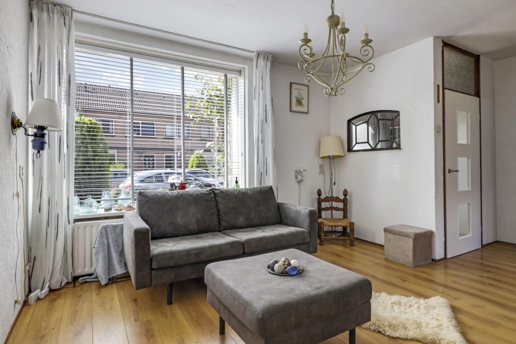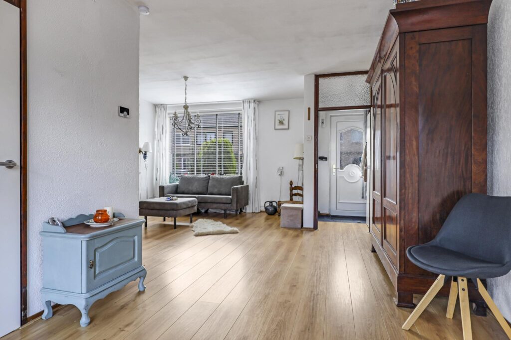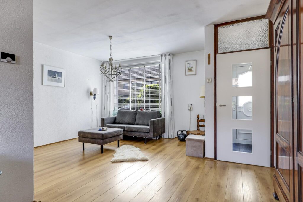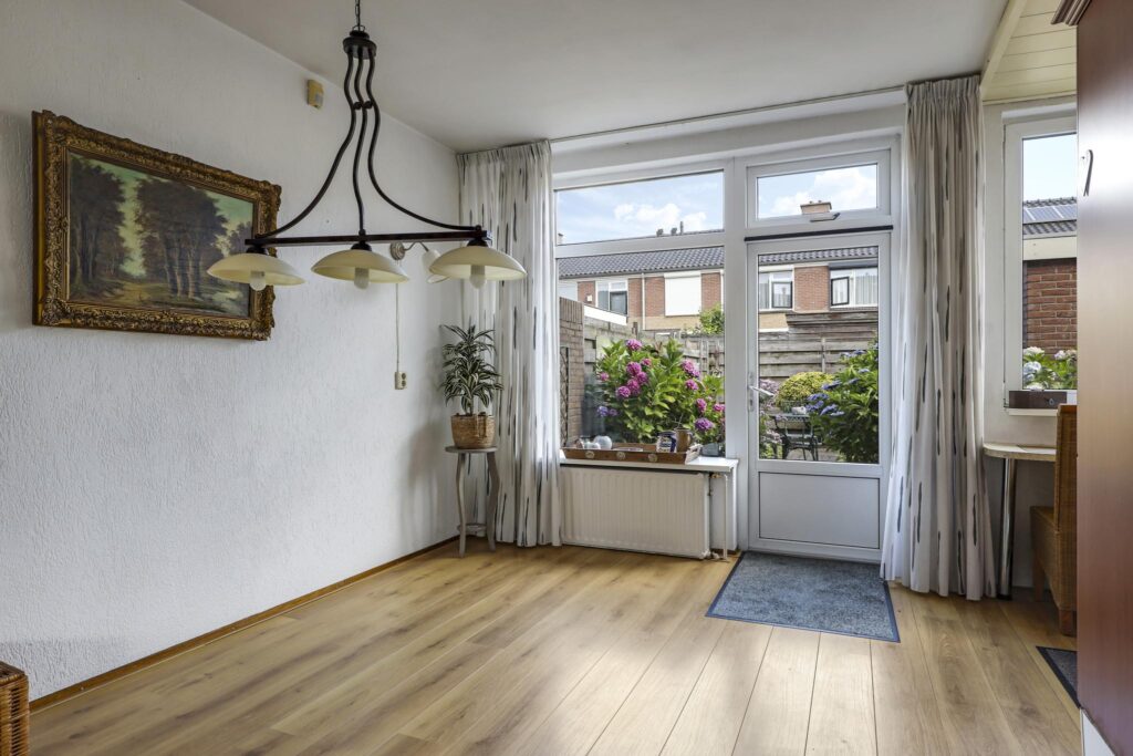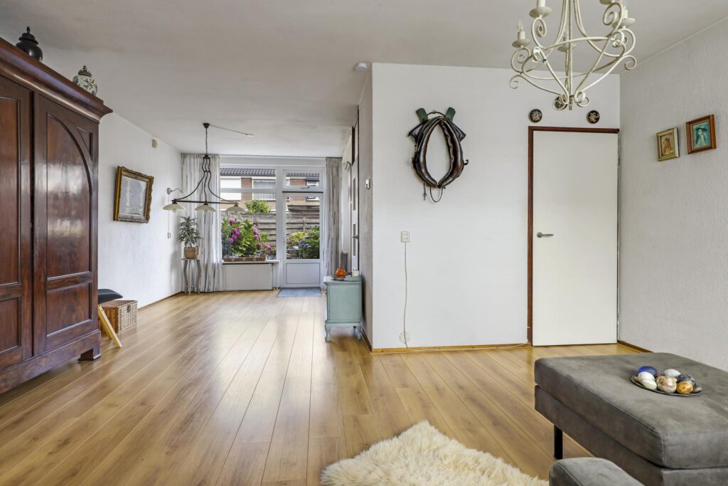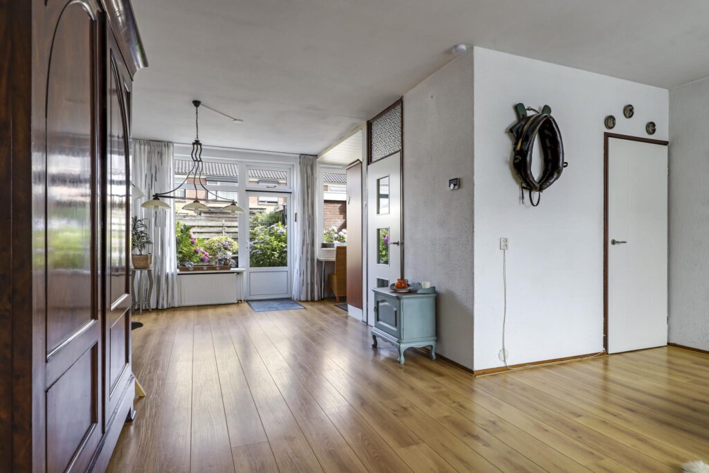 De woonkamer is aan de voorzijde gelegen en heeft een speelse en ruime indeling. Deze indeling is ontstaan door een entree aan de voorzijde én een hal (met trapopgang en toilet) in het midden van de woning. De hierdoor ontstane Z-indeling zorgt ervoor dat de ruimte als het ware wordt opgedeeld in een zit- en een eethoek. De zithoek aan de voorzijde van de woning biedt plaats voor een lekkere grote hoekbank. Ook tref je hier de trapkast voor veel praktische bergruimte. In de lengte van de woning is de eethoek gesitueerd. Hier kan je eenvoudig een grote eettafel kwijt. Grote raampartijen zorgen voor veel lichtinval in de woning.
