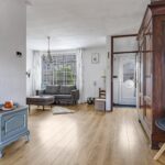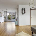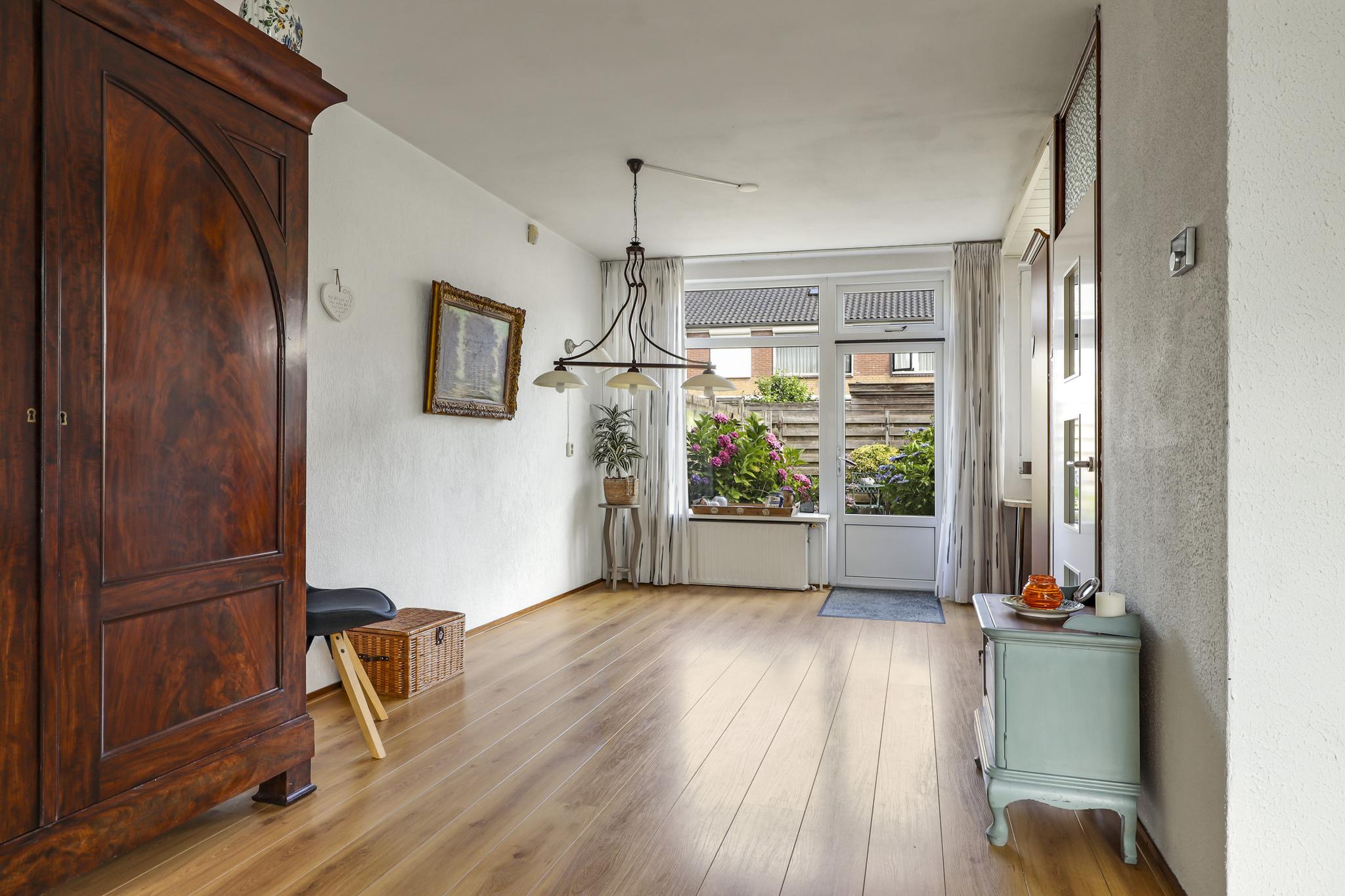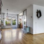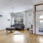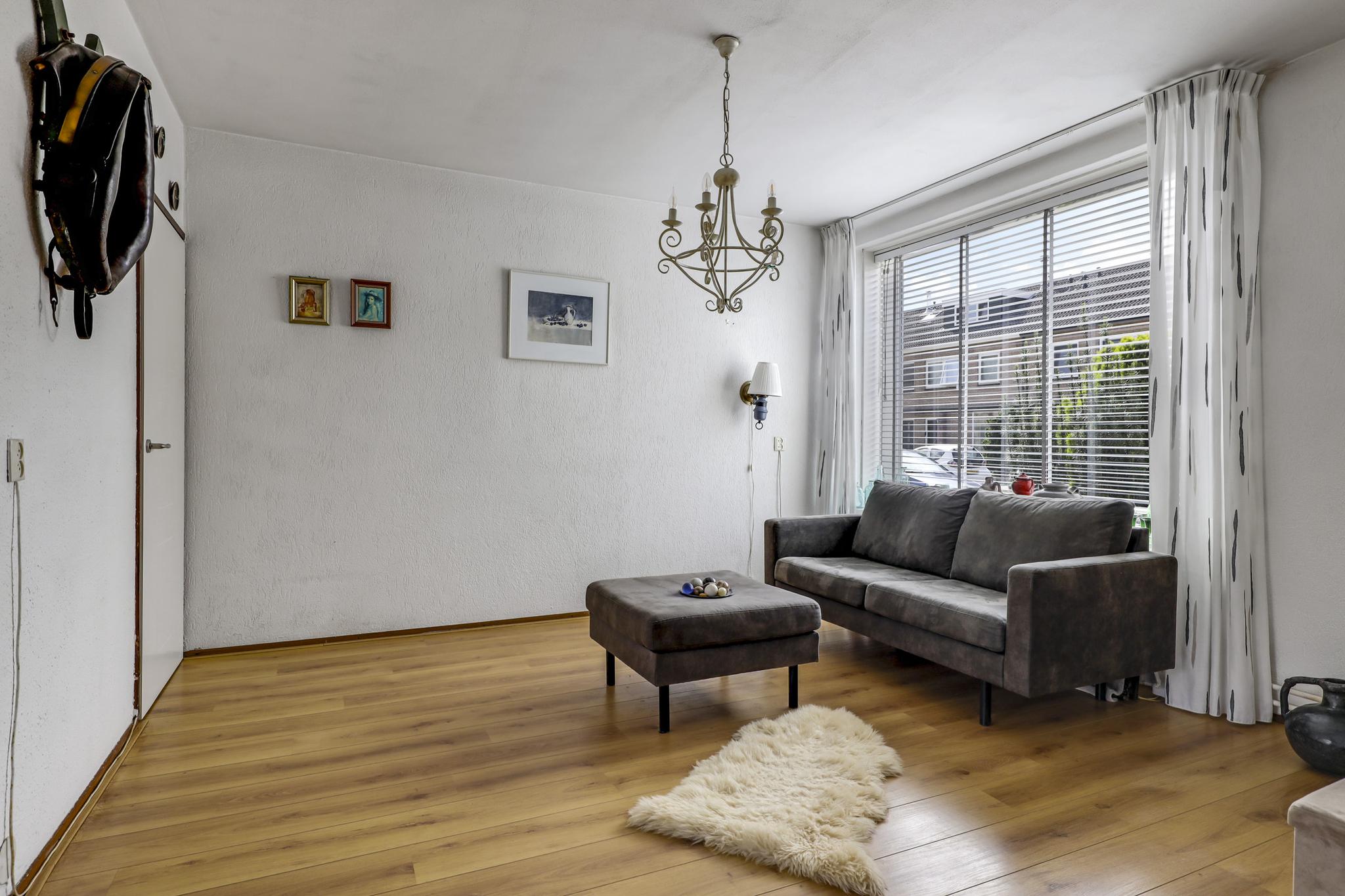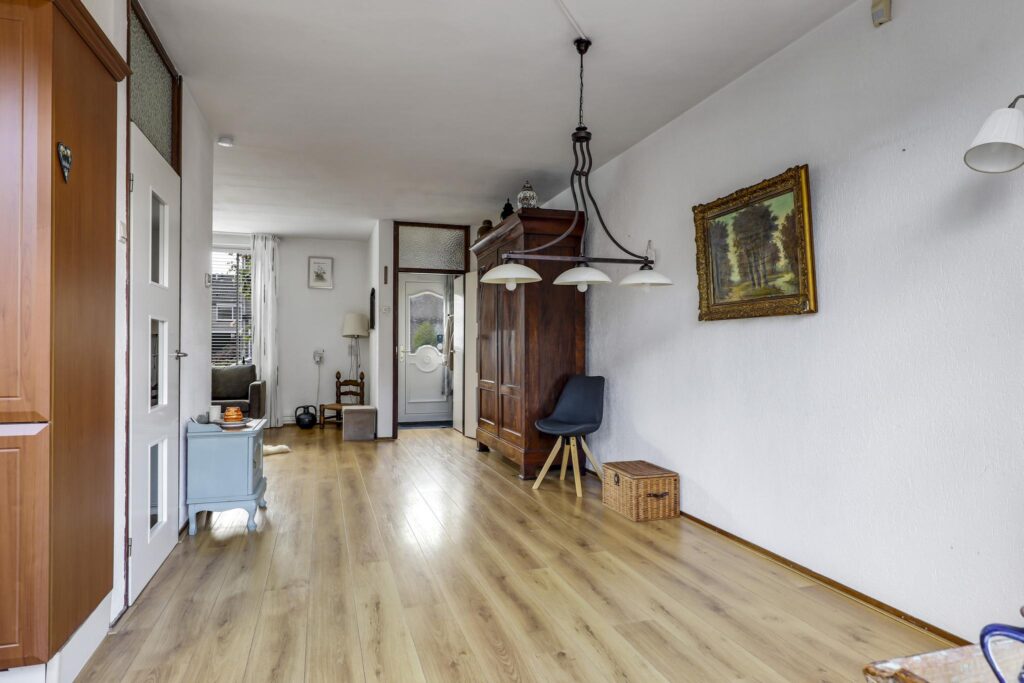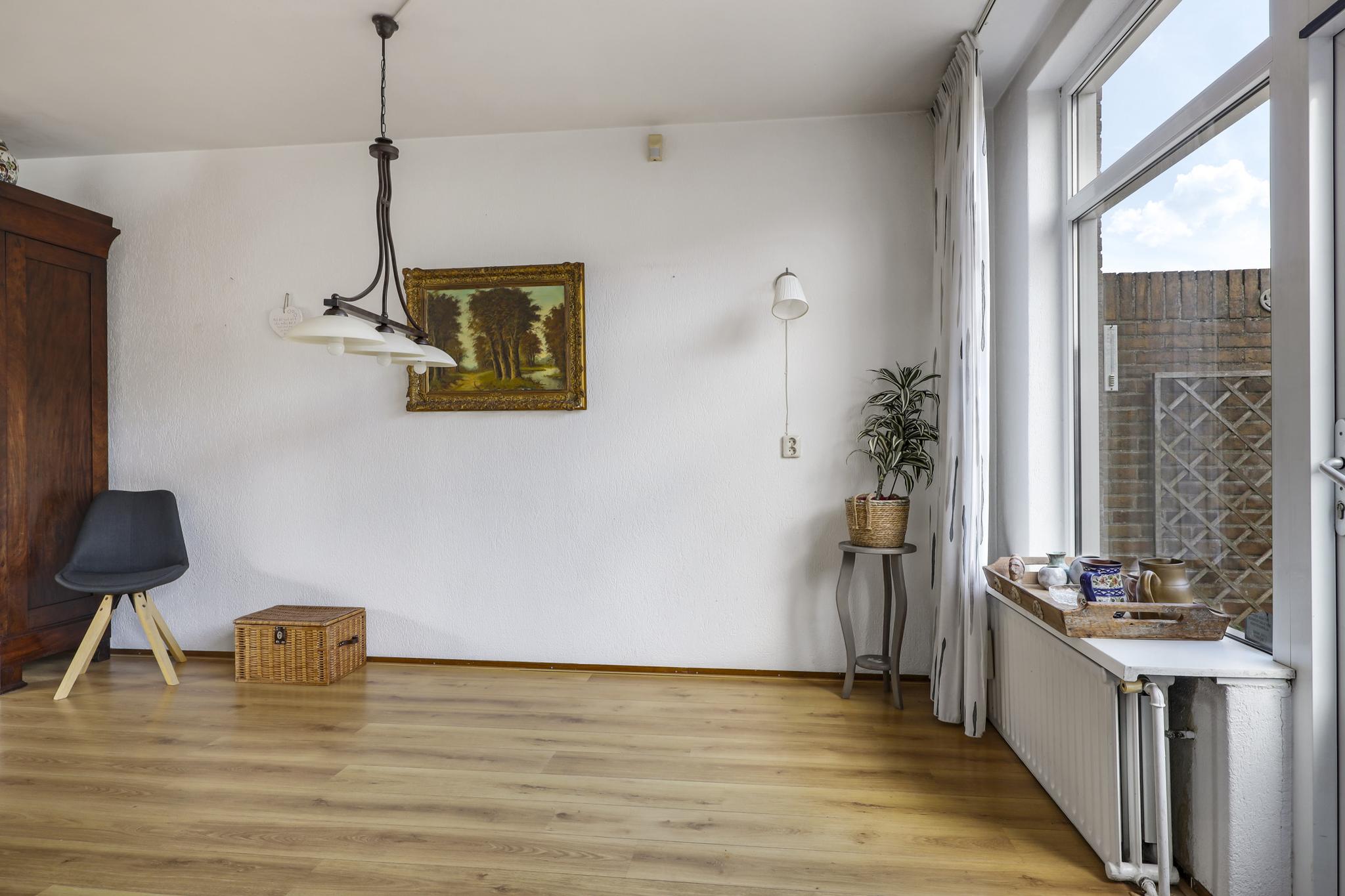 De woonkamer is aan de voorzijde gelegen en heeft een speelse en ruime indeling. Deze indeling is ontstaan door een entree aan de voorzijde én een hal (met trapopgang en toilet) in het midden van de woning. De hierdoor ontstane Z-indeling zorgt ervoor dat de ruimte als het ware wordt opgedeeld in een zit- en een eethoek. De zithoek aan de voorzijde van de woning biedt plaats voor een lekkere grote hoekbank. Ook tref je hier de trapkast voor veel praktische bergruimte. In de lengte van de woning is de eethoek gesitueerd. Hier kan je eenvoudig een grote eettafel kwijt. Grote raampartijen zorgen voor veel lichtinval in de woning.