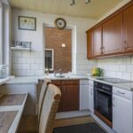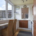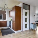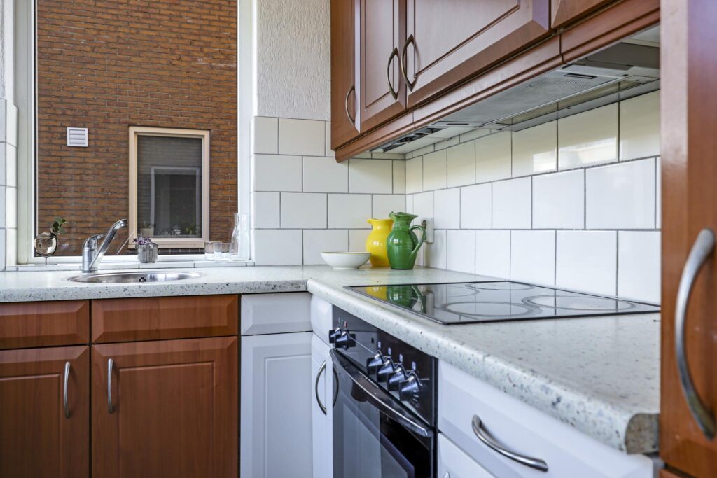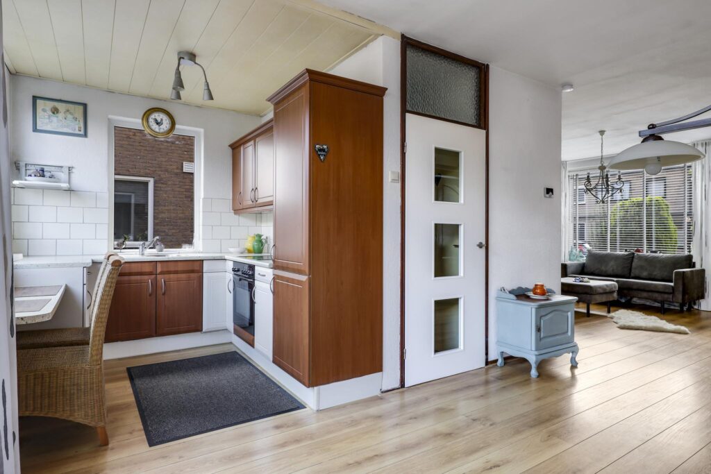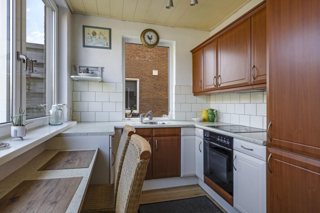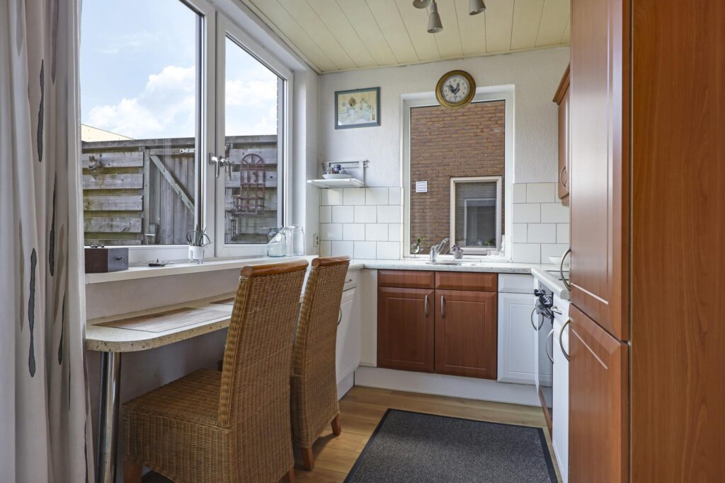 De keuken is aan de achterzijde van de woning gelegen. Er is hier gekozen voor een U-opstelling waarmee de ruimte maximaal wordt benut. De aangesloten ontbijtbar geeft een leuk effect. De inbouwapparatuur bestaat uit onder meer een 4-pits keramische kookplaat, een afzuigkap, een oven en een koel/vriescombinatie. Door de hoekligging van de woning heb je naast een groot raam in de achtergevel ook een zijgevelraam. Mocht je een nieuwe keuken plaatsen dan kan je hier kiezen voor verschillende opstellingen zoals een hoekopstelling op juist 2 rechte keukenblokken. Een tuindeur geeft toegang tot de achtertuin.