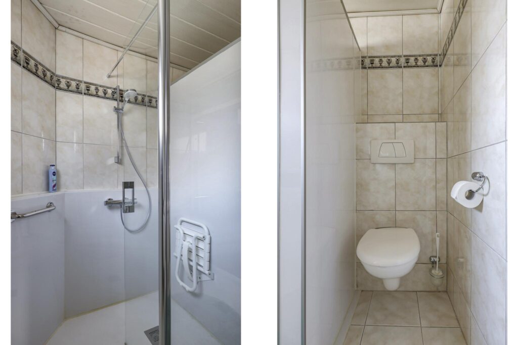 Badkamer met ruime inloopdouche, wastafelmeubel en een 2e toilet.