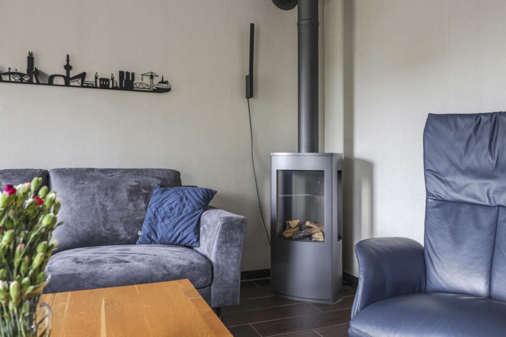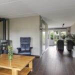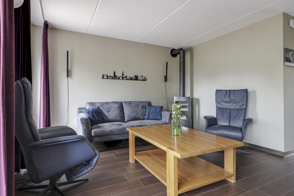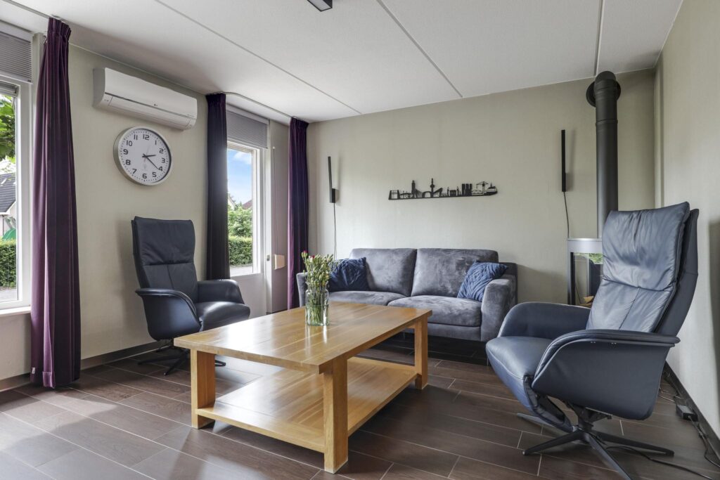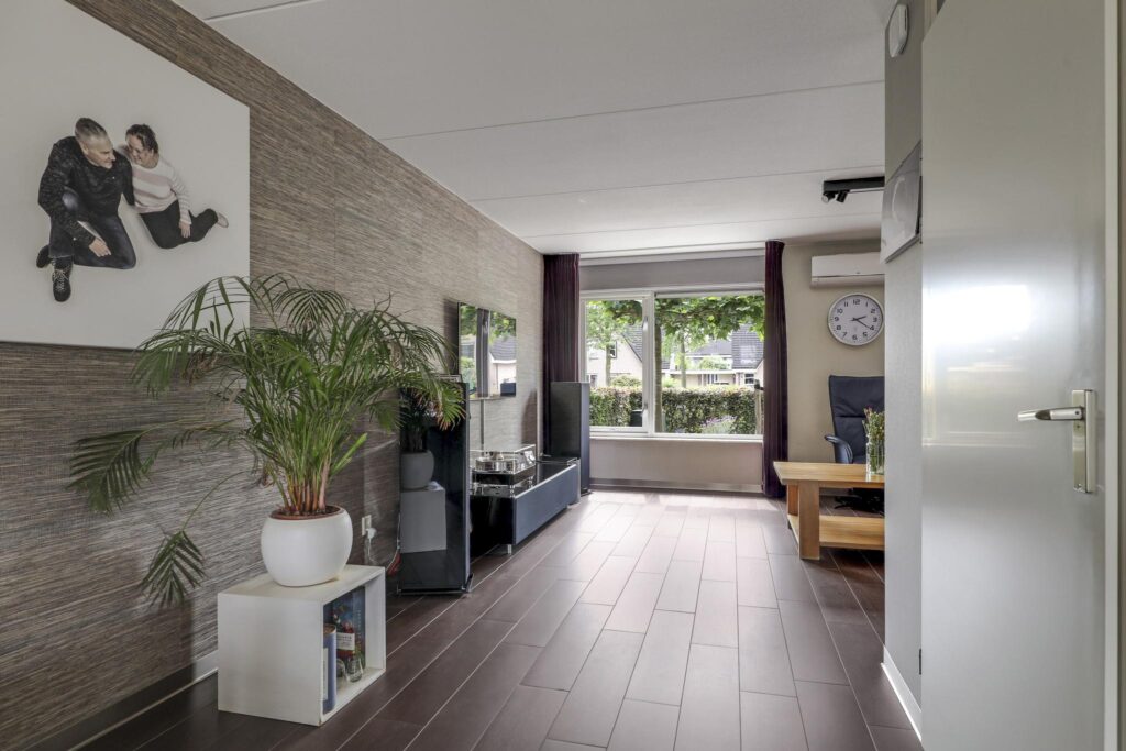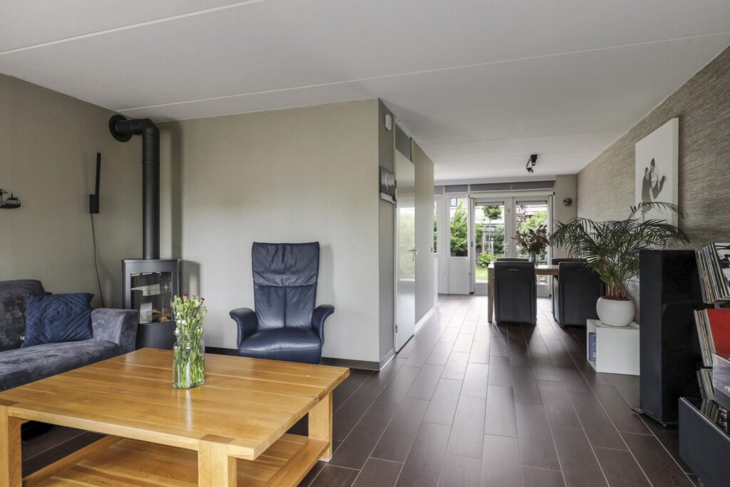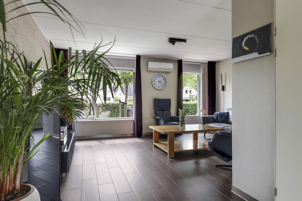 De woonkamer bevindt zich aan de voorzijde van de woning en heeft een rechthoekig formaat. Dit zorgt ervoor dat je eenvoudig kunt spelen met de inrichting en er meerdere mogelijkheden zijn om je bank te plaatsen. Grote raampartijen zorgen voor een fijn uitzicht, vooral omdat de tegenovergelegen bebouwing verder weg staat. De ramen aan de voorzijde zijn voorzien van een rolluik en een zonwering (markies). De begane grond is voorzien van een aangename vloerverwarming met daarop plavuizen. Comfortabel is de airconditioning welke tevens in deze ruimte is geplaatst. Een haard zorgt voor veel sfeer en warmte op de koude winteravonden.