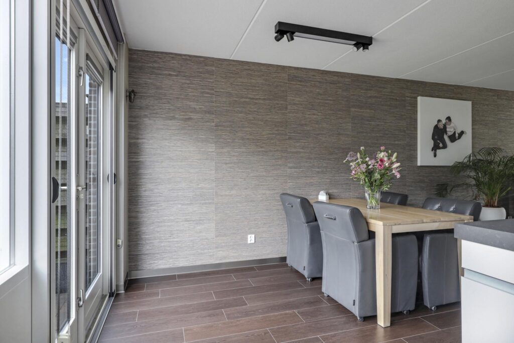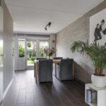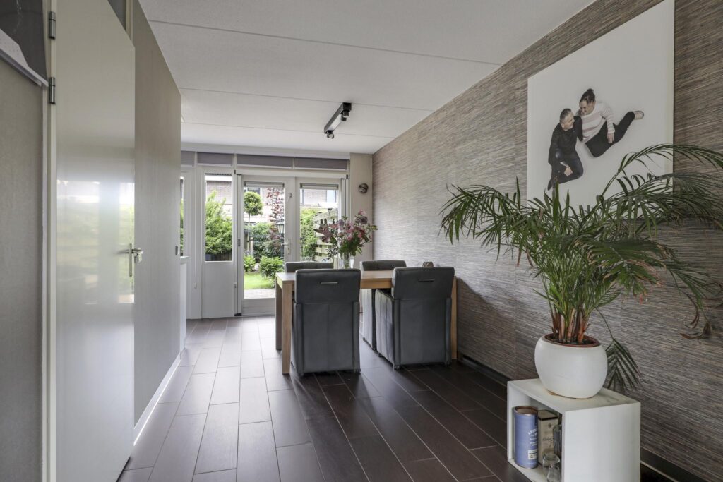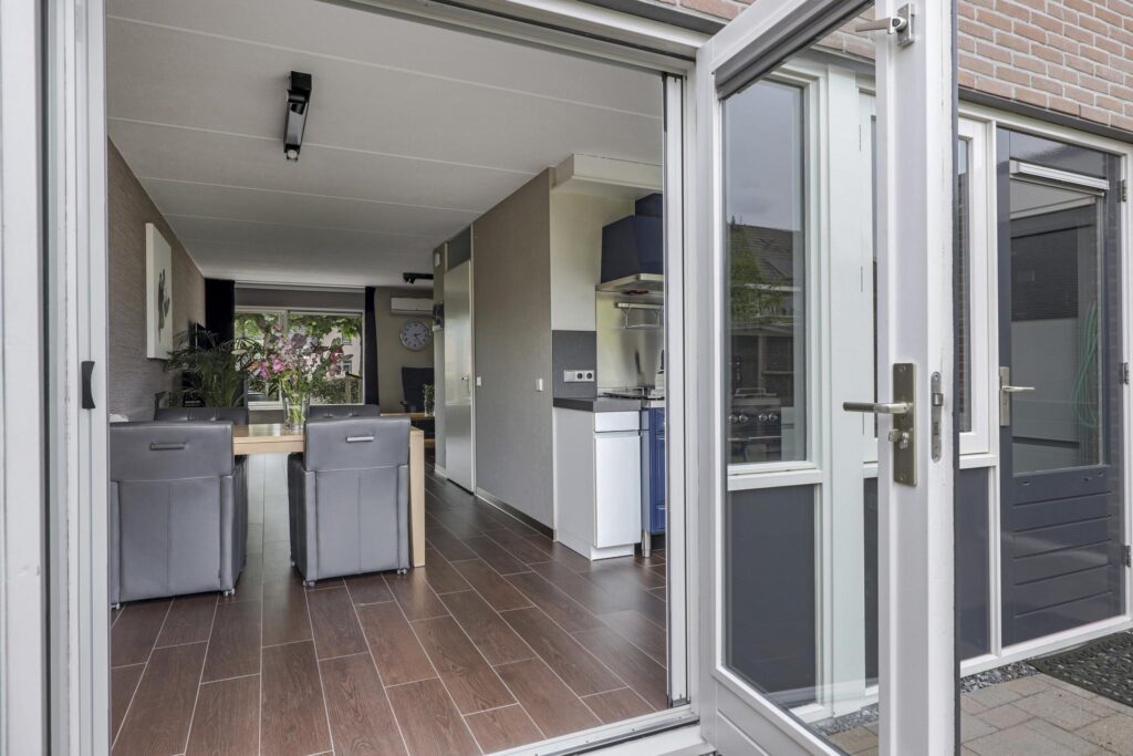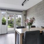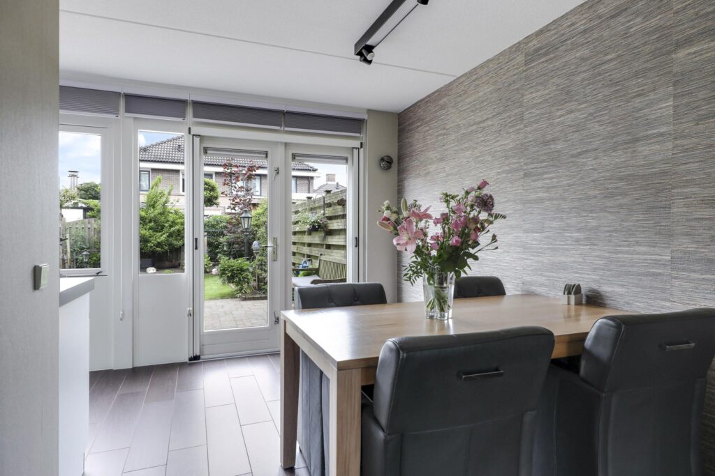 Aan de achterzijde van de woning is de eethoek te vinden. Hier bieden openslaande deuren direct toegang tot de achtertuin.
