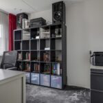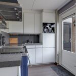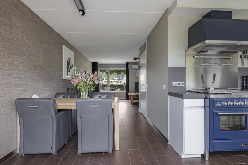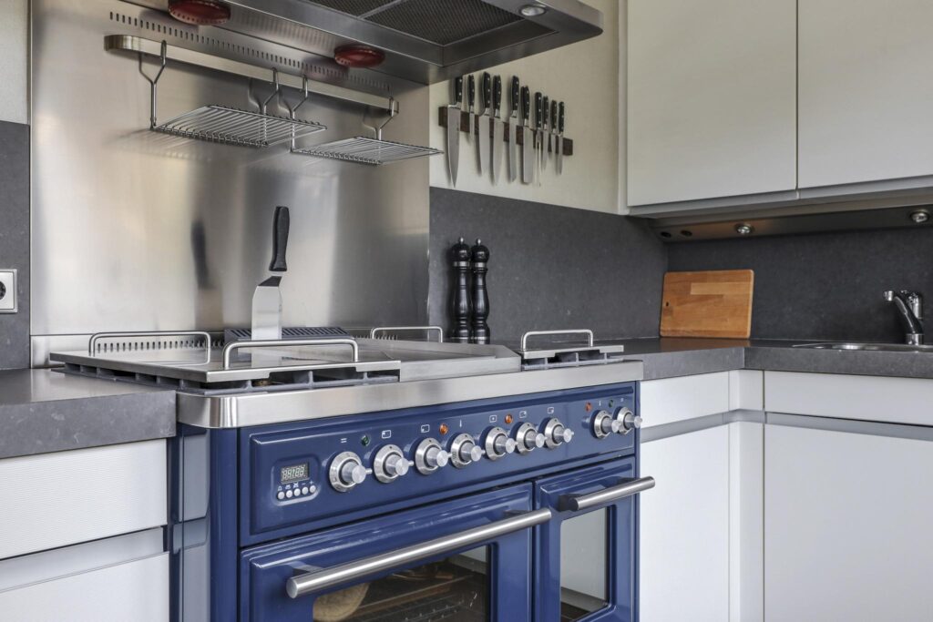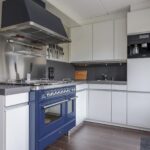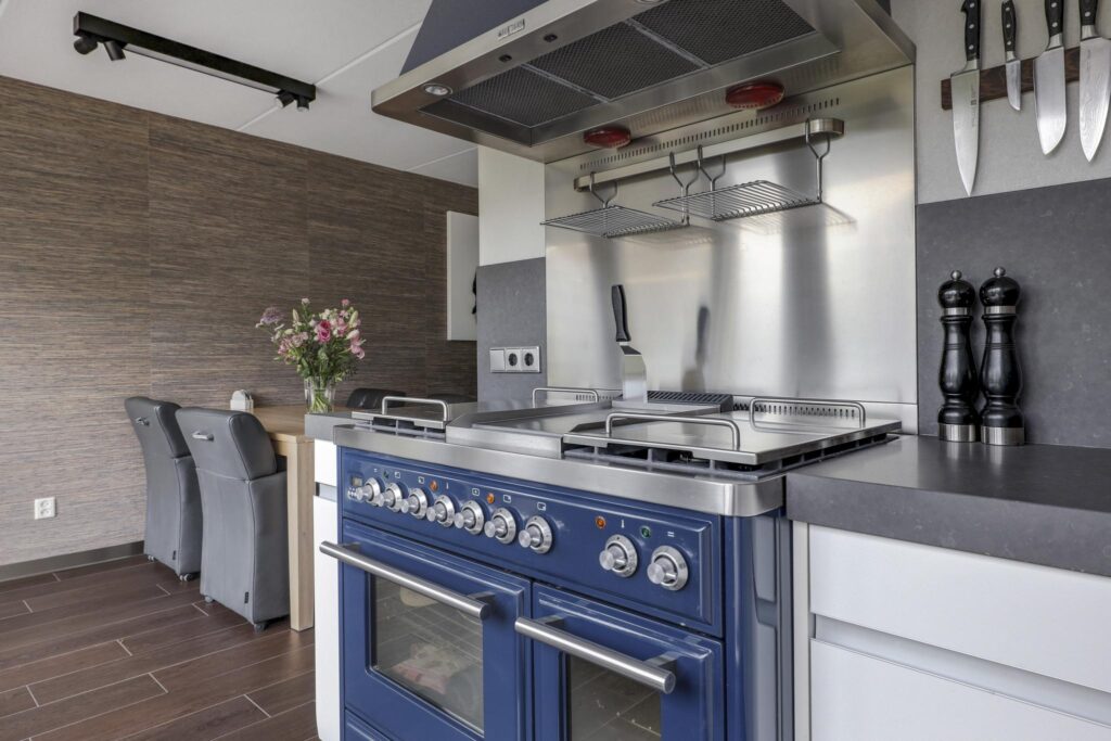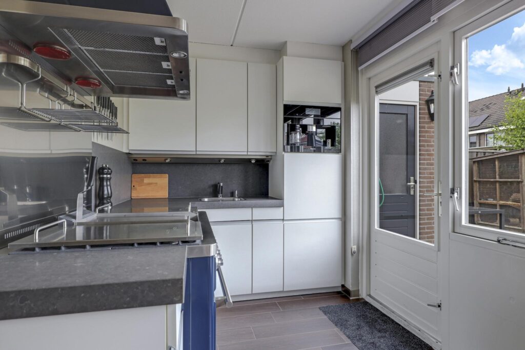 Vanuit de woonkamer loop je door naar de keuken aan de achterzijde. Hier is de keuken te vinden welke is geplaatst in een moderne hoekopstelling. Opvallend is het grote Boretti fornuis welke is voorzien van 2 ovens, 4 gaspitten en een teppanyaki plaat. Uiteraard is er gekozen voor een bijpassende afzuigkap. De inbouwapparatuur bestaat verder uit een vaatwasser (2017), een koelkast (2022) en een koffiemachine (2023). Achter de greeploze fronten van de onder- en bovenkasten treft je veel opbergruimte. Onder deze bovenkasten is tevens spotverlichting geplaatst.