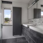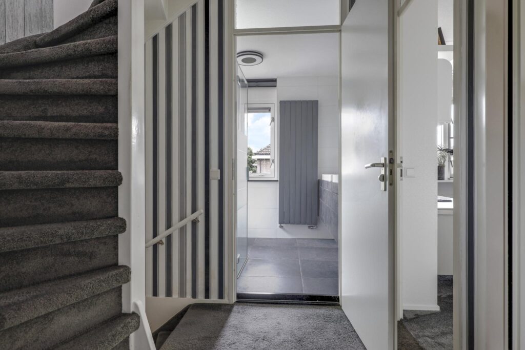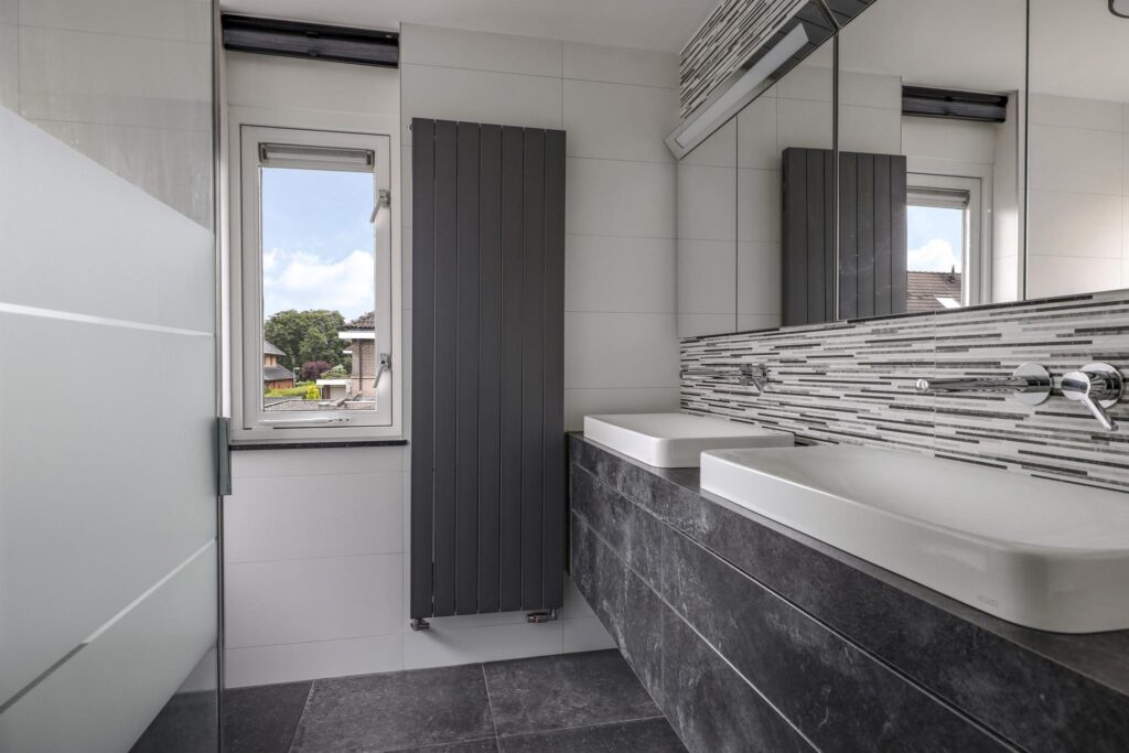 Bij deze woning hoort een stijlvolle, moderne badkamer. De ruimte is in 2018 geheel gemoderniseerd. Er is gekozen voor een opvallend groot wastafelmeubel met 2 wasbakken en kranen die verwerkt zijn in de wand. Boven de wastafels zijn dubbele spiegelkasten geplaatst. Onderliggende lades zorgen voor veel opbergruimte. Een inloopdouche en een 2e (zwevend geplaatst) toilet maken de ruimte compleet. Zeer comfortbal is de aanwezige vloerverwarming waardoor je hier nooit koude voeten hoeft te hebben. Zelfs de handdoekradiator is geheel in stijl met de badkamer geplaatst. 2 Ramen zorgen voor de nodige lichtinval en een ventilatiemogelijkheid. Overigens is er ook mechanische ventilatie aanwezig.