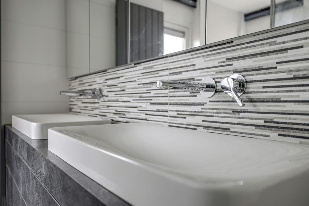 Badkamer met inloopdouche, breed wastafelmeubel en 2e toilet.