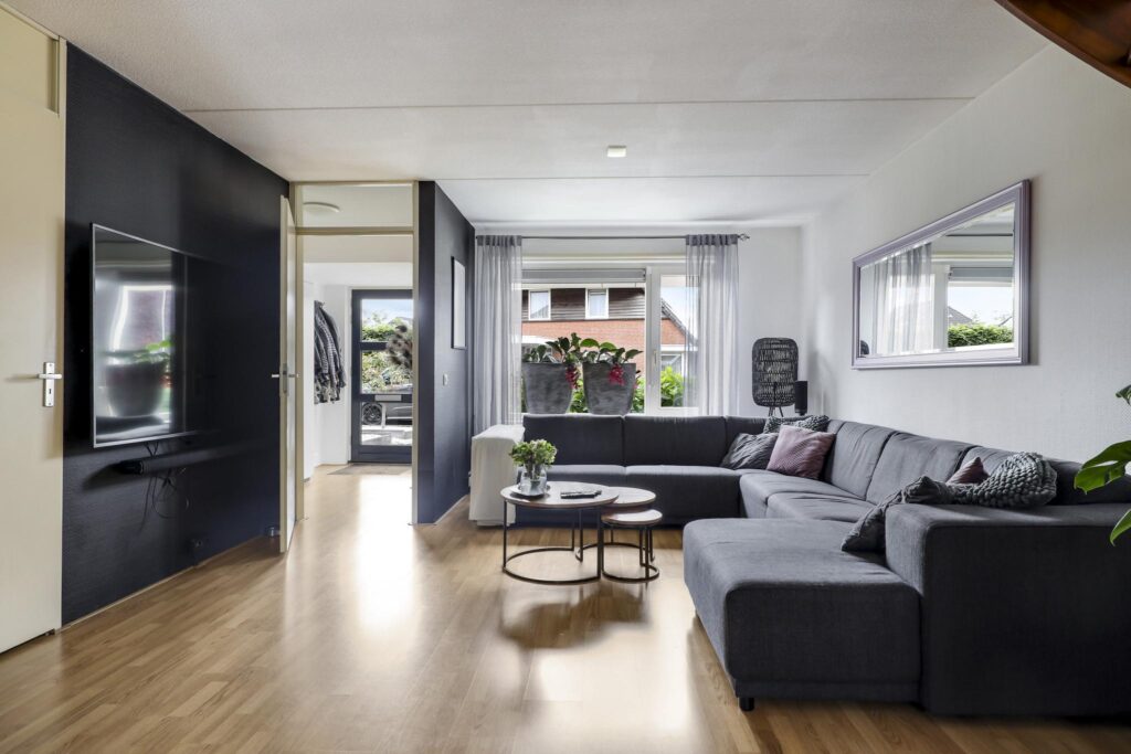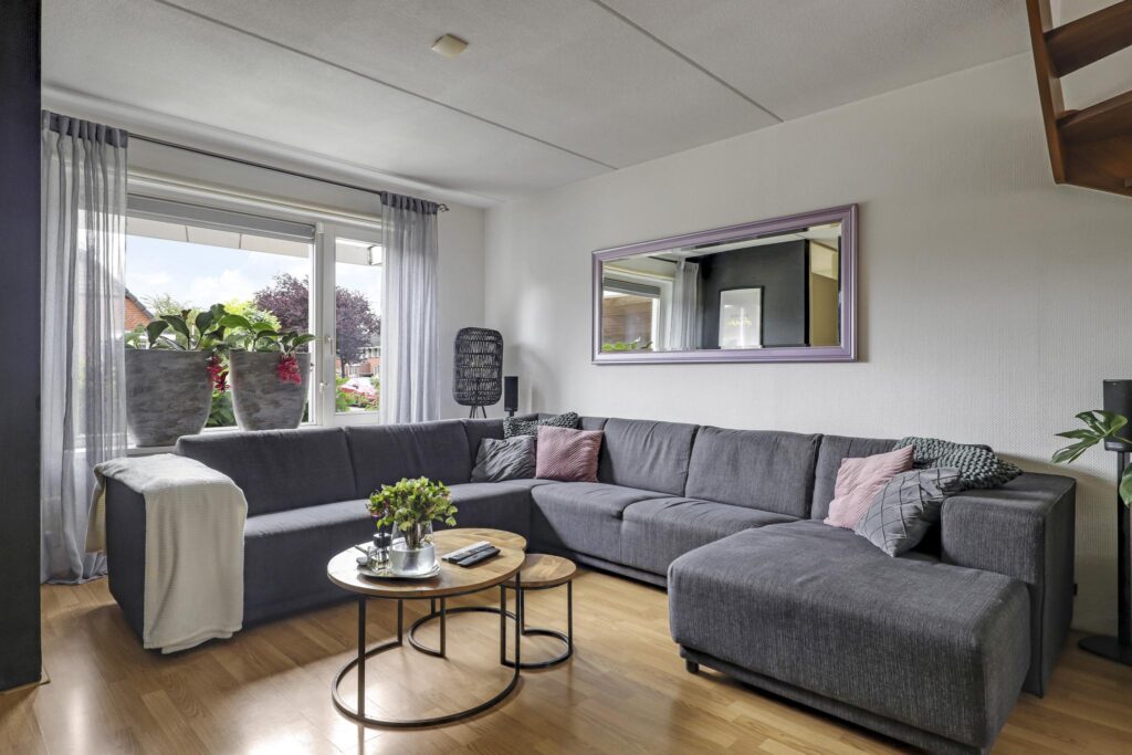 Via de hal/entree komen we in de woonkamer terecht. De woonkamer betreft een ware doorzonwoonkamer met zowel aan de voor- als achterzijde veel lichtinval. De kamer is lekker ruim opgezet waardoor je hier een riante hoekbank kwijt kan. Aan de achterzijde van de woning kan je met gemak een 6-persoons eettafel kwijt. De begane grond is v.v. een laminaatvloer. Ook is er een vaste inloopkast aanwezig, hier vind je naast veel praktische bergruimte ook de opstelling van de cv-ketel.