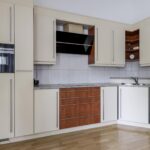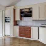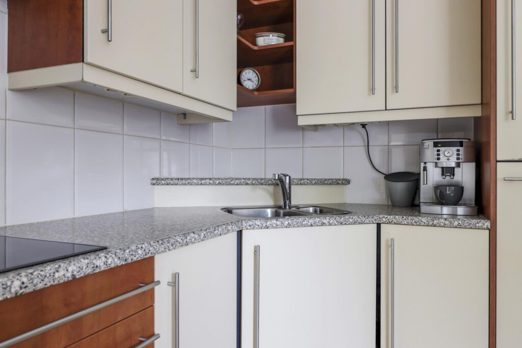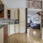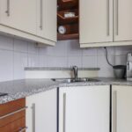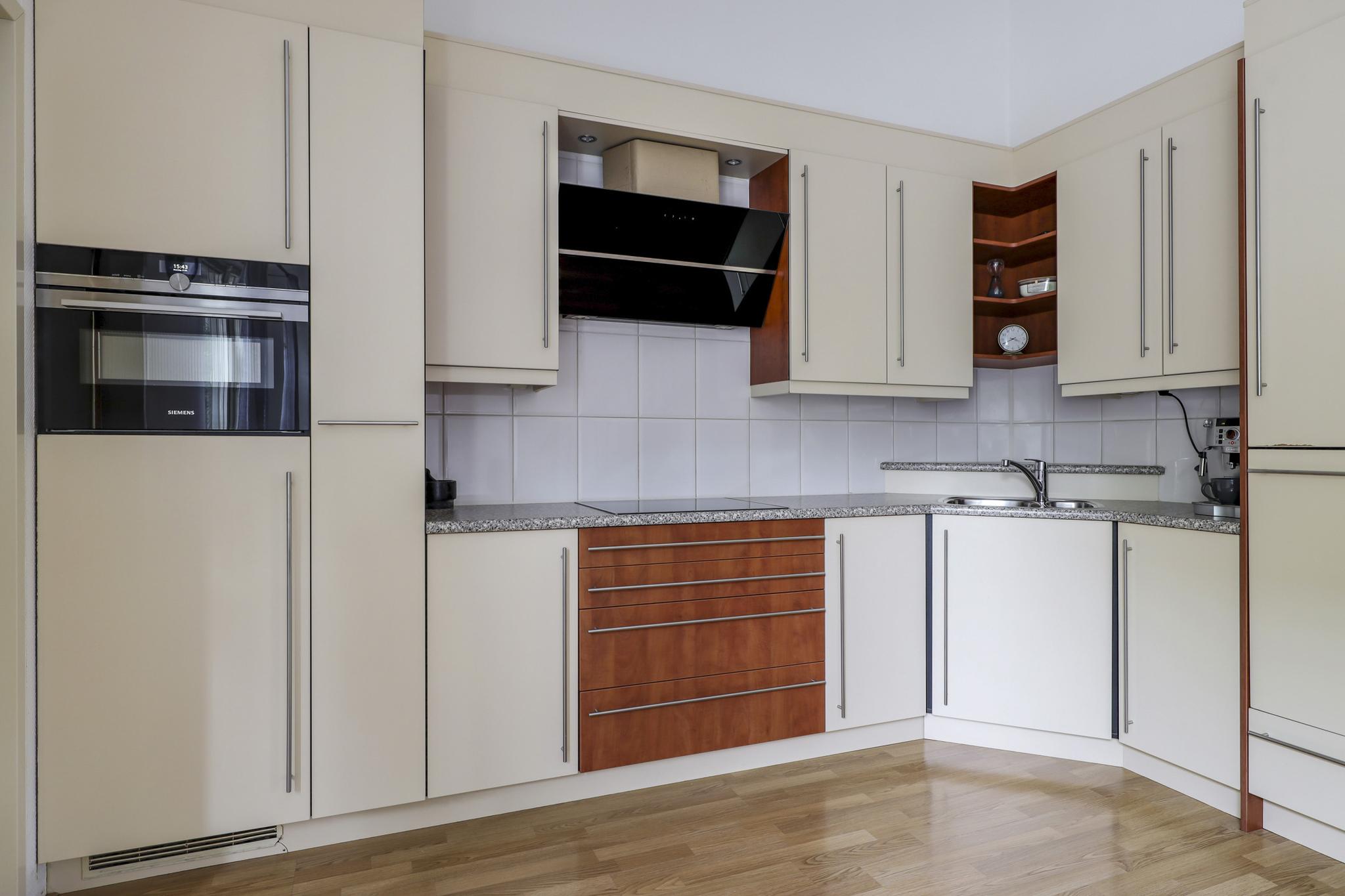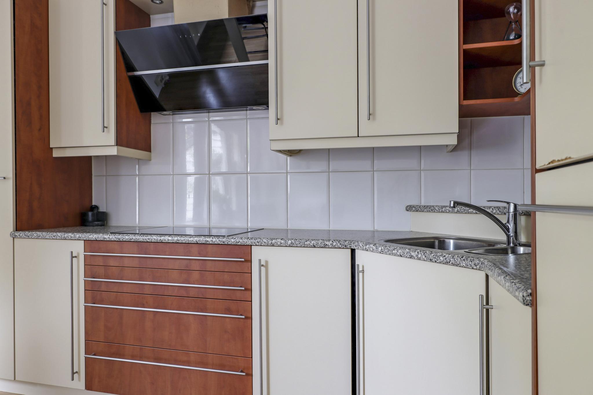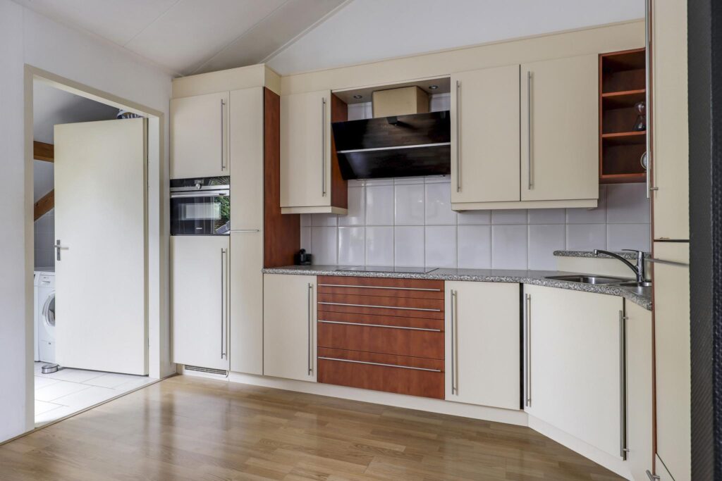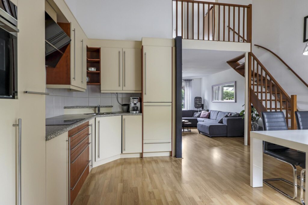 De keuken is aan de achterzijde gelegen en heeft een open karakter naar de woonkamer toe. Opvallend is de vide met haar hoge plafond die door loopt tot aan het schuine dakvlak. Dit geeft niet alleen de keuken maar de gehele woning een extra dimensie wat de woning bijzonder en onderscheidend maakt. Dit speelse karakter zorgt tevens voor een ruimtelijk effect. Er is gekozen voor een ruim keukenblok in een hoekopstelling. Door de bovenkasten heb je hier veel opbergruimte. De keuken is daarbij voorzien van alle wenselijke inbouwapparatuur, zijnde een koelkast, een vaatwasser (op hoogte), 1,5 spoelbak, een combi-oven/magnetron, een 4-pits inductiekookplaat en een moderne afzuigkap. Erg praktisch is de apothekerskast voor veel praktische bergruimte.