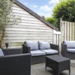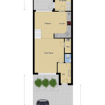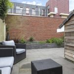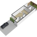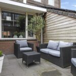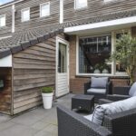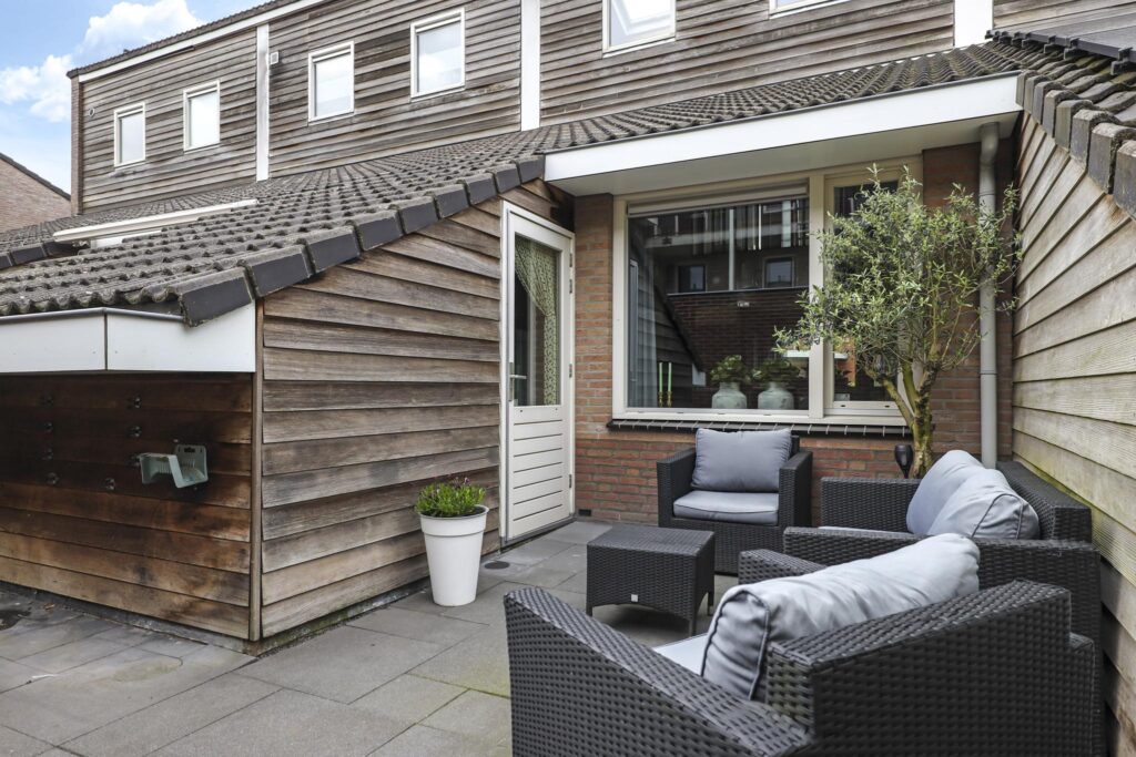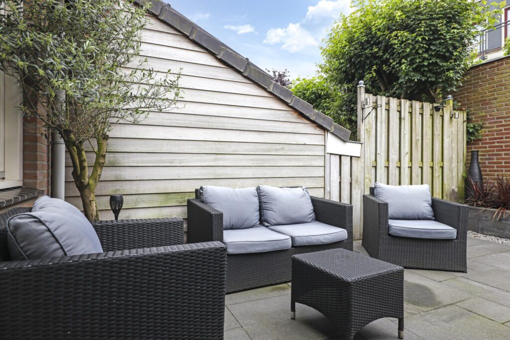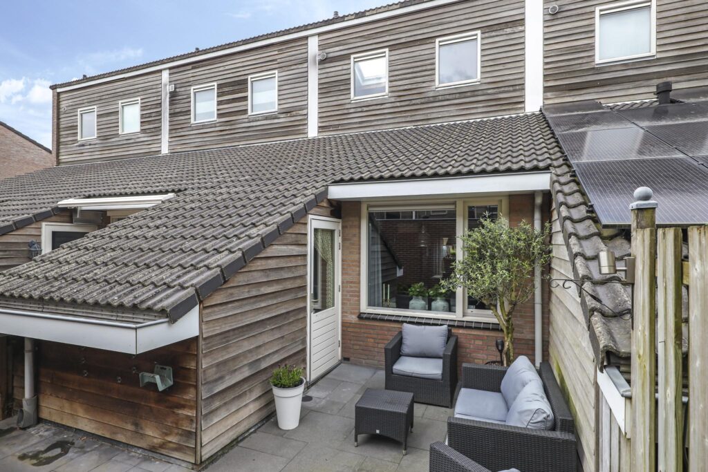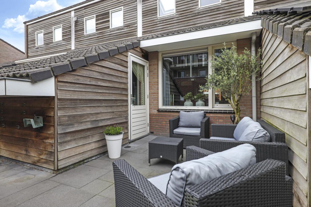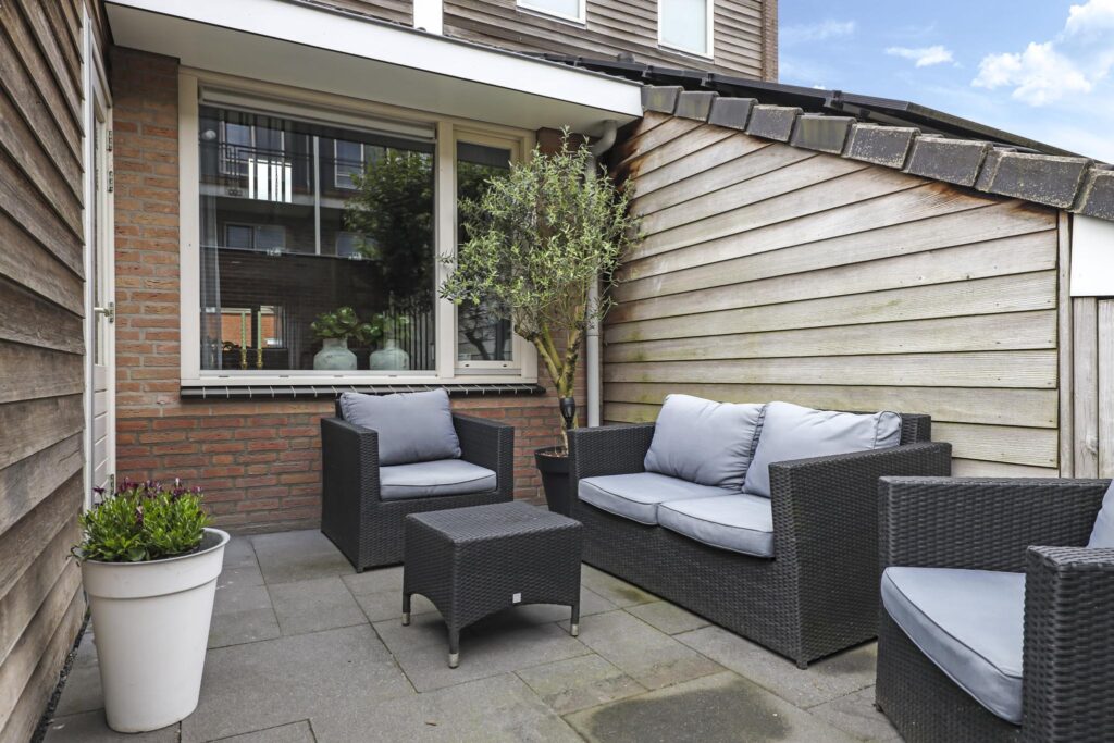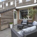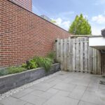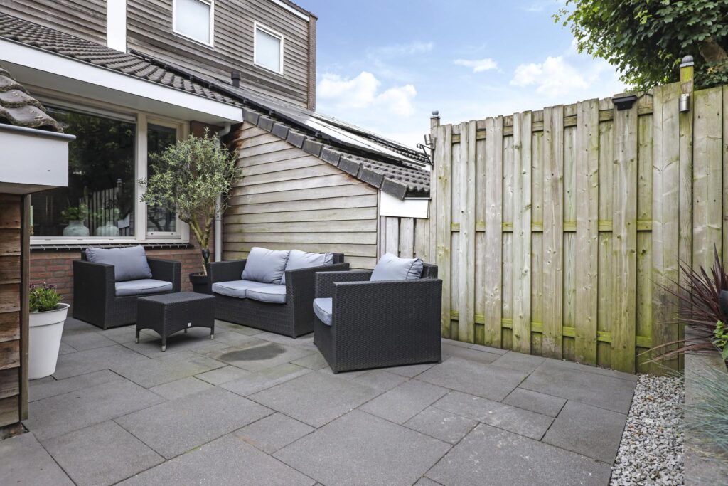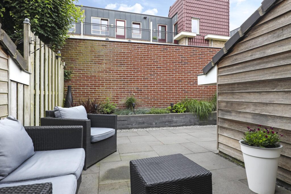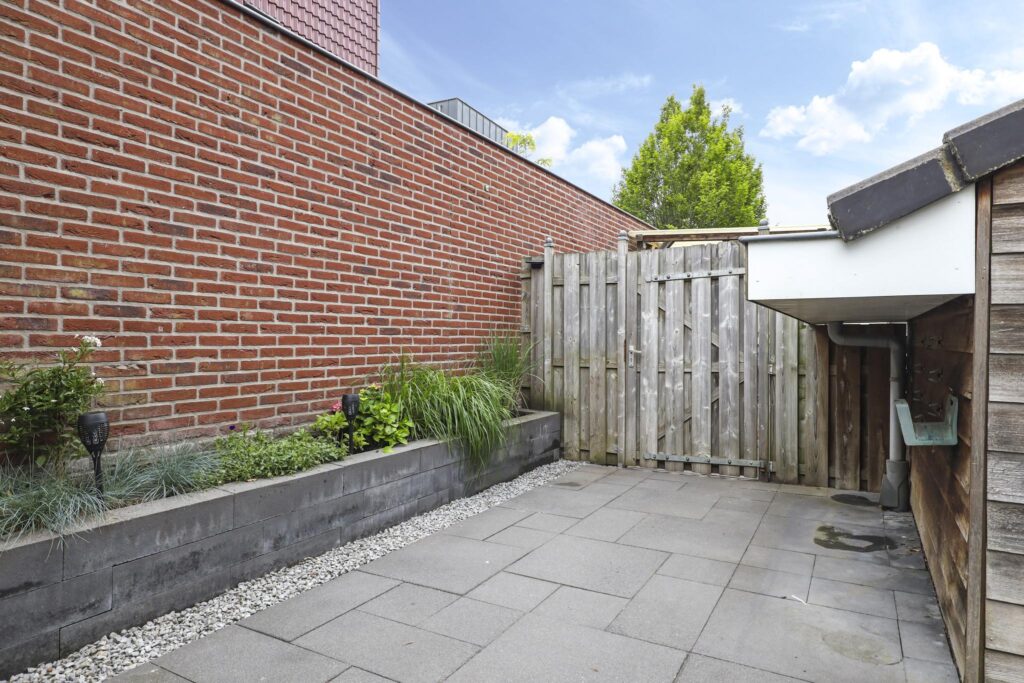 De achtertuin van deze woning kunnen we gezellig noemen. Het is geen grote ruimte maar desondanks kan je hier wel een gezellig zithoek diverse planten kwijt. Er is dan ook slim gekozen voor een groot terras en een border met planten aan de achterzijde van de tuin voor een groene uitstraling. Doordat de daken van deze woningen doorlopen krijg je een speels effect in de tuin. Een pluspunt is de achterom welke zorgt dat je eenvoudig met een fiets in de tuin kan komen.