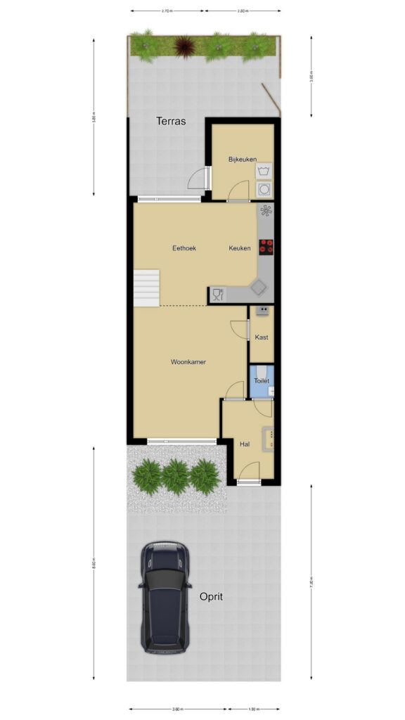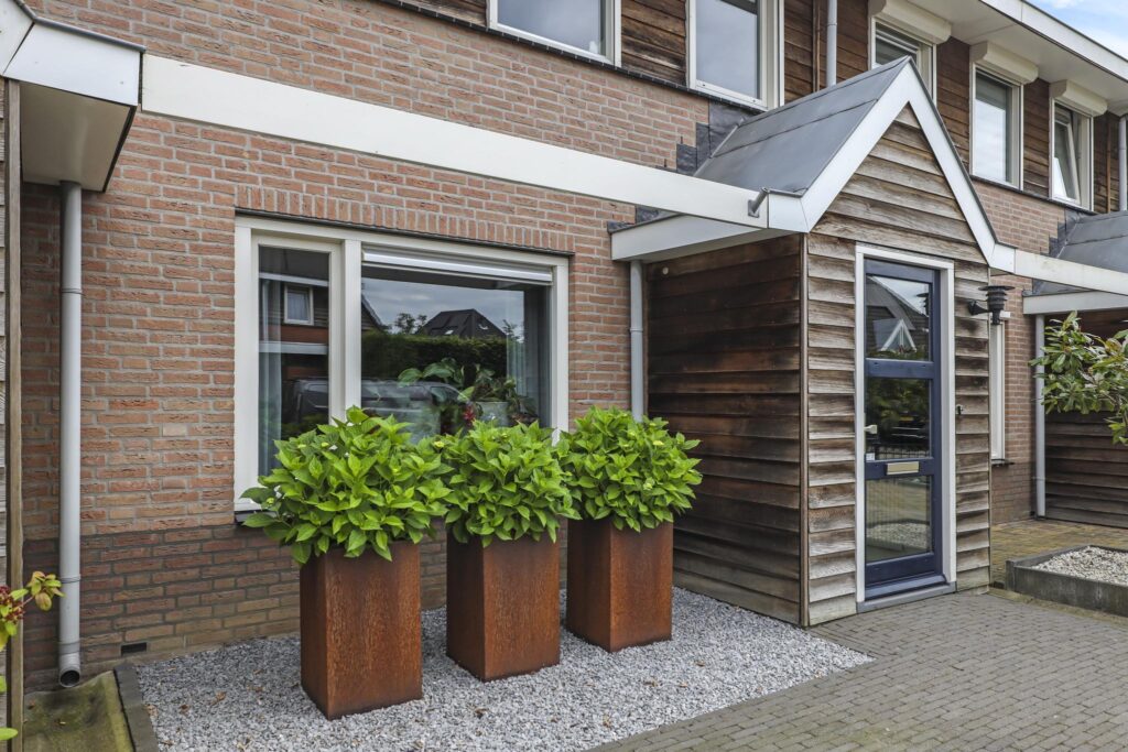 Bij deze woning hoort een opvallend diepe voortuin. Er is gekozen om deze geheel te bestraten wat uiteraard zorgt voor een onderhoudsvriendelijk karakter. Daarnaast biedt het ook de mogelijkheid om de auto op eigen terrein te parkeren, zo hoef je nooit op zoek naar een parkeerplaats. Dit zorgt tevens voor een buffer tussen de straat en de woonkamer.