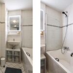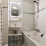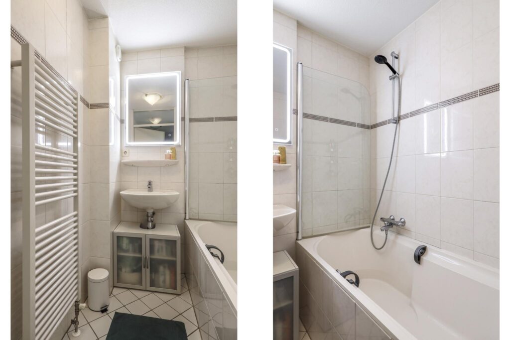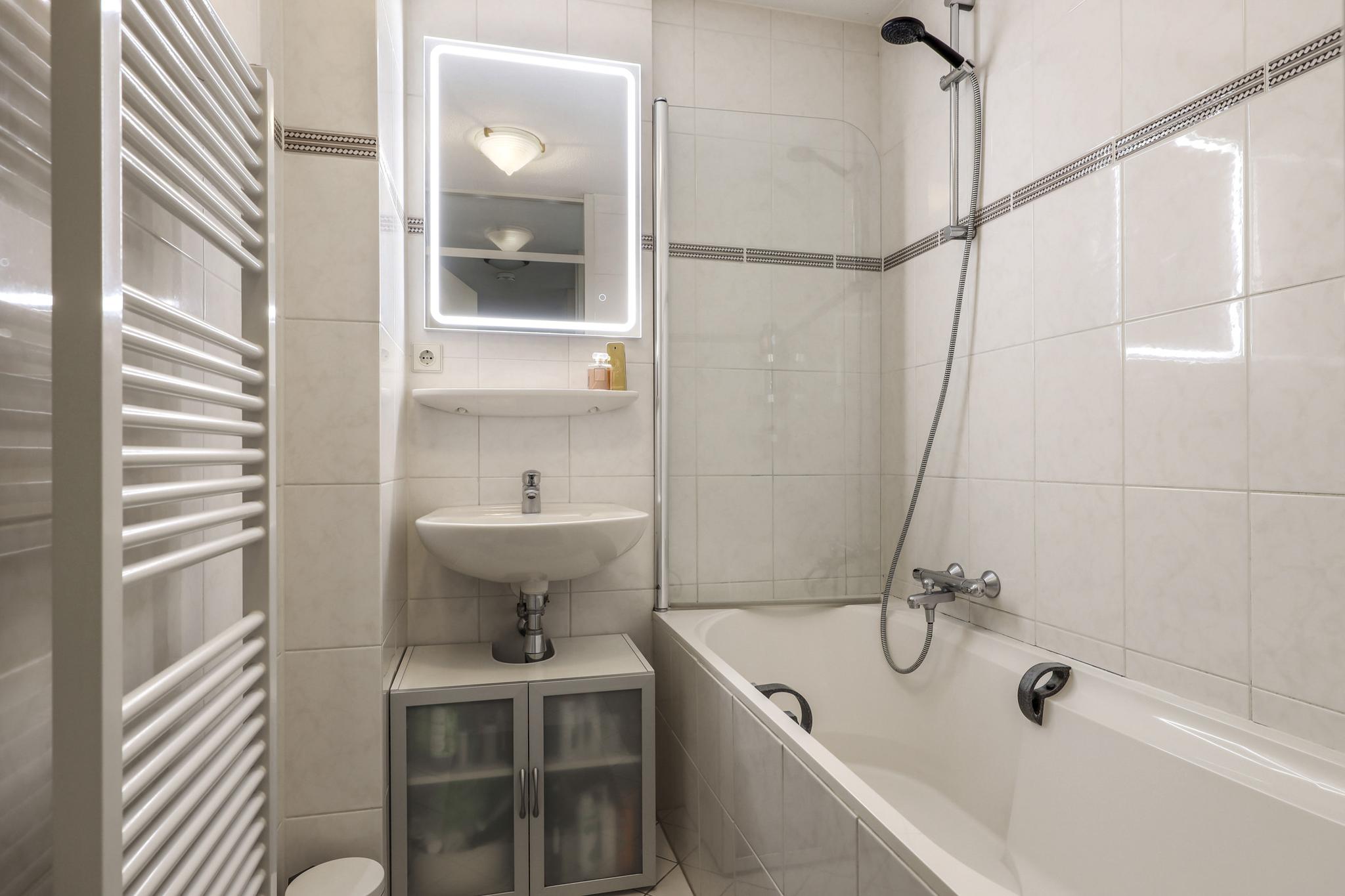 De 3e deur op de overloop is van de badkamer. Deze ruimte is ingedeeld met een ligbad/douche met spatscherm en een wastafel. De ruimte is voorzien van neutraal tegelwerk en ook de handdoekradiator ontbreekt hier niet. De ruimte is niet groot, indien je ervoor kiest om het ligbad te vervangen voor een inloopdouche, dan zou er ruimte ontstaan om een 2e toilet te plaatsen. Om de badkamer te kunnen ventileren is er mechanische ventilatie aanwezig.