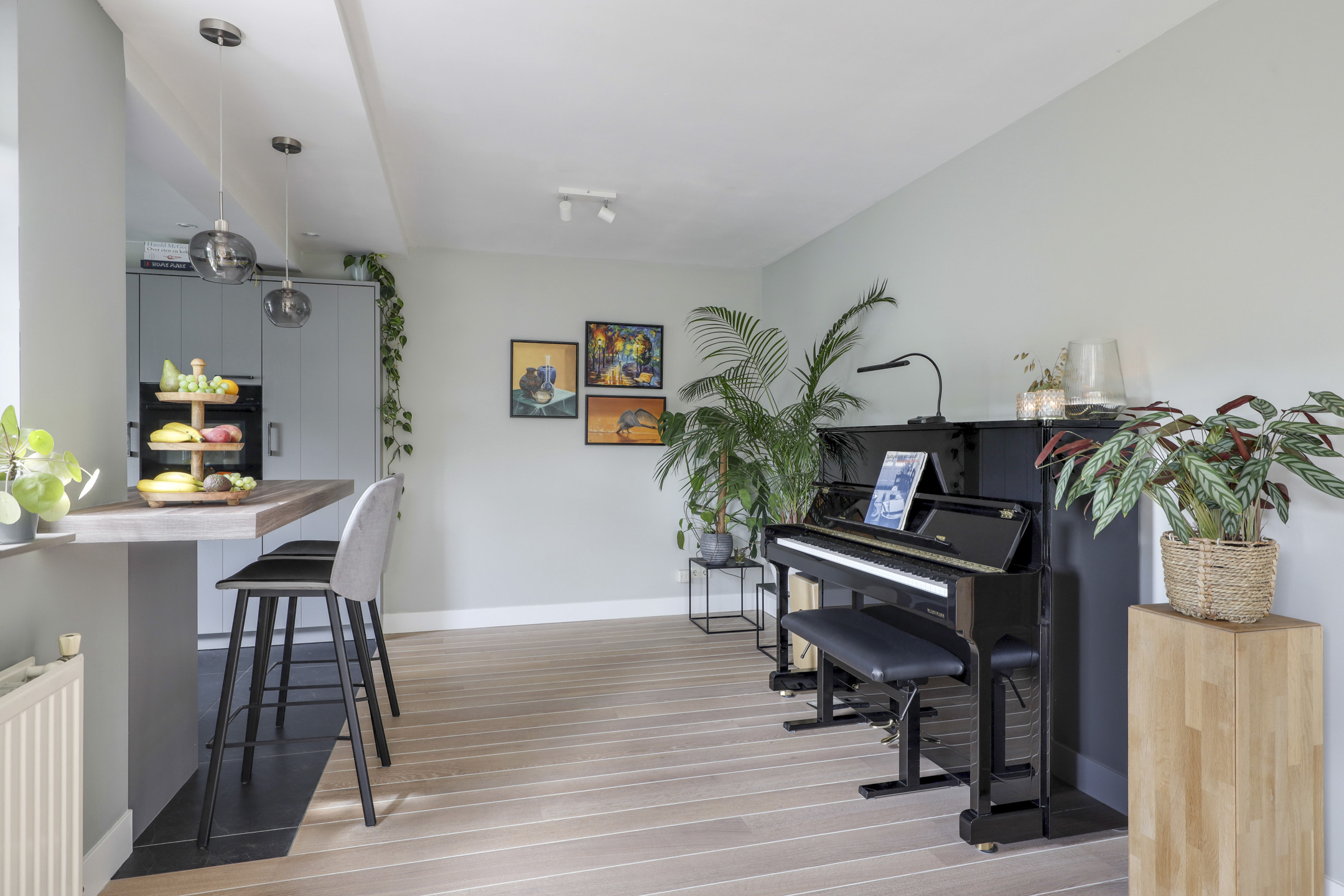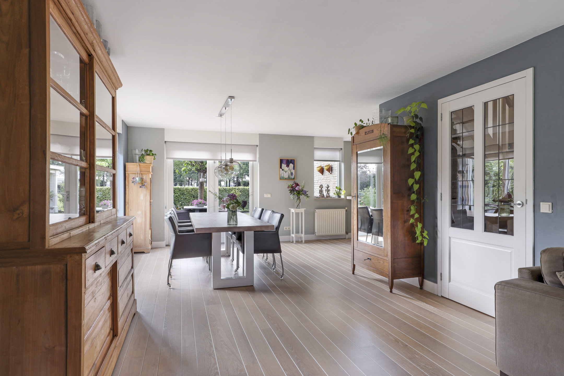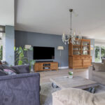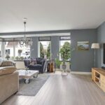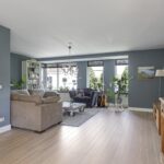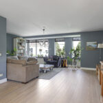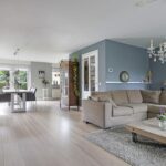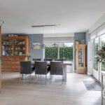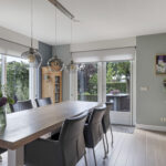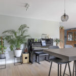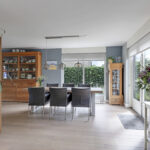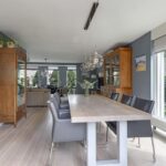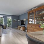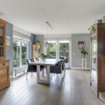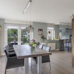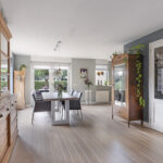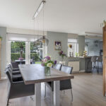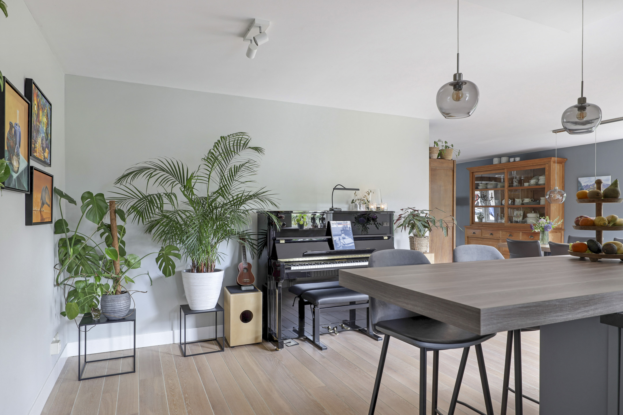 We mogen hier zeker spreken van een living aangezien de woonkamer maar liefst 57m² telt. De woonkamer voelt dan ook ruimtelijk aan waarbij er meerdere zithoeken zijn te creëren. Zoek je een hoekje voor de piano of de computer, dan hoeft dat hier geen enkel probleem te zijn. De erker aan de voorzijde zorgt voor een speels effect. Ook de openslaande tuindeuren naar het buitenterras geven een vrij en ruimtelijk gevoel. Opvallend is daarbij de lichtinval wat van 3 zijden van de woning de woonkamer binnenkomt. De wanden én het plafond zijn strak gestuct wat zorgt voor een nette afwerking. De massief eikenhouten vloer ligt verlijmd waardoor deze er strak uitziet. Deze living nodigt je graag uit als gezin samen veel uren door te brengen.