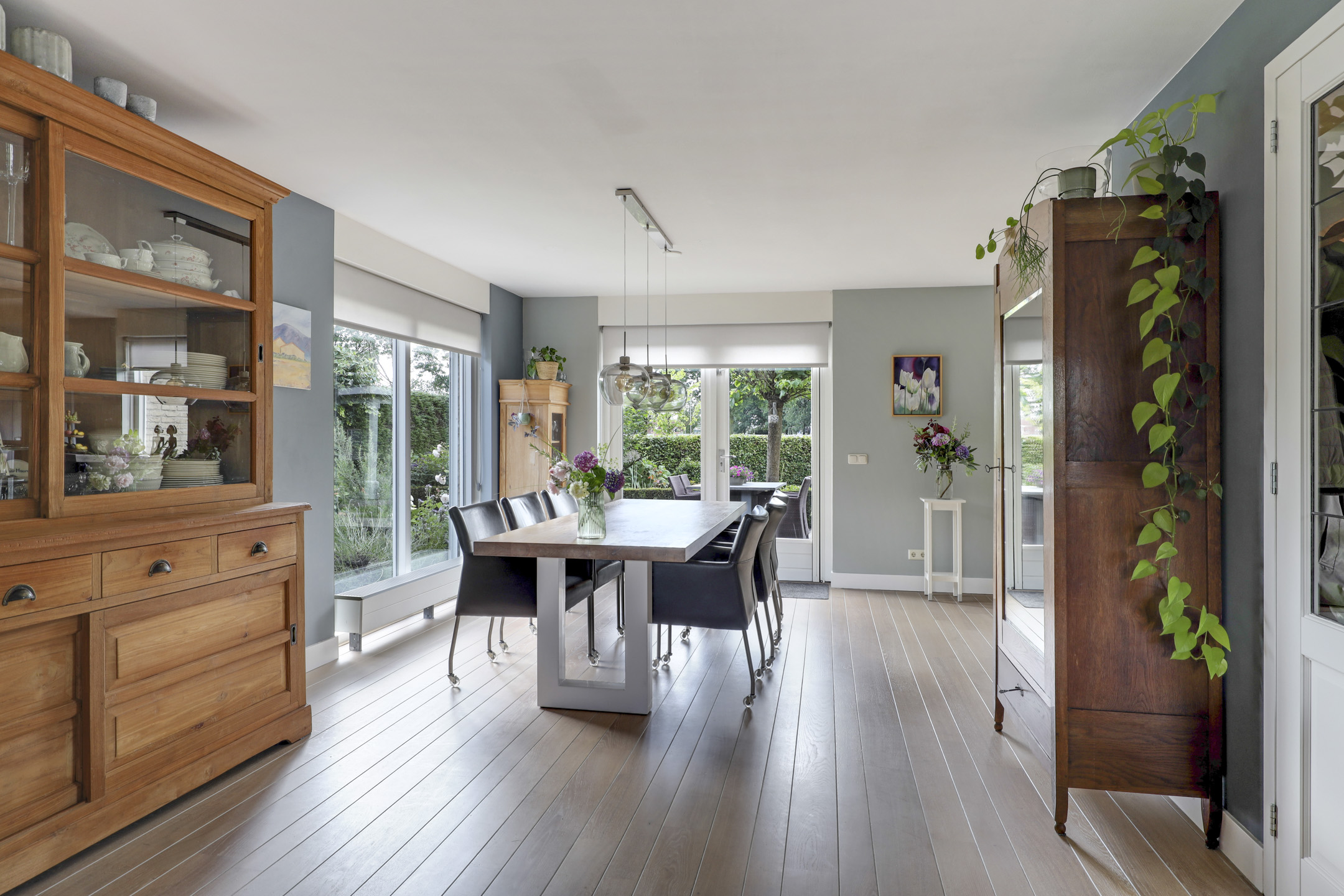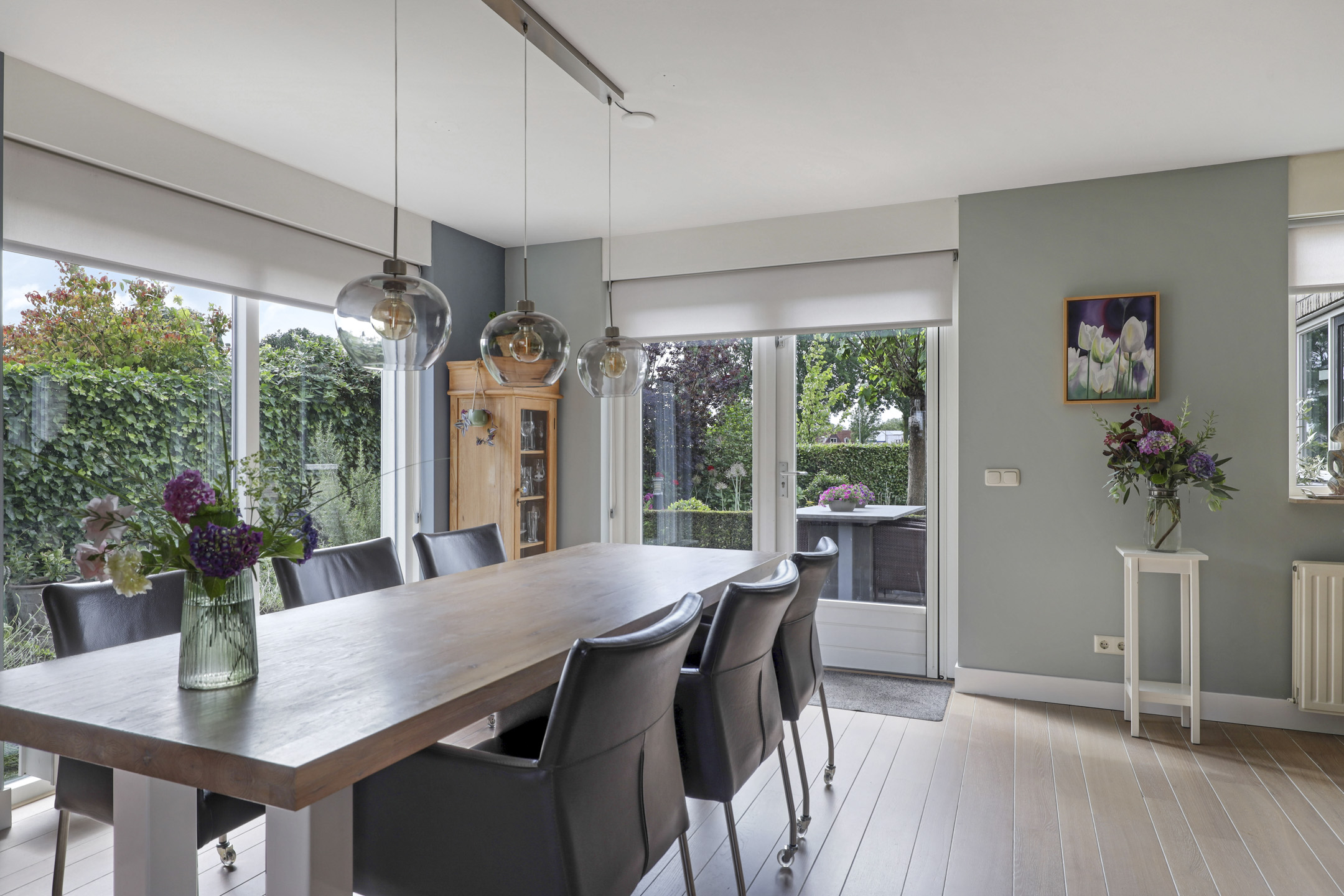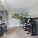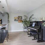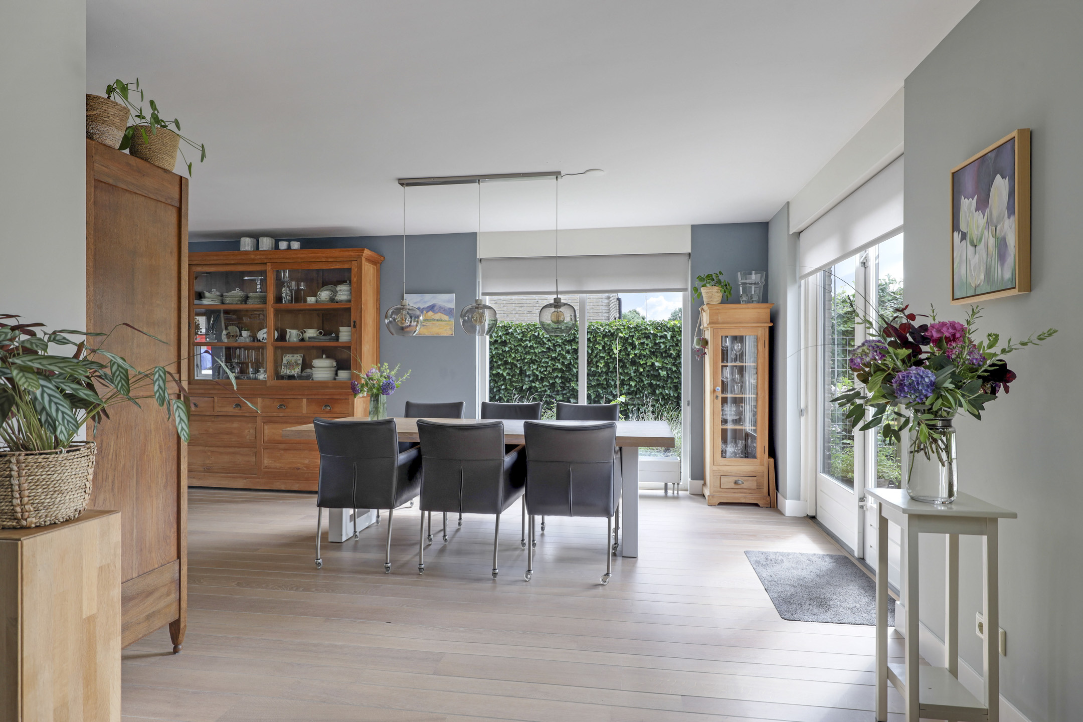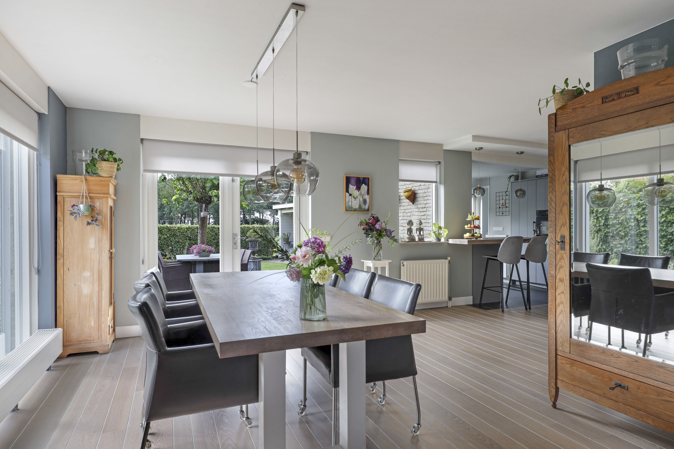 We mogen hier zeker spreken van een living aangezien de woonkamer maar liefst 57m² telt. De woonkamer voelt dan ook ruimtelijk aan waarbij er meerdere zithoeken zijn te creëren. Zoek je een hoekje voor de piano of de computer, dan hoeft dat hier geen enkel probleem te zijn. De erker aan de voorzijde zorgt voor een speels effect. Ook de openslaande tuindeuren naar het buitenterras geven een vrij en ruimtelijk gevoel. Opvallend is daarbij de lichtinval wat van 3 zijden van de woning de woonkamer binnenkomt. De wanden én het plafond zijn strak gestuct wat zorgt voor een nette afwerking. De massief eikenhouten vloer ligt verlijmd waardoor deze er strak uitziet. Deze living nodigt je graag uit als gezin samen veel uren door te brengen.