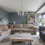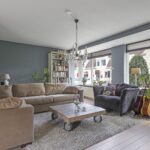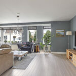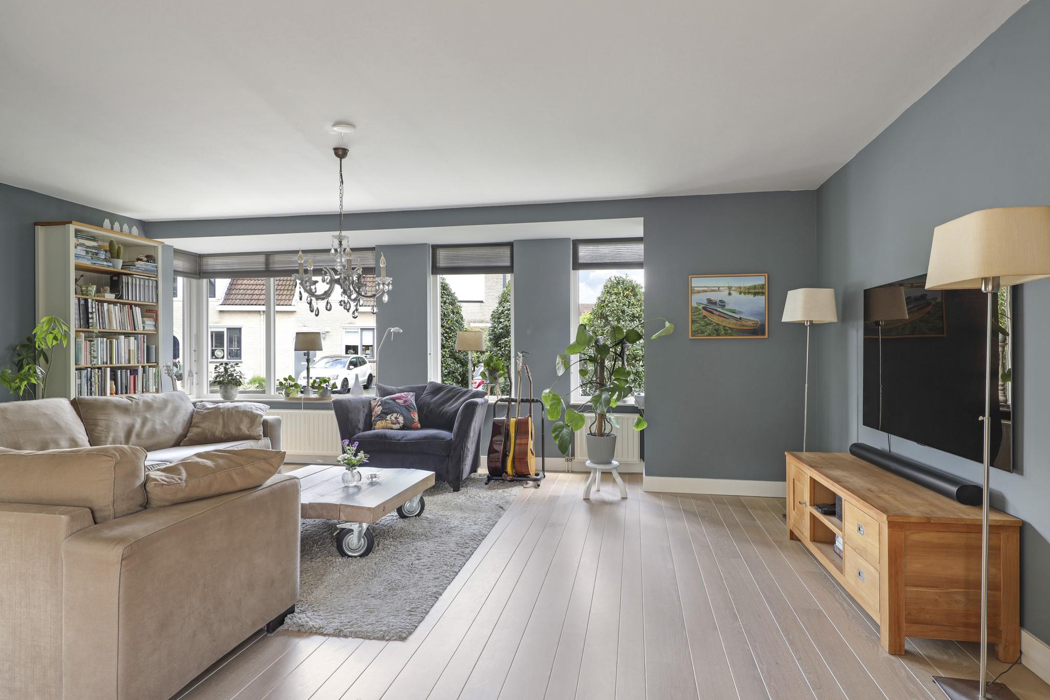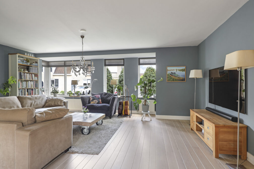 Woonkamer met veel lichtinval en dubbele terrasdeuren en erker