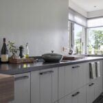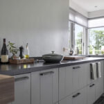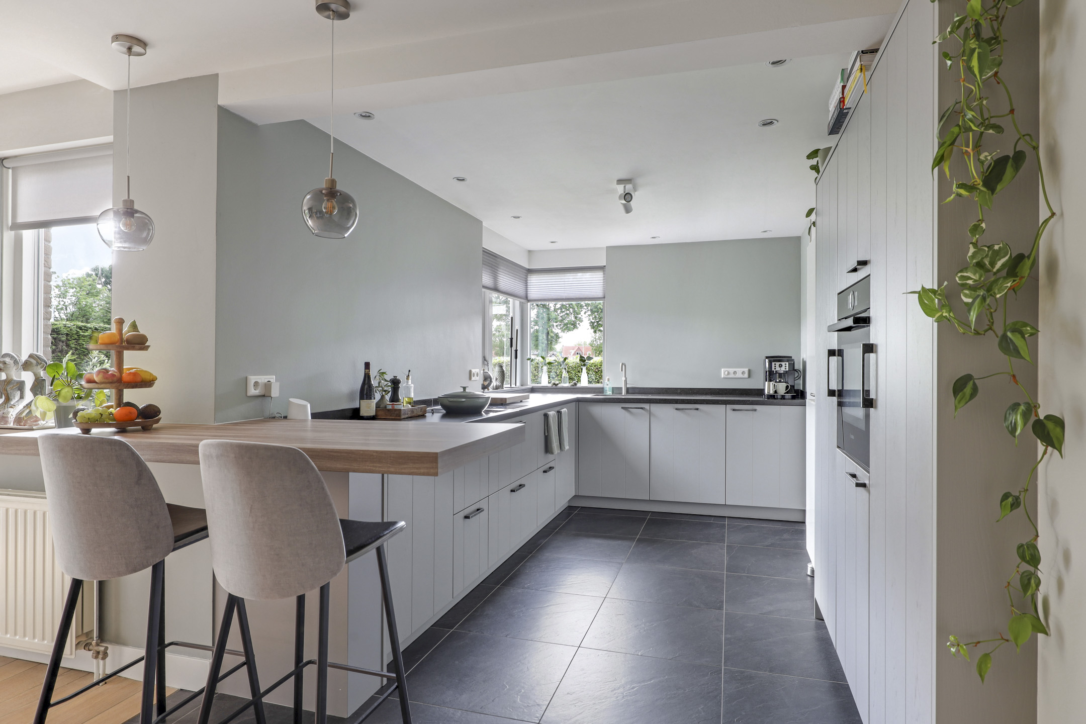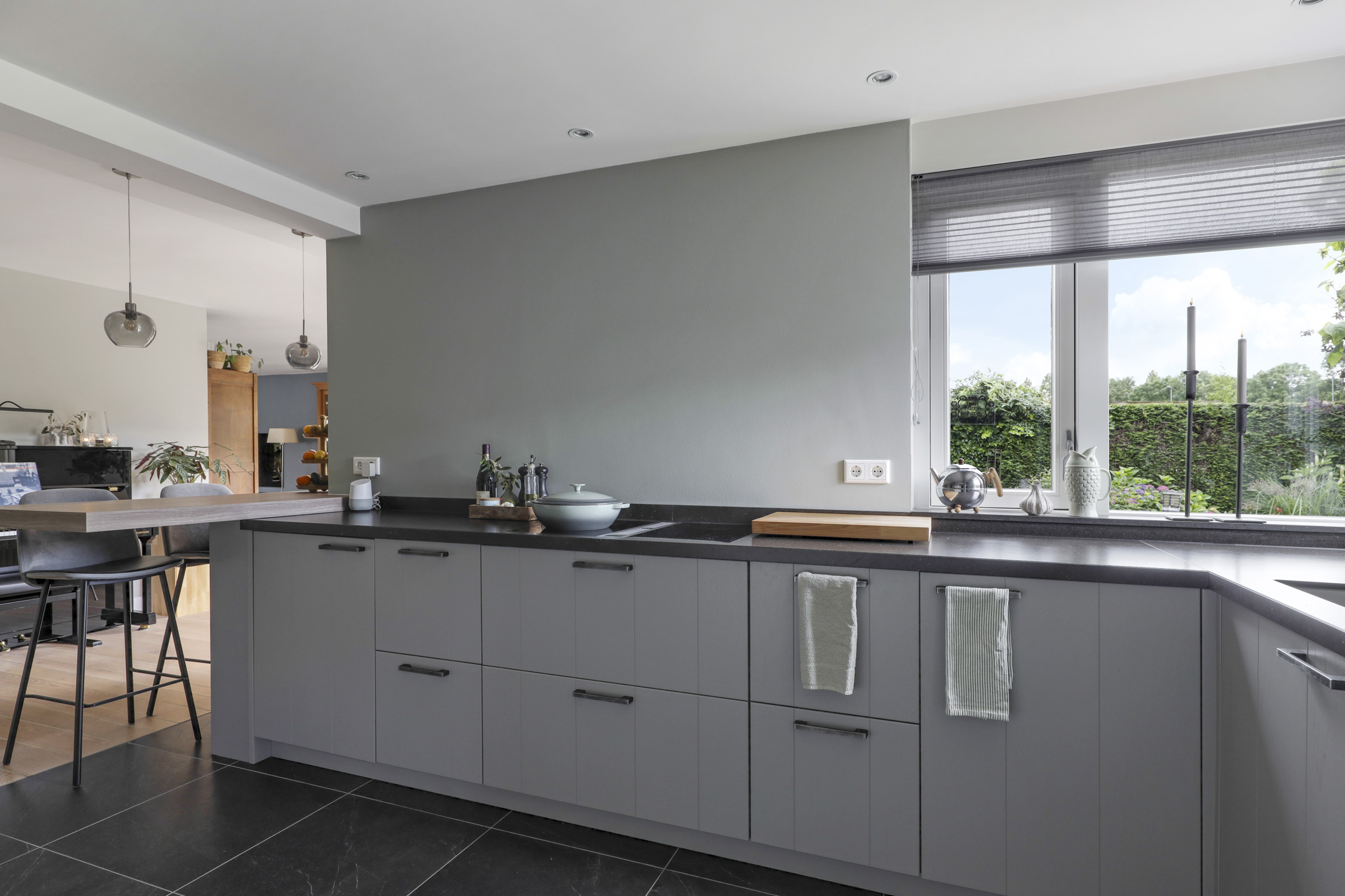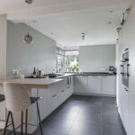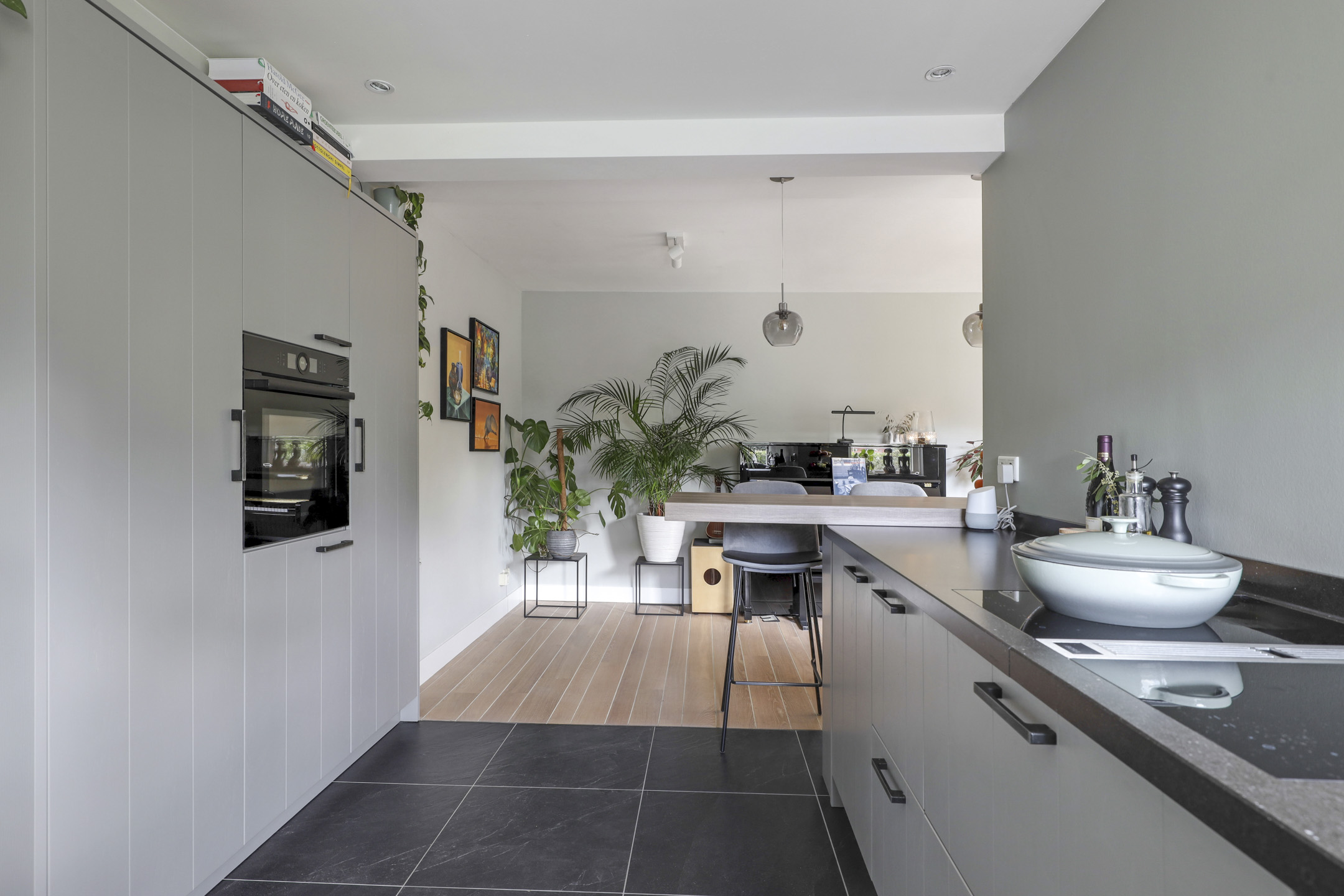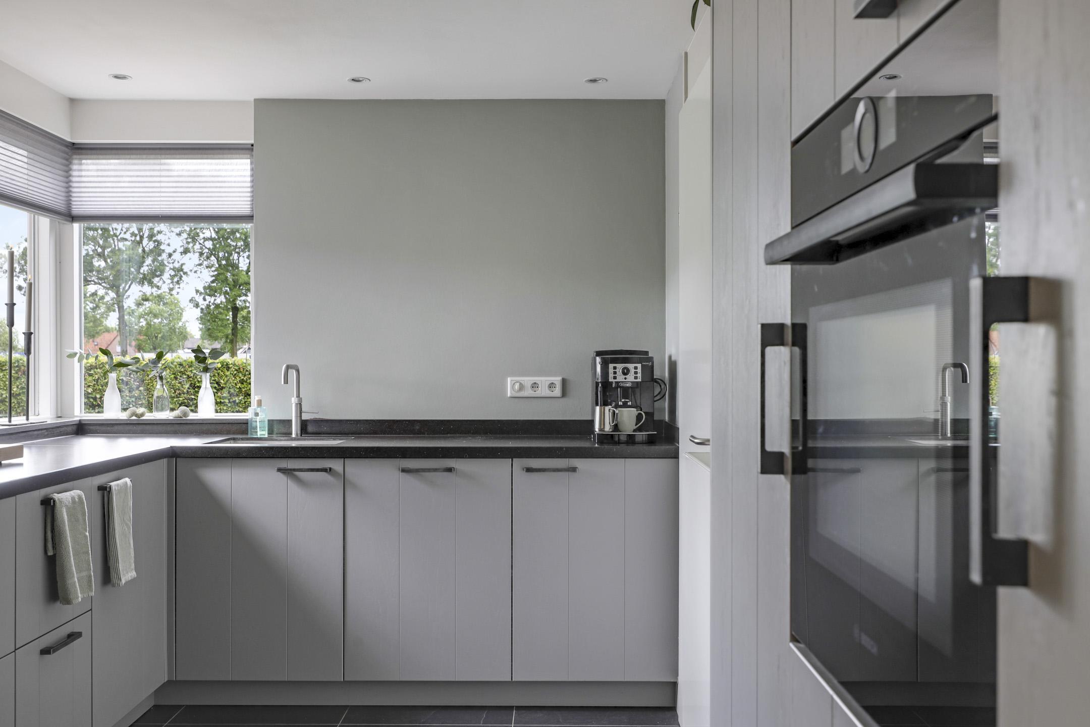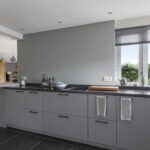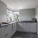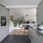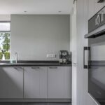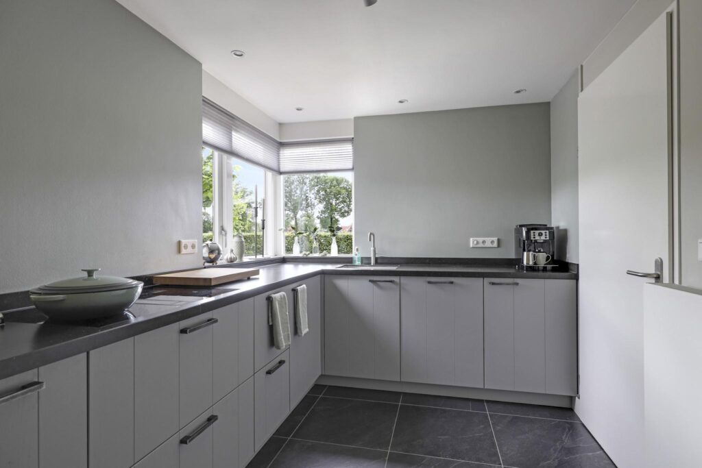 De keuken is aan de achterzijde gelegen en heeft een open verbinding met de woonkamer. Een zeer groot pluspunt is dat de keuken in 2020 geheel vernieuwd is waarbij er is gekozen voor een neutrale maar toch zeer stijlvolle mat grijze keuken met natuurstenen werkblad (composiet). Dit geeft de keuken een luxe uitstraling. Er is gekozen voor een hoekopstelling met veel ruimte door o.a. een Le Mans pannencarrousel in combinatie met een hoge kastenwand welke is voorzien van veel inbouwapparatuur. De inbouwapparatuur bestaat uit een Bora Classic 4-pits inductiekookplaat met geïntegreerde afzuiger, een vaatwasser, een grote koelkast en een combi-oven/magnetron, allen Bosch. Een Quooker zorgt dat er direct kokend water uit de kraan komt. Een leuk detail is hier het hoekraam waardoor je hier een fijn zicht hebt in de achtertuin. Elke kookliefhebber zal deze keuken kunnen waarderen!
