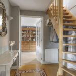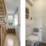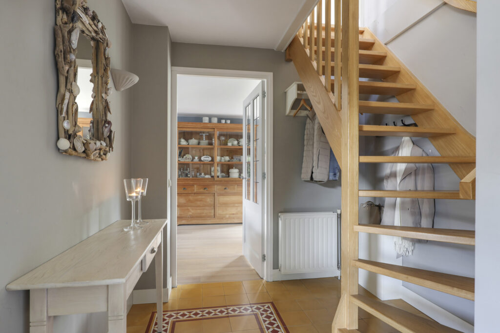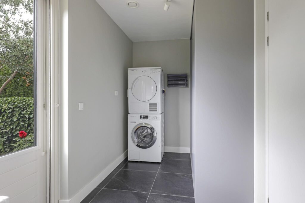 De bijkeuken is super praktisch, is ruim opgezet en heeft een vaste schuif/kastenwand waar je de nodige spullen/voorraad kunt opbergen. Ook vinden we hier de wasmachine- en wasdrogeropstelling terug. De plavuizen vloer in de keuken is hier mooi doorgetrokken. Vanuit de bijkeuken is ook de achtertuin en de inpandige garage bereikbaar.