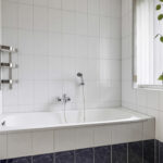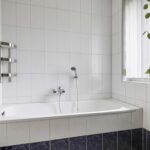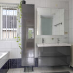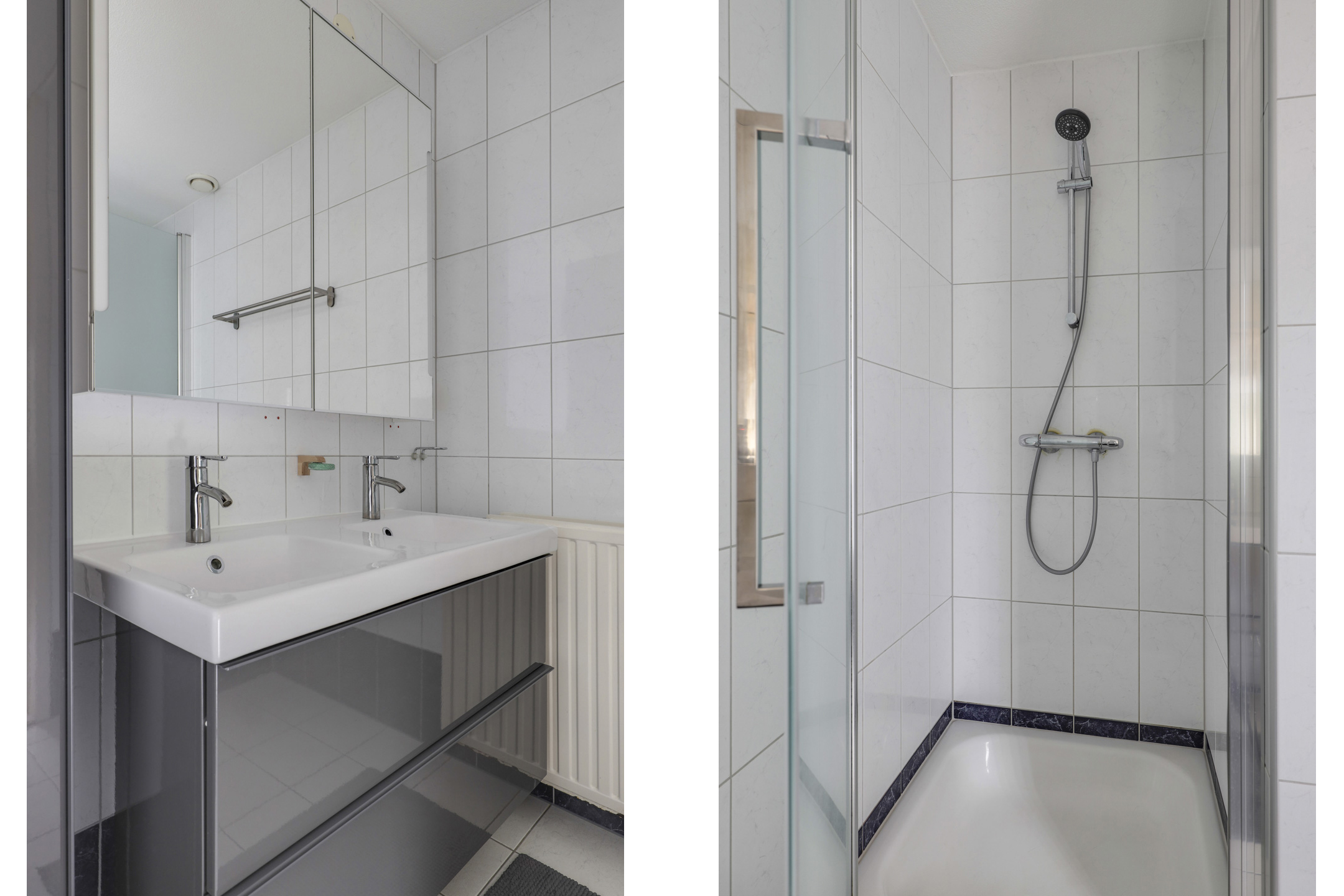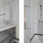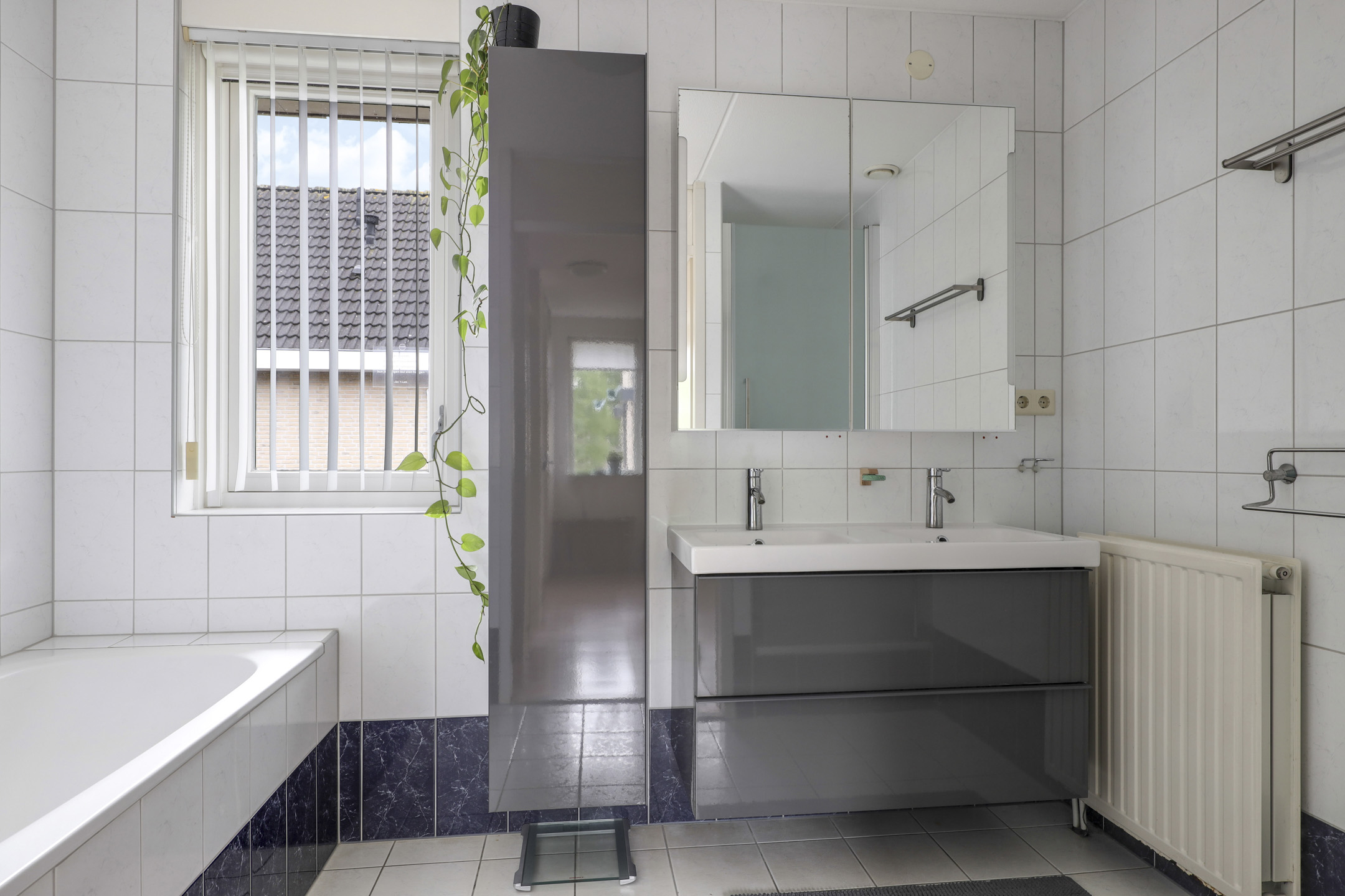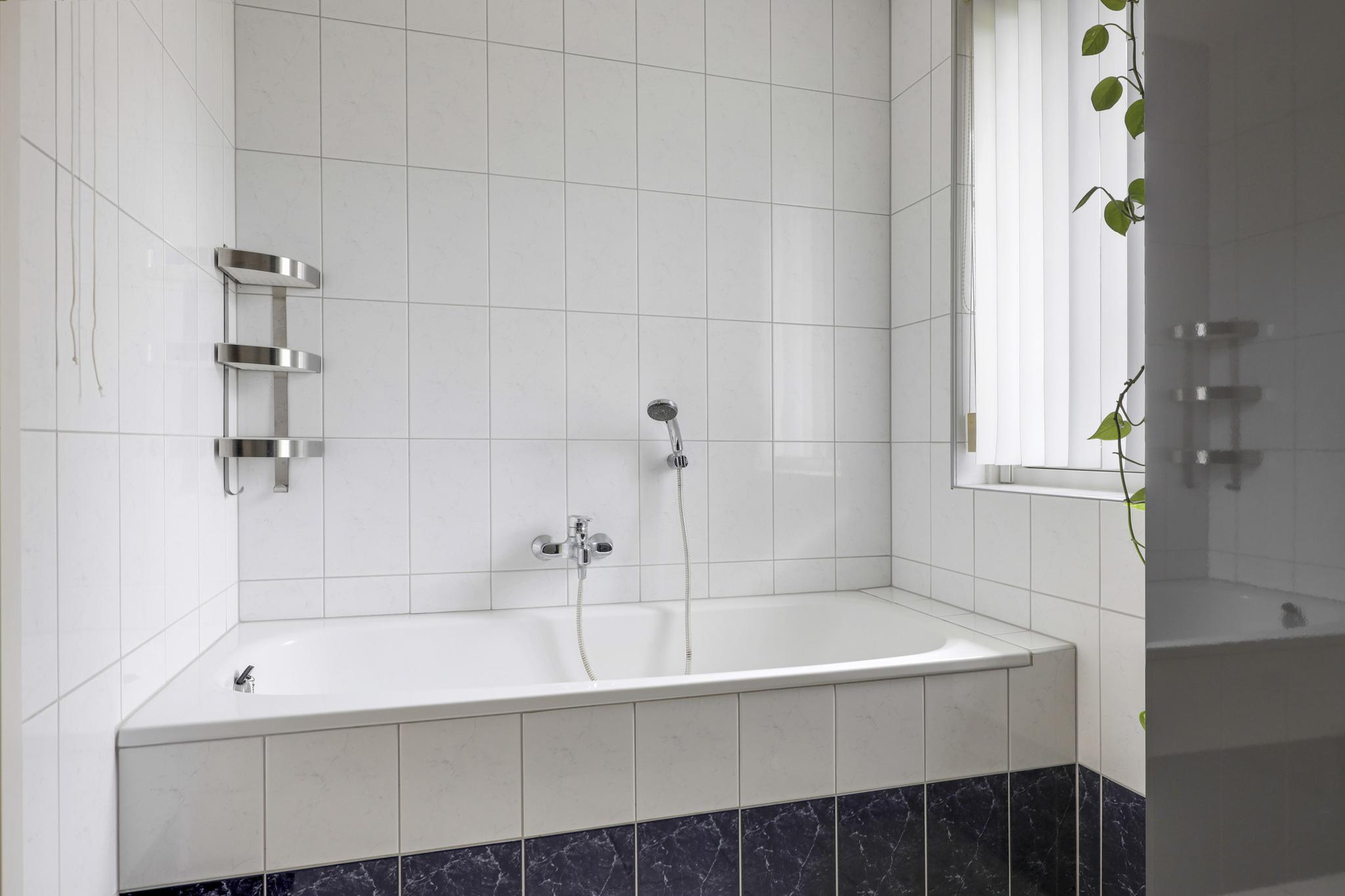 Tussen de slaapkamers in, is de badkamer gelegen. Deze heeft een goed formaat en heeft een eigen raam met daglichttoetreding. De ruimte is ingedeeld met een ligbad, een douchecel en een wastafelmeubel. Het wastafelmeubel is voorzien van 2 spoelbakken met daaronder brede ladekorven. Achter de spiegel is nog meer opbergruimte verstopt. Het raam biedt een handige ventilatiemogelijkheid, uiteraard is er ook mechanische ventilatie aanwezig.