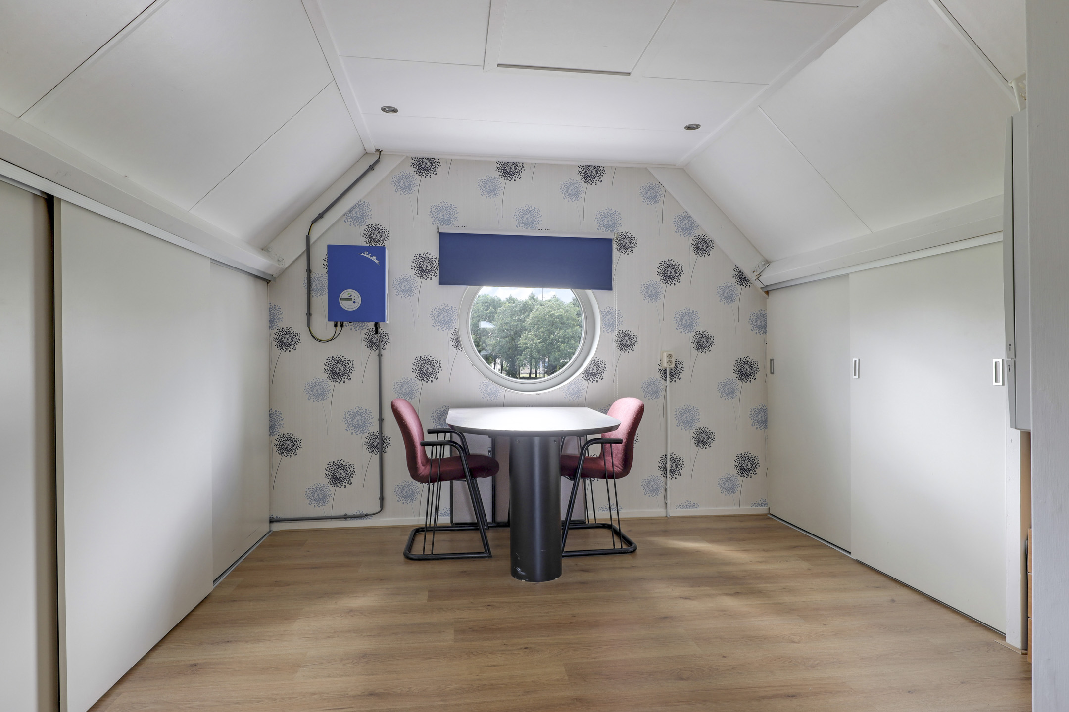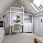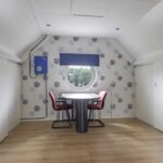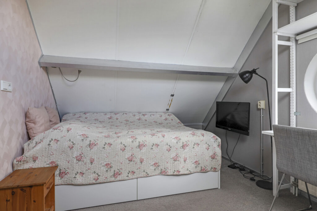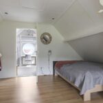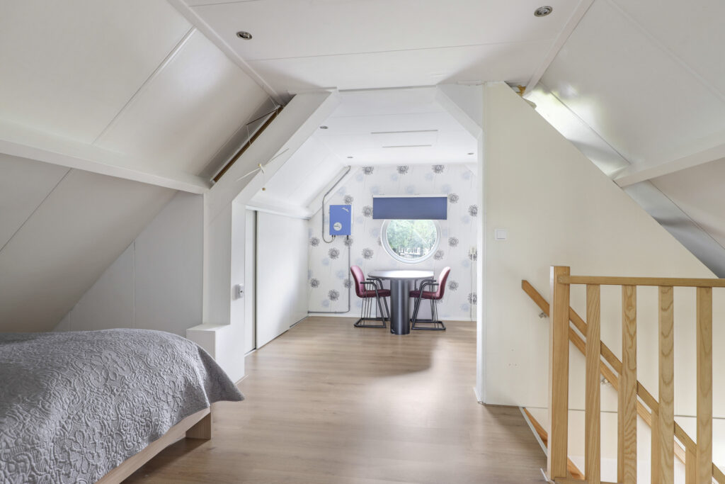 De 2e verdieping is zeer verrassend te noemen, mede door de nokhoogte van 3,3m tref je hier nog een zee van ruimte. Aan de voor- en achterzijde zijn 2 ‘kajuitramen’ geplaatst voor een speels effect. De ruimte is opgedeeld met een 4e slaapkamer welke tevens is voorzien van een groot, extra dakraam. Mocht je het wensen dan kan je hier eenvoudig nog een 5e slaapkamer creëren. Onder de schuine kanten zijn op diverse plekken schuifwanden geplaatst waarachter veel opbergruimte schuilgaat. Op deze woonlaag treffen we tevens de opstelling van de cv-ketel en de omvormer van de zonnepanelen.