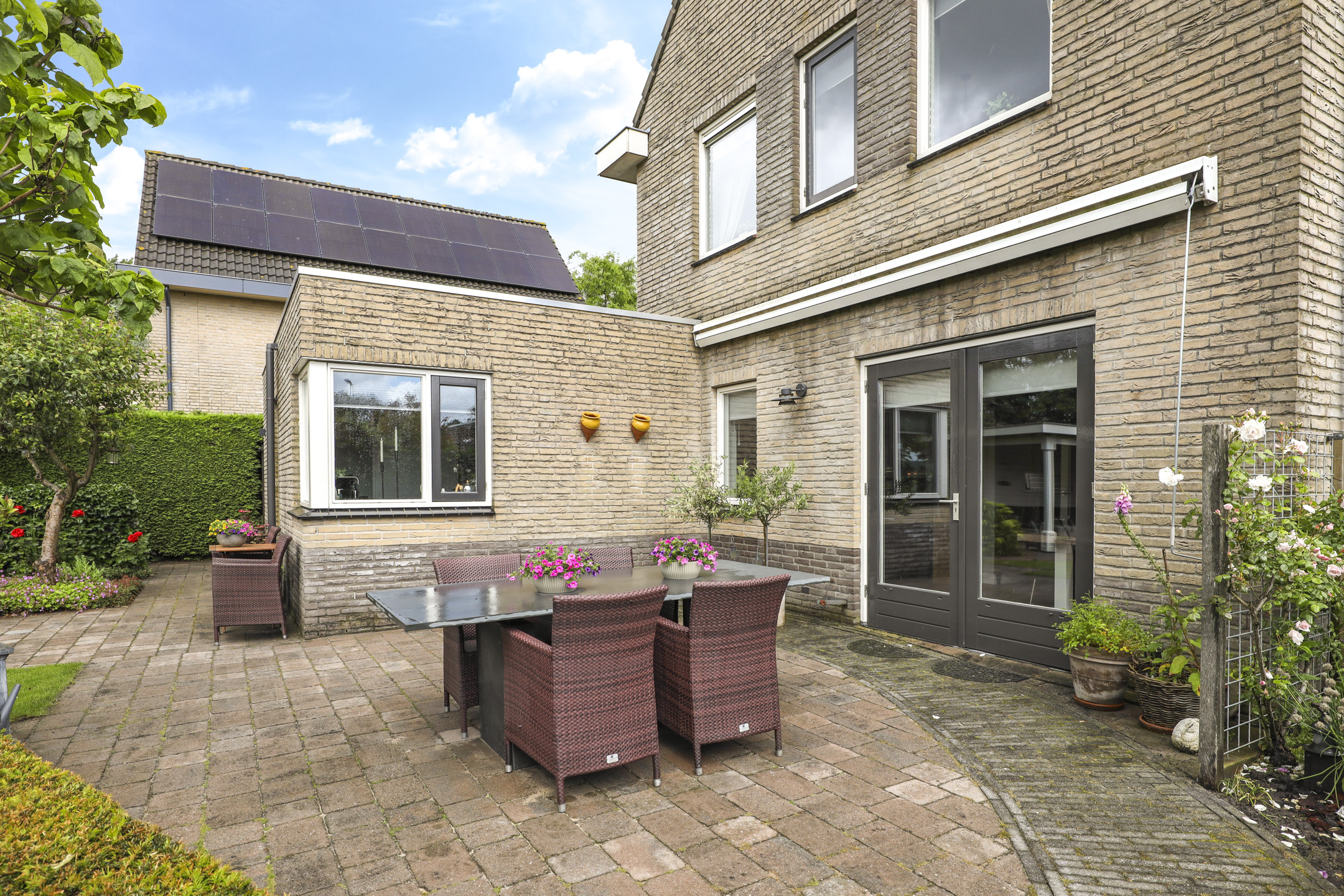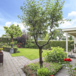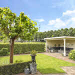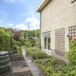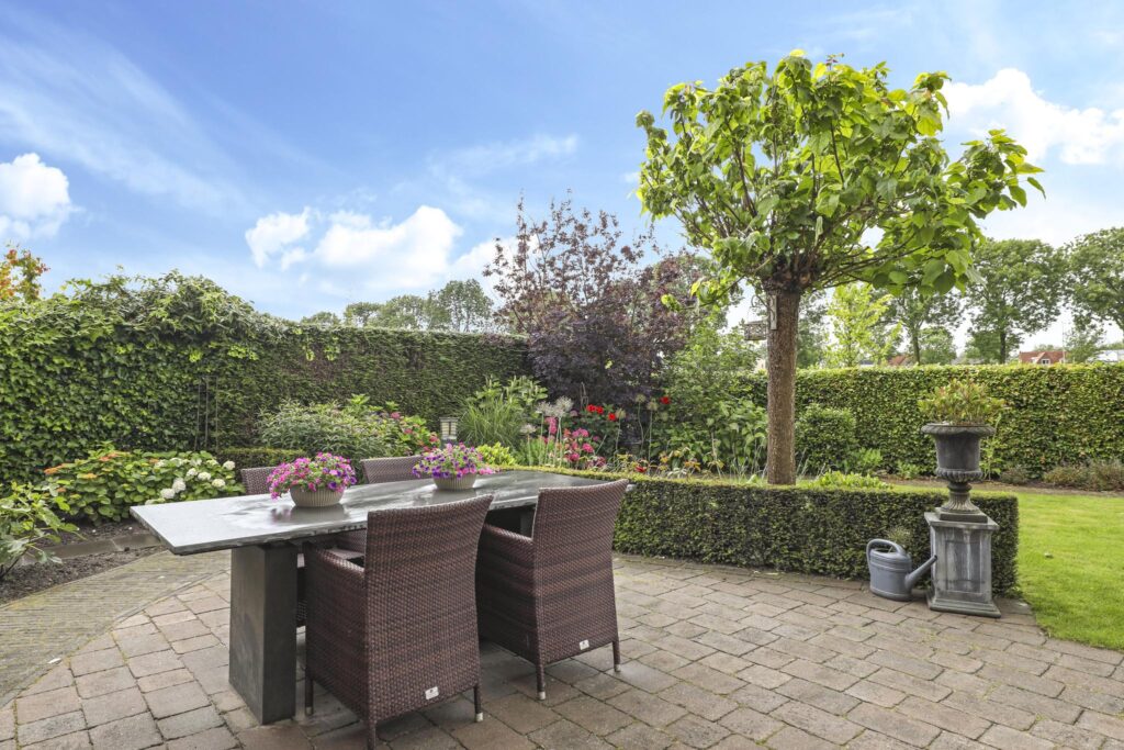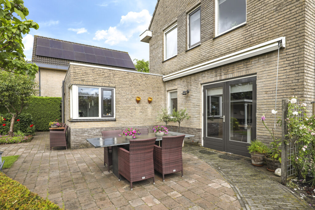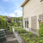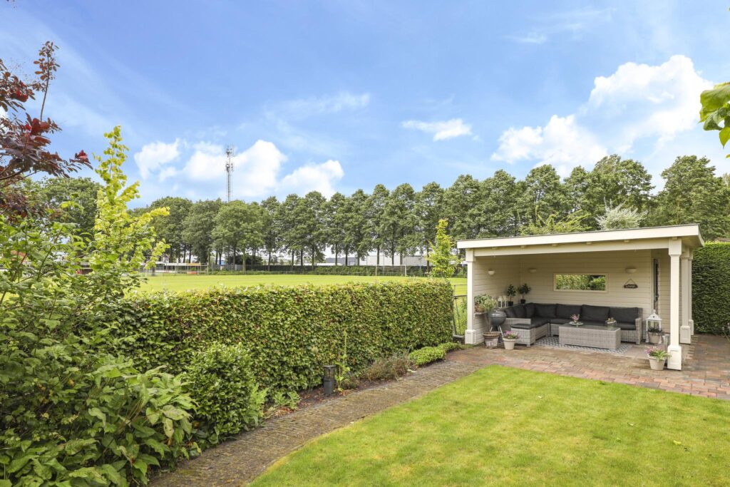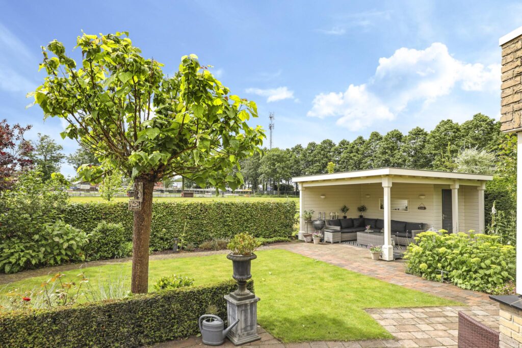 Deze woning is op een royaal perceel van bijna 500m² groot gelegen. Dat wil zeggen dat er rondom de woning flink wat tuin te vinden is. Je kunt hier rondom het huis lopen met aan de rechterkant een pad om met de fiets en container naar de achtergelegen schuur te lopen. De achtertuin loopt schuin weg wat zorgt voor een bijzonder effect. In de diepste hoek is er een bijgebouw geplaatst welke bestaat uit een schuur en een veranda. Onder de veranda kun je een flinke loungebank kwijt. Hier kun je tot laat in de avond lekker buiten zitten. Aan de achtergevel is een terras aanwezig voor nog een zithoek, hier is tevens zonwering geplaatst. De tuin is verder aangelegd met gras en diverse bomen en planten wat zorgt voor een groene, natuurlijke uitstraling. Doordat er achter de tuin geen bebouwing is geniet je hier van veel privacy.